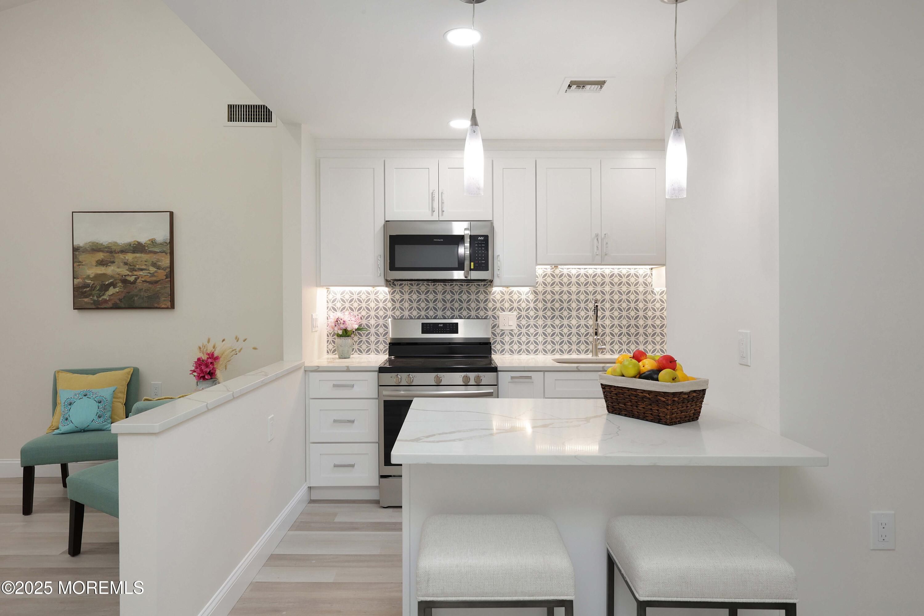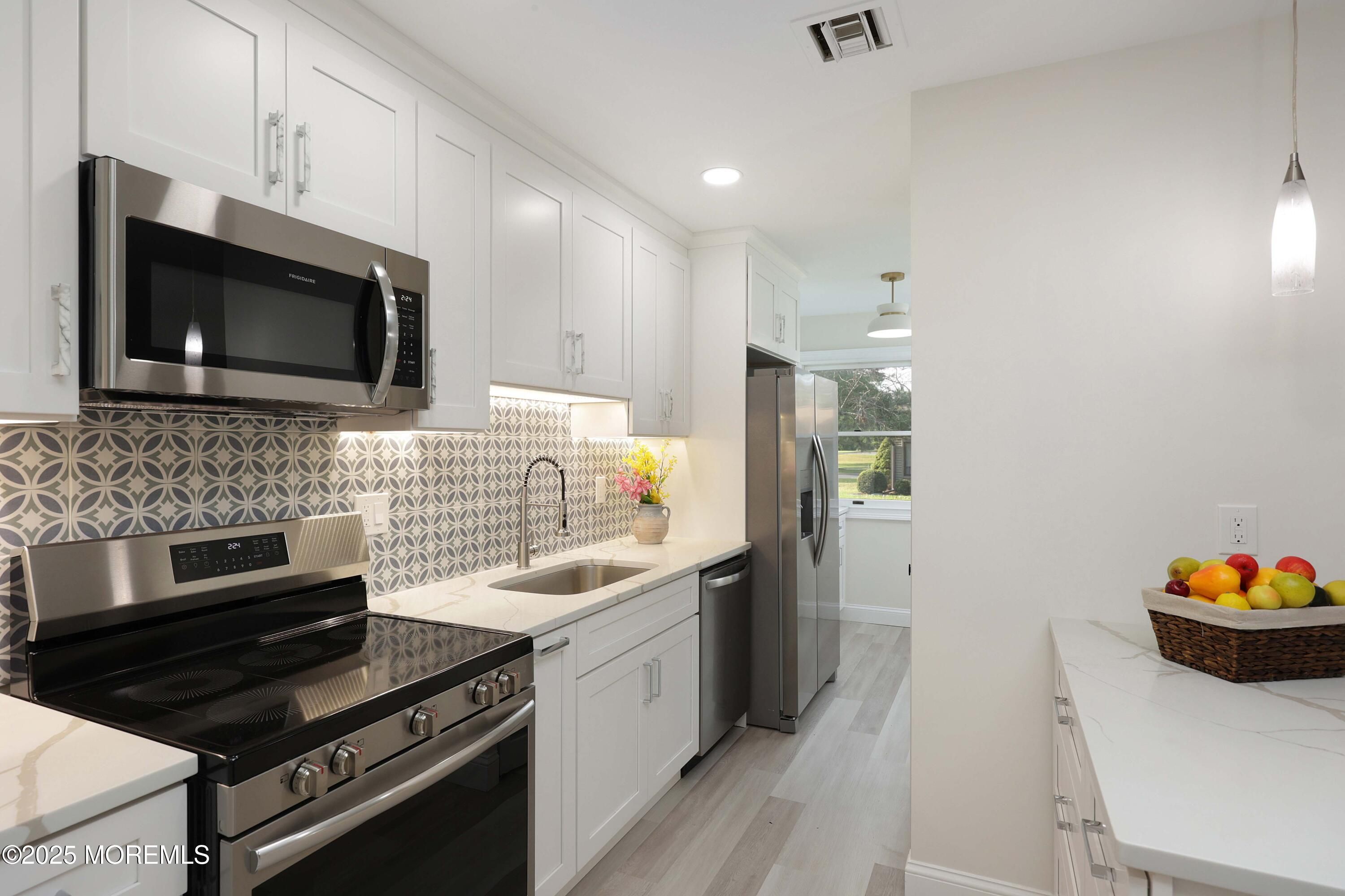 Welcome to 3 Auburn Ct, a stunningly renovated Brenton model ranch in the highly sought-after Shadow Lake Village, an active adult community. This 2-bedroom, 2-bathroom home with a garage offers the feel of new construction, boasting modern upgrades & luxurious finishes throughout. The brand-new kitchen features 36-inch white shaker cabinets with crown molding, quartz countertops, a stainless steel appliance package, a built-in microwave, & under-cabinet custom lighting. The kitchen also includes a convenient stackable washer & dryer. The home is adorned with luxury vinyl flooring & recessed LED lighting, complemented by all-new interior doors, windows, & a new HVAC system. Enjoy the outdoors with two custom-designed paver patios 1 in the front & 1 in the back perfect for relaxing or entertaining. Both bathrooms have been completely redesigned with spa-like custom tile showers, extra storage, & elegant vanities with granite countertops. Shadow Lake Village offers an array of amenities, including a clubhouse, fitness center, swimming pool, 9-hole golf course, & beautifully landscaped grounds. Conveniently located just minutes from Red Bank's shopping, dining, and entertainment options, & with easy access to New York City via train, this home is the perfect blend of luxury & lifestyle. Don't miss this opportunity to live in one of the most desirable communities in the area!