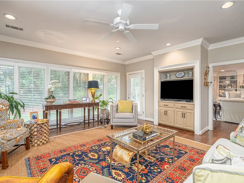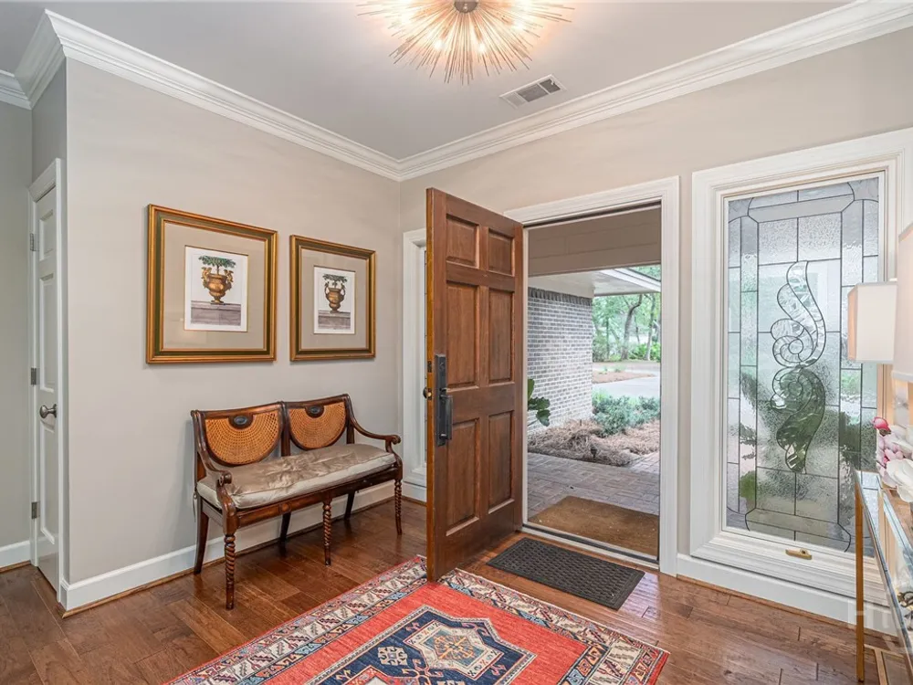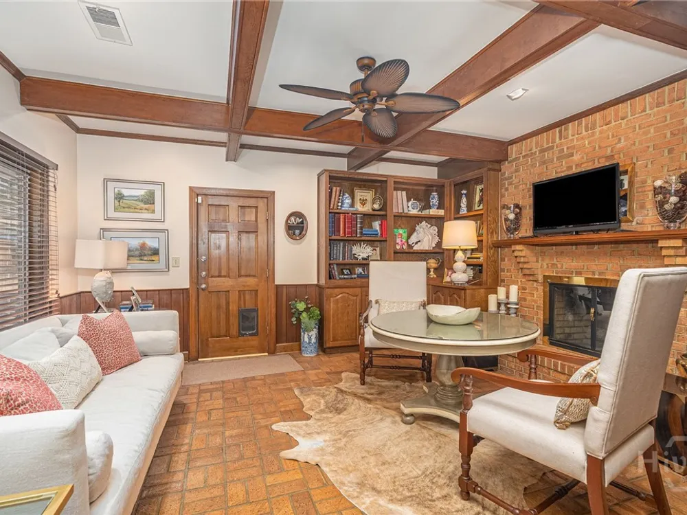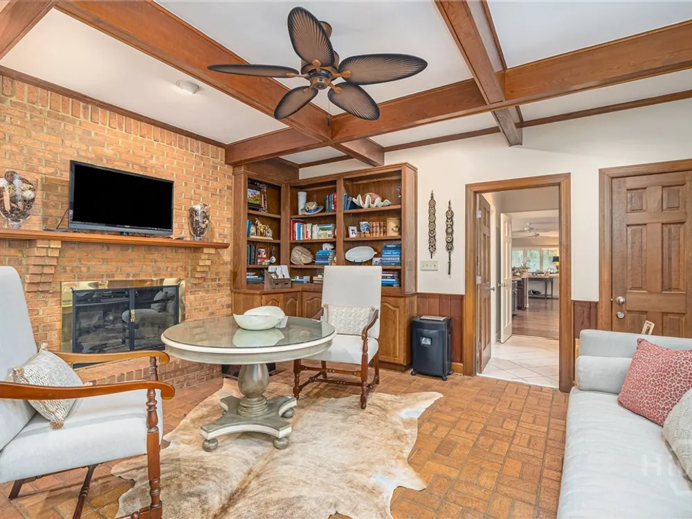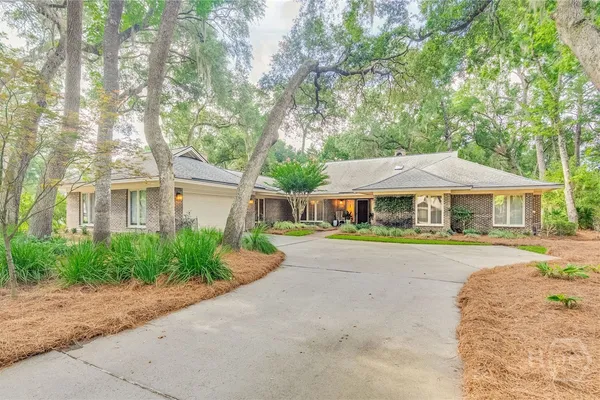 Charming all-brick, one-level ranch-style home featuring spacious rooms, wide hallways, and 9'+ ceilings throughout. The home features a large formal living room with tray ceiling and an elegant dining room. Additionally, the generously sized kitchen boasts rich dark wood cabinetry, granite countertops, and a gas range, opening to the breakfast area and expansive den—perfect for entertaining. A separate office/den showcases brick floors, custom bookshelves, and a cozy brick fireplace. Two guest bedrooms share a well-appointed hall bath. The primary suite offers an updated bath and a walk-in closet with built-ins. A walk-up, spray-foamed attic provides potential for additional living space—ideal for a bonus room or more bedrooms. Thoughtfully updated since construction, this home blends timeless character with modern touches. Located in desirable Palmetto phase of The Landings.