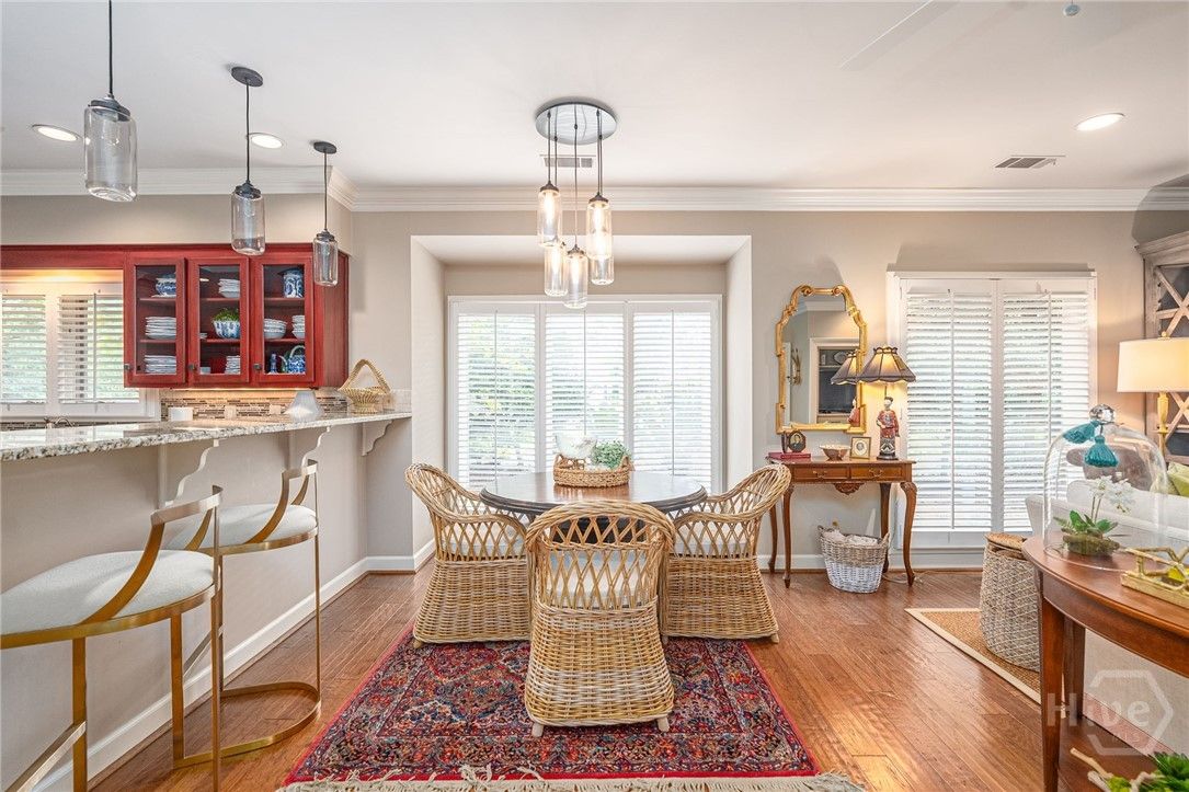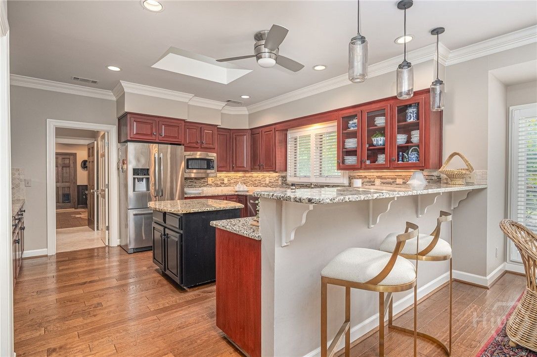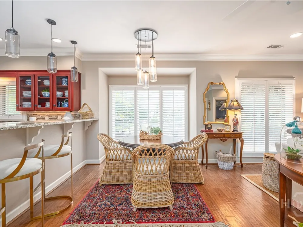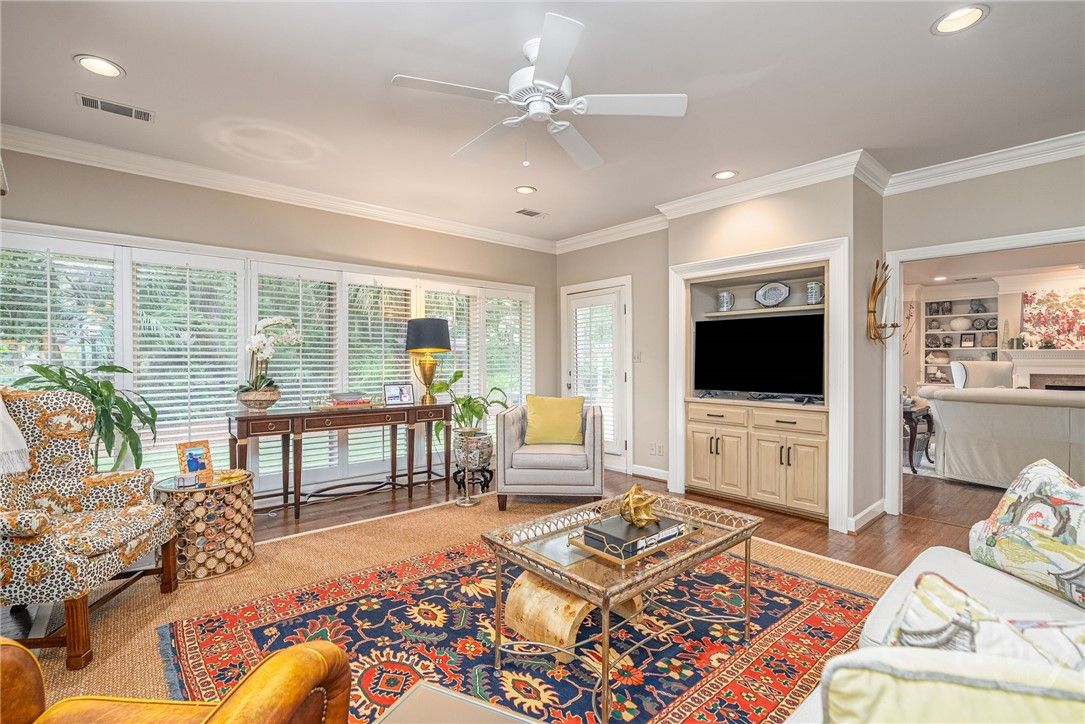 Charming all-brick, one-level ranch-style home featuring spacious rooms, wide hallways, and 9'+ ceilings throughout. The home features a large formal living room with tray ceiling and an elegant dining room. Additionally, the generously sized kitchen boasts rich dark wood cabinetry, granite countertops, and a gas range, opening to the breakfast area and expansive den—perfect for entertaining. A separate office/den showcases brick floors, custom bookshelves, and a cozy brick fireplace. Two guest bedrooms share a well-appointed hall bath. The primary suite offers an updated bath and a walk-in closet with built-ins. A walk-up, spray-foamed attic provides potential for additional living space—ideal for a bonus room or more bedrooms. Thoughtfully updated since construction, this home blends timeless character with modern touches. Located in desirable Palmetto phase of The Landings.