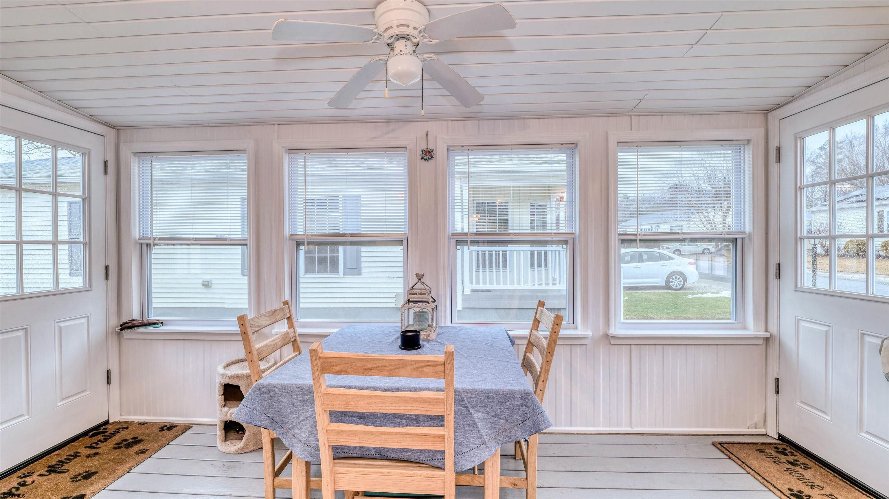 Experience effortless living in this stunning model home, bathed in natural light from expansive windows throughout. The heart of the home is a chef-inspired kitchen featuring a large social island—the perfect centerpiece for entertaining friends and family. The Primary Suite and spacious second bedroom both offer generous closet storage, while the dedicated utility room comes move-in ready with a brand-new washer and dryer. The newly rebuilt 3-season porch (2024) expand your living space and is the perfect private sanctuary for morning coffee or evening unwinding. You will also be able to rest easy knowing both the home and the shed feature a brand-new roof and underwent a green life update ensuring maximum energy efficiency. Located in a meticulously maintained 55+ neighborhood, you are just a short stroll away from the community clubhouse. There, you can take advantage of wellness classes, the library, and other social activities. Relax by the pool, hit the pickleball courts, use the billiard room, or enjoy the fitness center at your leisure. With pristine, sidewalk-lined streets perfect for morning exercise or walking the dog, this home offers the perfect blend of comfort and activity.