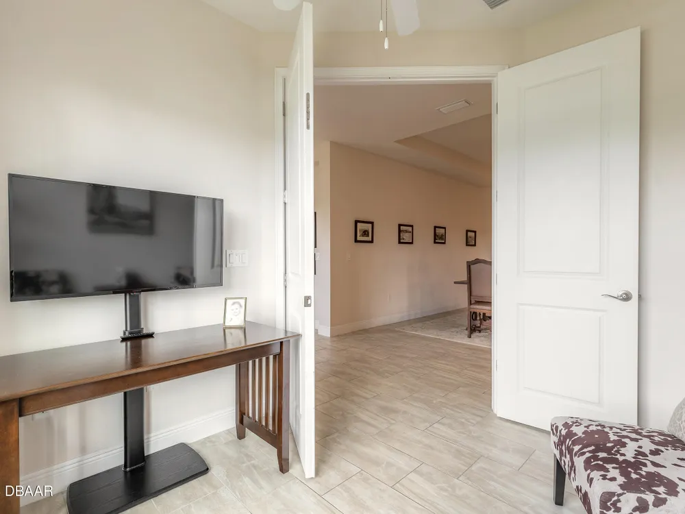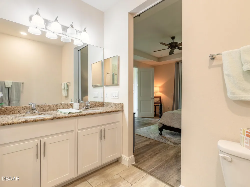 Move-in ready and beautifully furnished 2-bedroom villa with flex room/office in the sought-after 55+ Huntington Village at Hunters Ridge. This light-filled home features elegant tile floors, tray ceilings, and an open layout ideal for entertaining. The gourmet kitchen boasts 42'' cabinets, granite counters, and stainless steel appliances. The spacious primary suite offers a custom walk-in closet, dual vanities, and a walk-in shower. Enjoy peaceful views of the wooded preserve and pond from your screened lanai. Additional highlights include a 2-car garage, brick paver drive, and energy-efficient design. HOA covers TV, internet, lawn care, exterior paint, roof, pest control, 3 pools, clubhouse, fitness center, and tennis/pickleball—maintenance-free living at its best! (Furnishings included)
