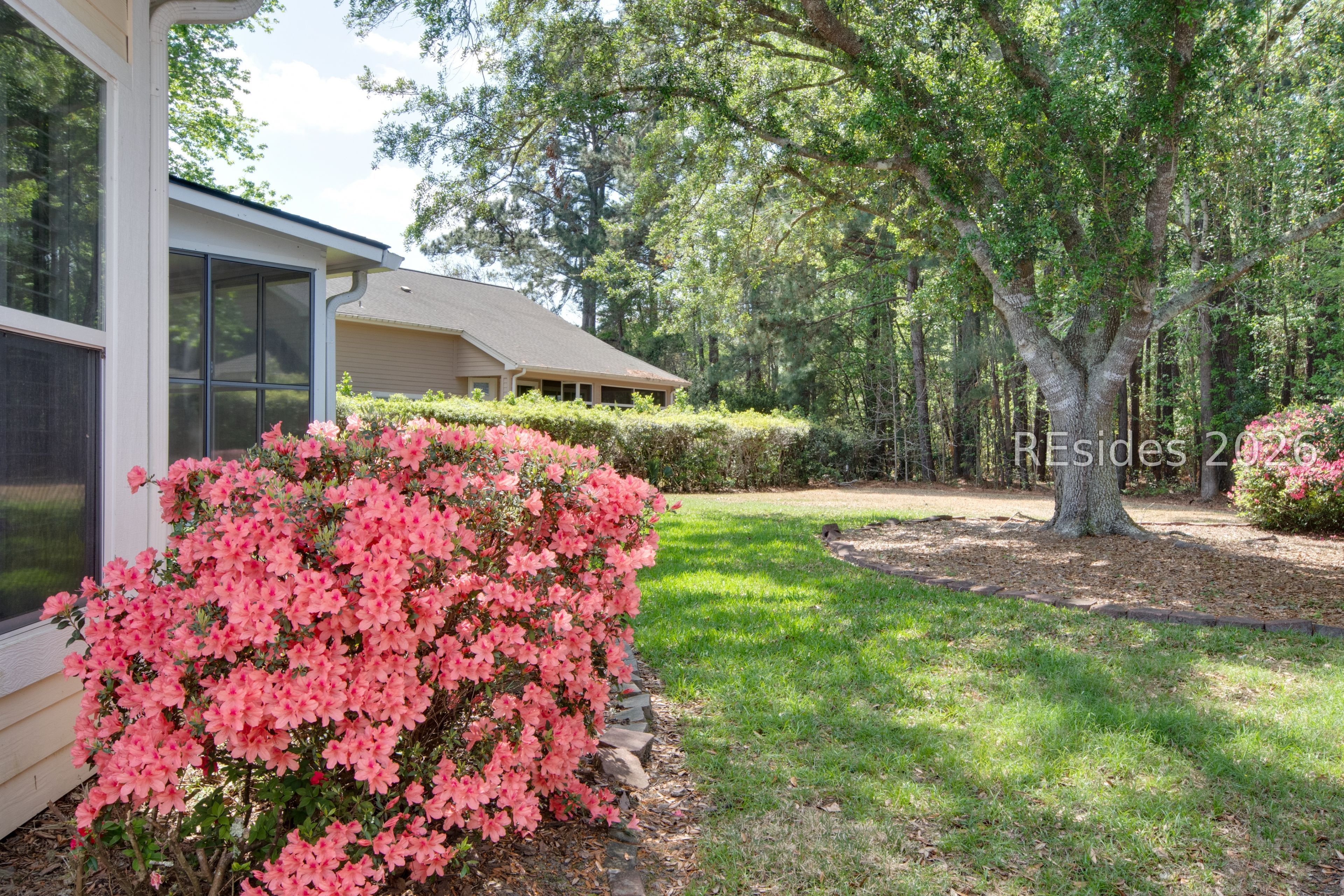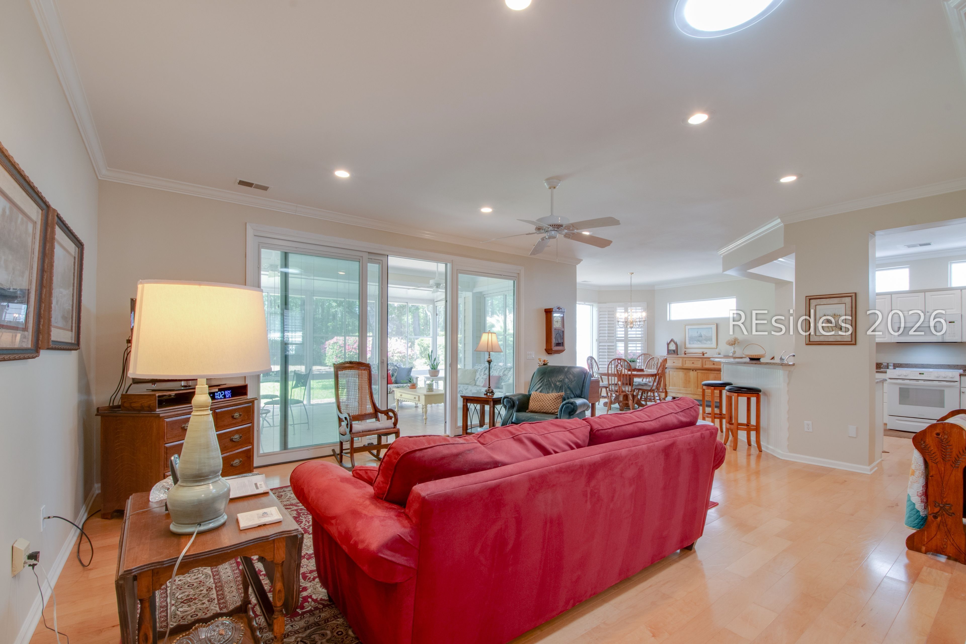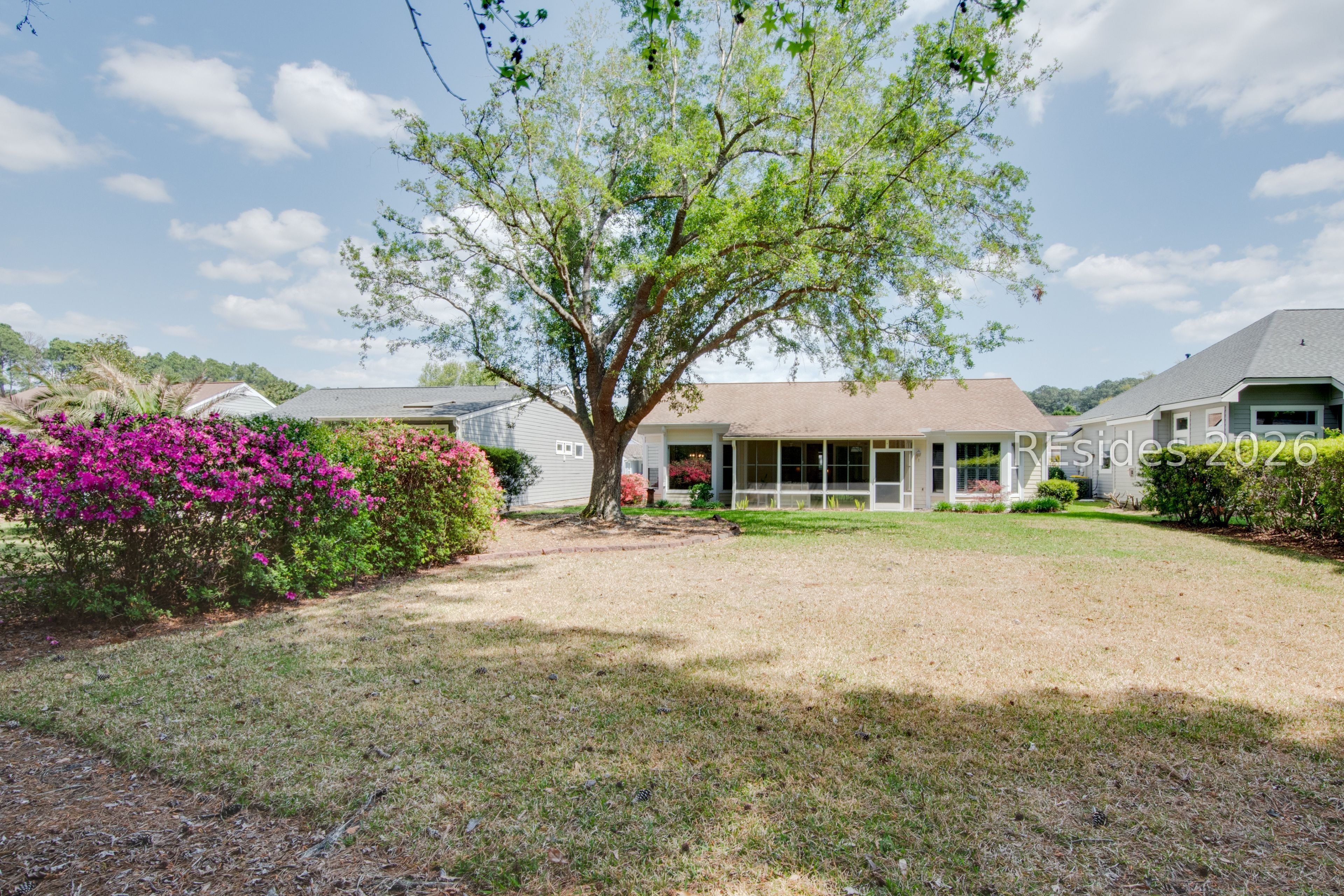 Beautiful Del Webb home with Hardiplank siding, ideally situated near the Lake Somerset area in Sun City Hilton Head. This floor plan was one of Del Webb more popular plans. The inviting Great Room features an 8-foot slider that opens to an extended enclosed porch, perfect for relaxing or entertaining. A charming dining area with a bay window flows into the light-filled kitchen, highlighted by clerestory windows, granite countertops, breakfast bar, and pantry. The primary suite offers a bay window, private access to the porch, a large walk-in closet, and an updated bath with a walk-in shower. A guest bedroom with bay window and adjoining bath provides comfort for visitors, while the den with solid doors offers flexibility as a home office or additional sleeping space. Enjoy the expanded enclosed porch with vinyl windows and screens, overlooking a deep, private backyard with a peaceful wooded backdrop. Additional features wood and tile flooring throughout, a laundry room and a two-car garage, brick paver walkway and driveway. Ideally located within the community, you're just a short walk to Lake Somerset, Town Square, Okatie Creek Clubhouse, and the scenic 3-mile walking trail - offering the best of Lowcountry living right outside your door.