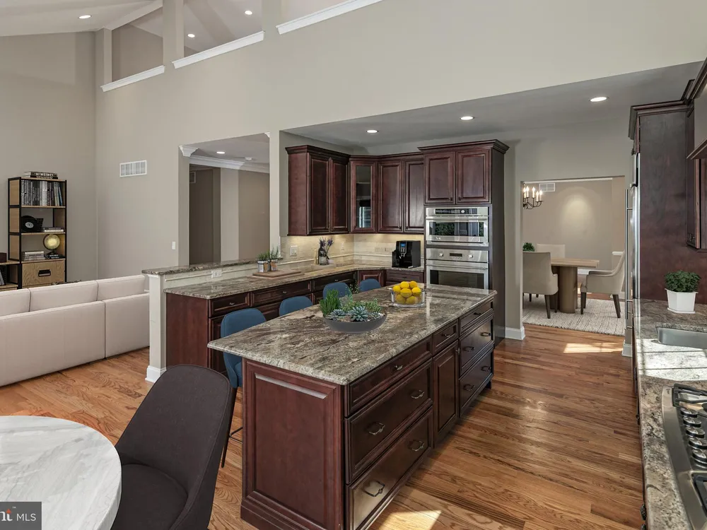 Set in the beautifully designed 55+ Tapestry community, this smartly modified Sovereign model enjoys a premium lot and close proximity to the exciting new shops and restaurants of Montgomery Promenade. The pristinely maintained interior features high ceilings with deep crown molding, gleaming hardwood floors and custom Hunter Douglas blinds, all enhanced by a warm, inviting color palette. A row of skylights within a vaulted ceiling brighten up the open family room, featuring a gas fireplace, and the adjoining kitchen, well-appointed with granite countertops and GE Monogram appliances. The formal dining room with a sunny bay has room for big holiday meals. An office presents flexibility for work, hobbies or a secondary first floor bedroom, while the spacious primary suite offers two walk-in closets and a bathroom with a generous granite-topped vanity and oversized shower with a bench. Upstairs, a large loft stands outside two comfortable bedrooms, each with its own neutral full bath. An enormous basement provides excellent storage and potential for a future home gym. Impeccably cared for and move-in ready, this home combines comfort, space, and style in one of the area’s most vibrant active adult communities. Some photos have been virtually staged.