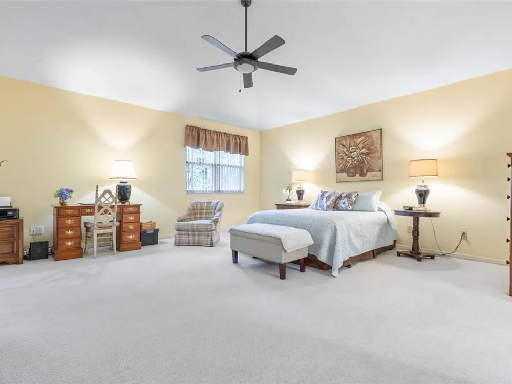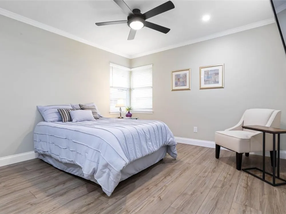 - Ceiling Fan(s), Crown Molding, Living/Dining Room, Open Floorplan, Main Level Primary, Solid Surface Counters