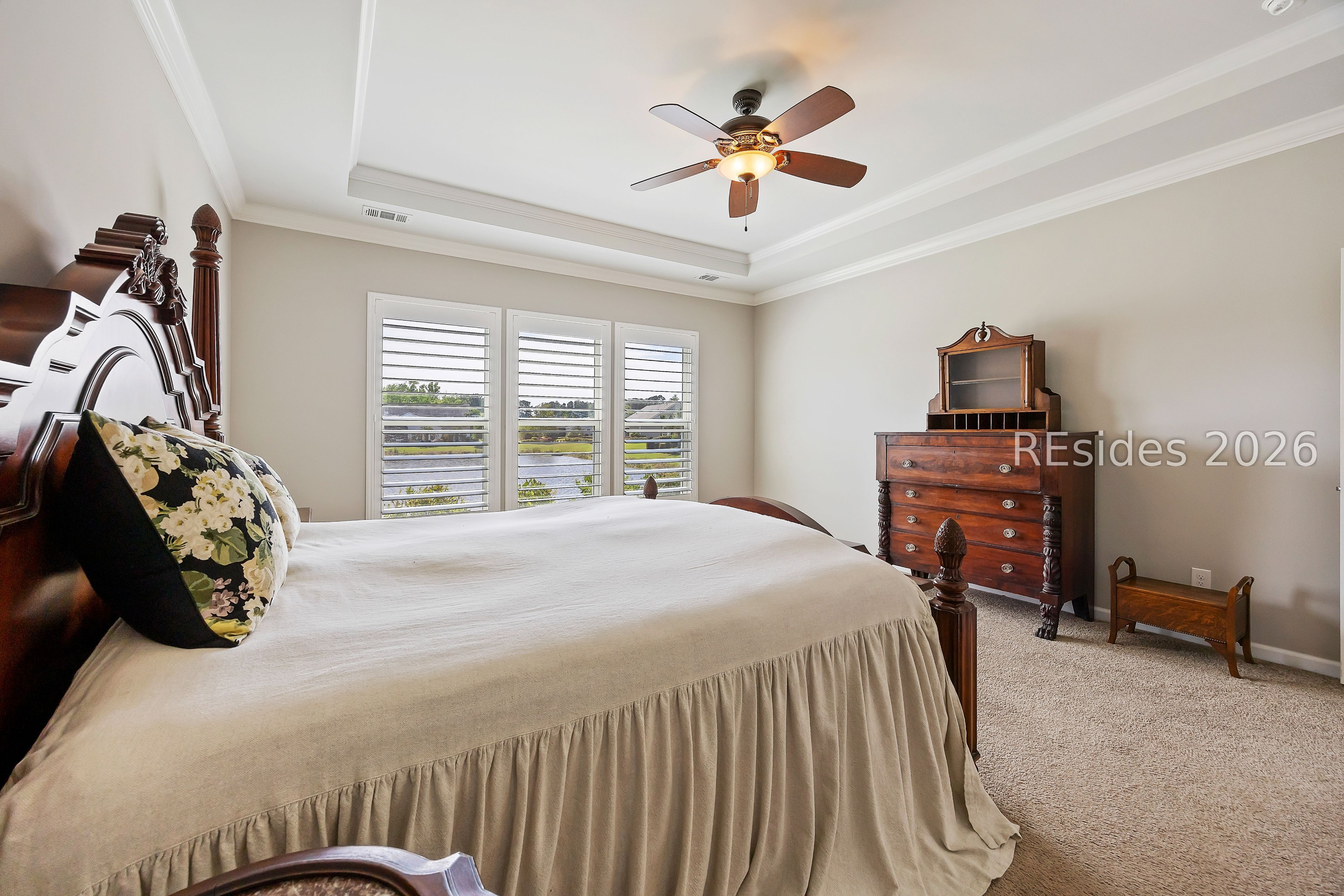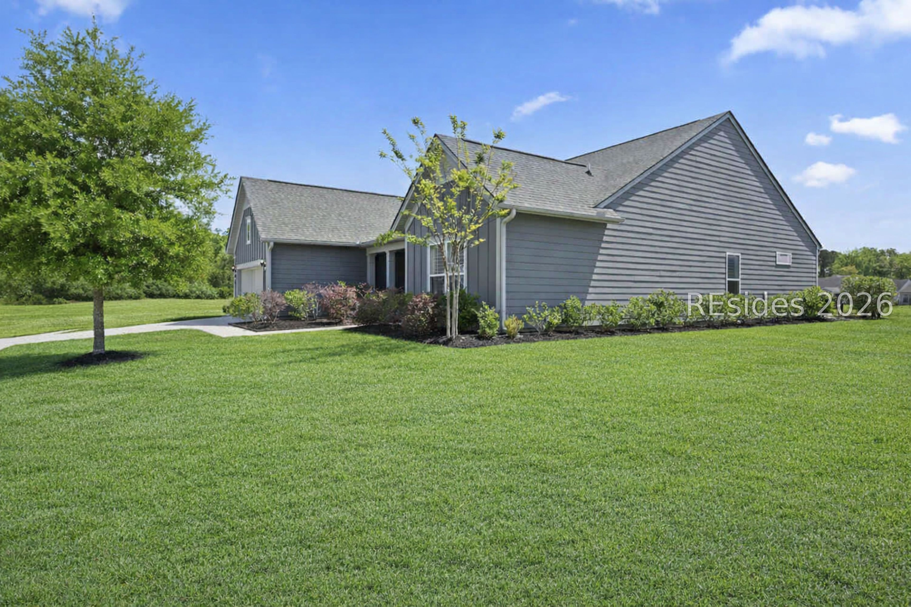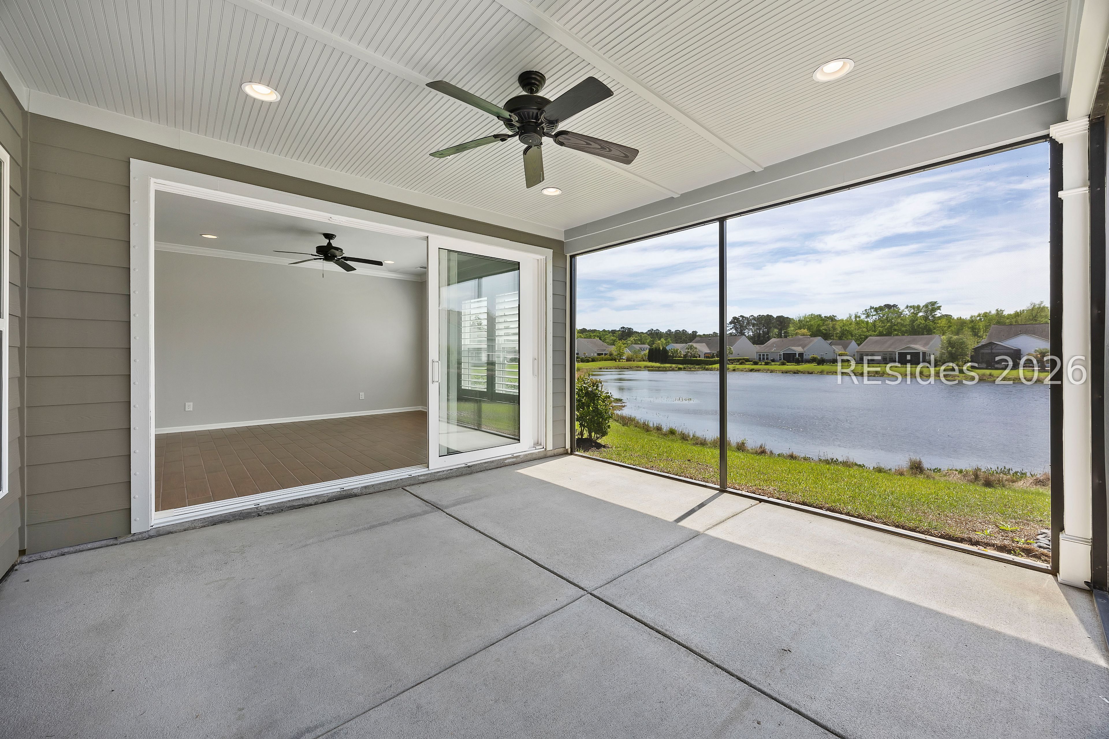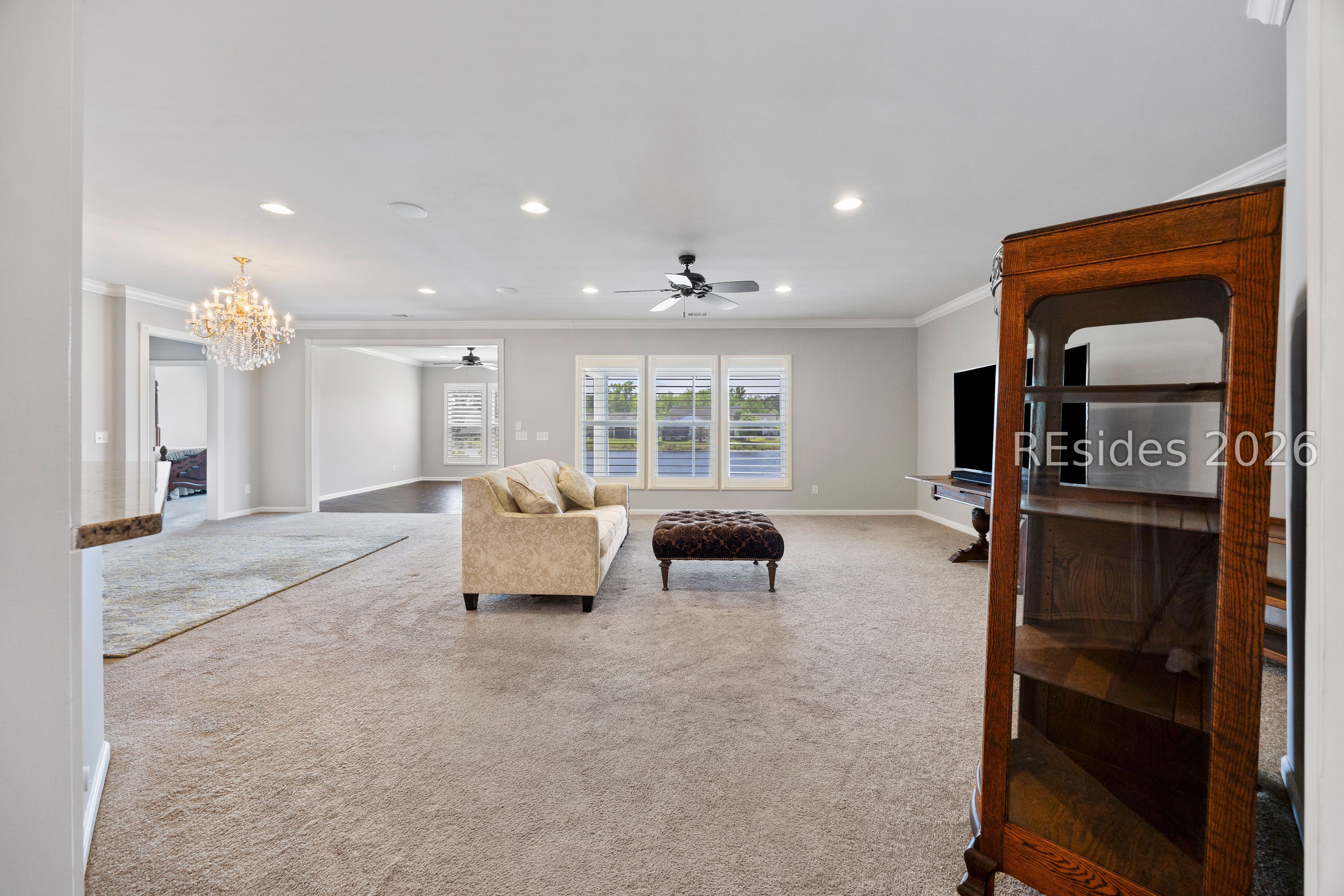 Don't miss out on this Rare South-facing full lagoon view Tangerly Oak model in The Haven at New Riverside, Bluffton's 55+ community. This beautifully upgraded single-story home, has 2,700+ square ft, features 3 bedrooms, 2 and a half baths, smooth ceilings, spacious open floorpan with $75,000 in upgrades. Enjoy a gorgeous lagoon view even from front door. gracious entry provides ample room. Attractive batten/board, Hardie plank ext siding along with brick accents & front porch, new interior and exterior paint, fresh landscaping, plantation shutters throughout, custom crown moulding, attractive wood grain plank tile flooring. A gourmet updated kitchen in this single level home boasts granite ctops, custom walk-in pantry, black Whirlpool appliances, new dishwasher, 6-burner gas cooktop, a porcelain farmhouse sink w/water view from kit. The kit has large island with seating, breakfast bar and upgraded cabinetry w/pull out shelving and soft close drawers/doors. This open floorplan of one level living also features a bright, light filled Sun Room/Carolina Room with tri-fold sliding doors opening to a screen lanai/screen porch & separate patio overlooking lagoon.The trifold sliding doors are great for entertaining making the Screen Porch & Sun Room seem like one open sun drenched space to enjoy your Outdoor Retreat. The primary suite offers a beautiful lagoon view, tray ceiling, luxurious tiled rain shower, custom walk-in closet w/direct pass-thru to laundry rm for convenience. The 4' extended garage w/added storage for a golf cart or workshop, includes a walk-up attic and Lifestyle garage screen. Off the garage is a spacious drop zone for convenience and storage. This is the perfect gated community for the active adult lifestyle and popular retirement community, The Haven at New Riverside allows you to enjoy resort-style amenities including a Jr. Olympic pool, jacuzzi, newly remodeled Club House, fitness center, 4 Har-tru lighted tennis courts, Pickleball, Dog park, miles of walking & biking trails, garden plots, playground and social clubs. Located near Old Town Bluffton, Hilton Head Island, Savannah, Beaufort, shopping, dining. Added features: whole home security system including smoke detection/alarms keeping your home safe while you are away; sound system wiring; drip watering system on most landscaping; and Ring doorbell w/additional camera keeps you informed of visitors & when important deliveries arrive. Low HOA & property taxes!! Don't miss out!