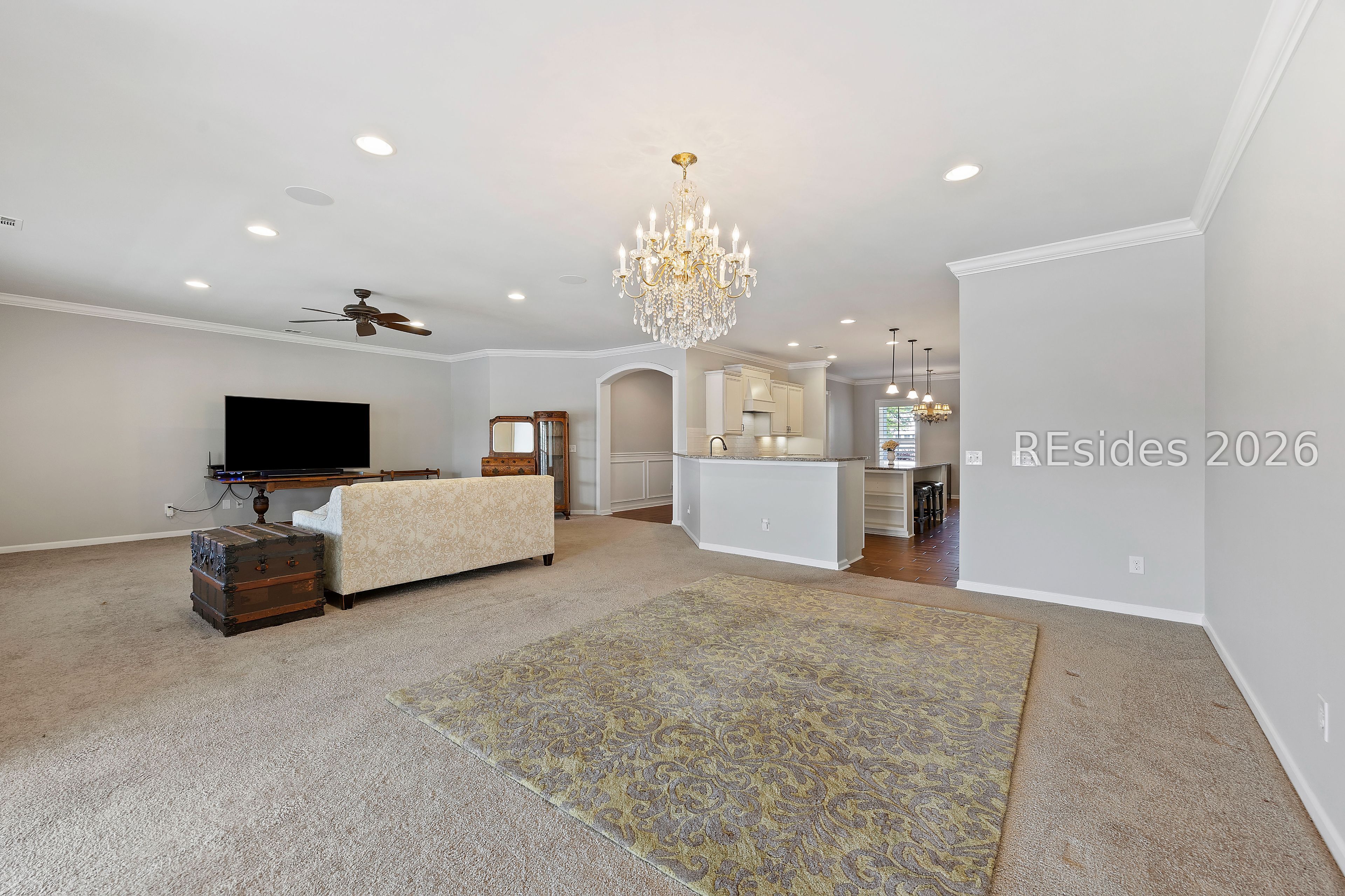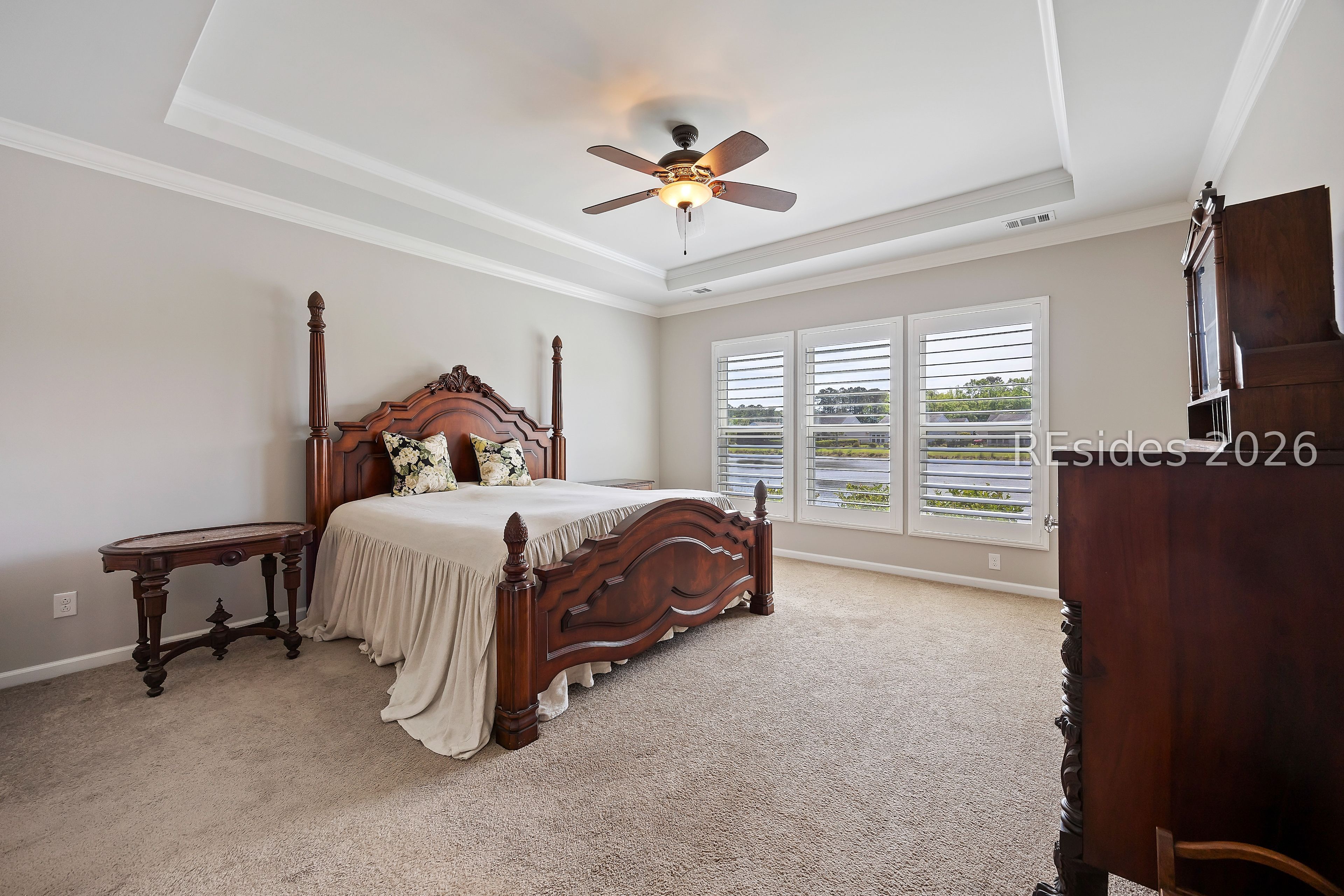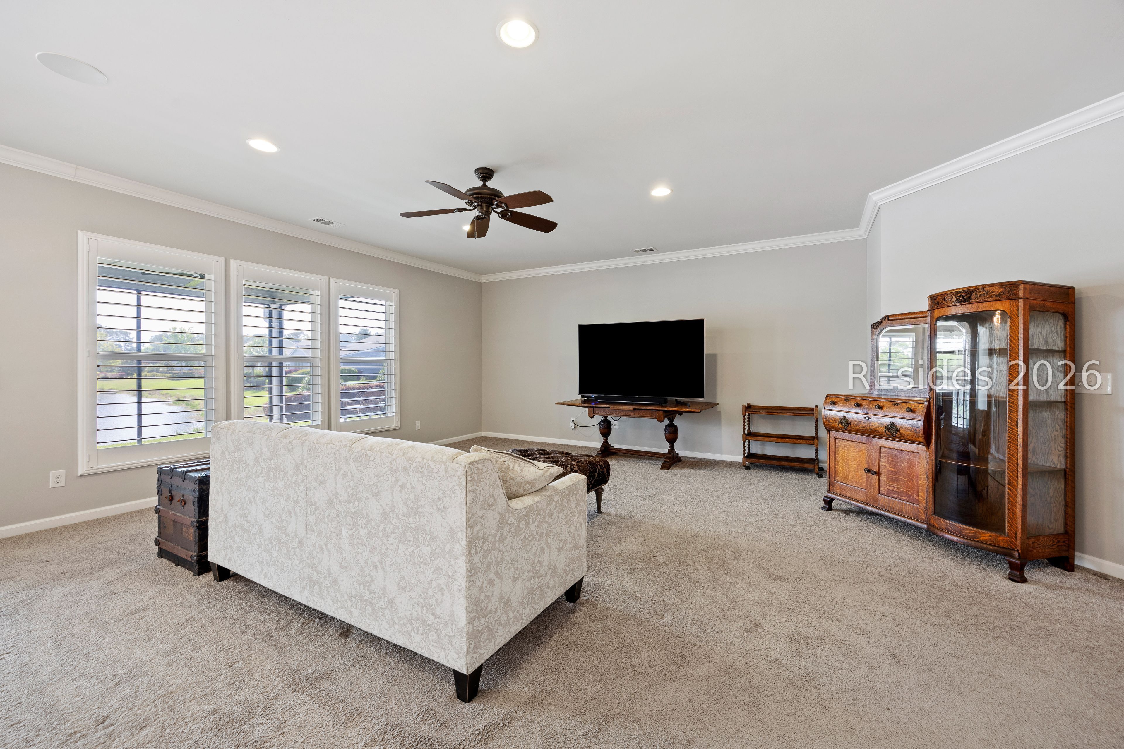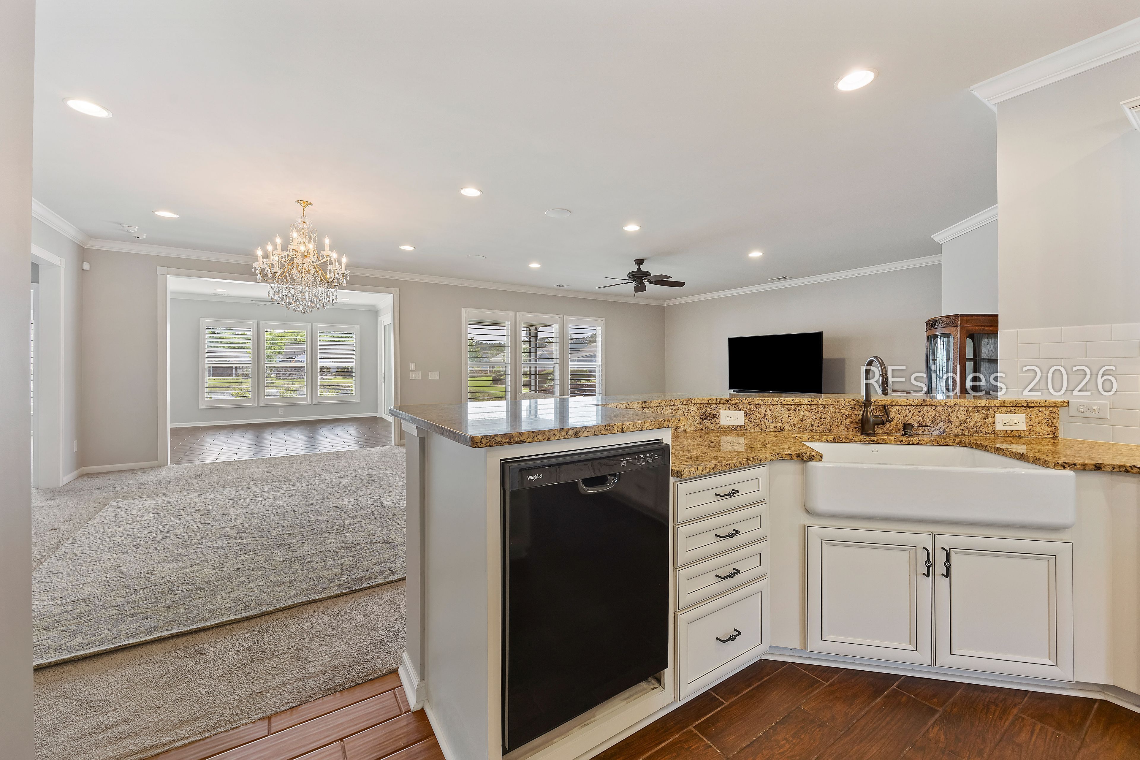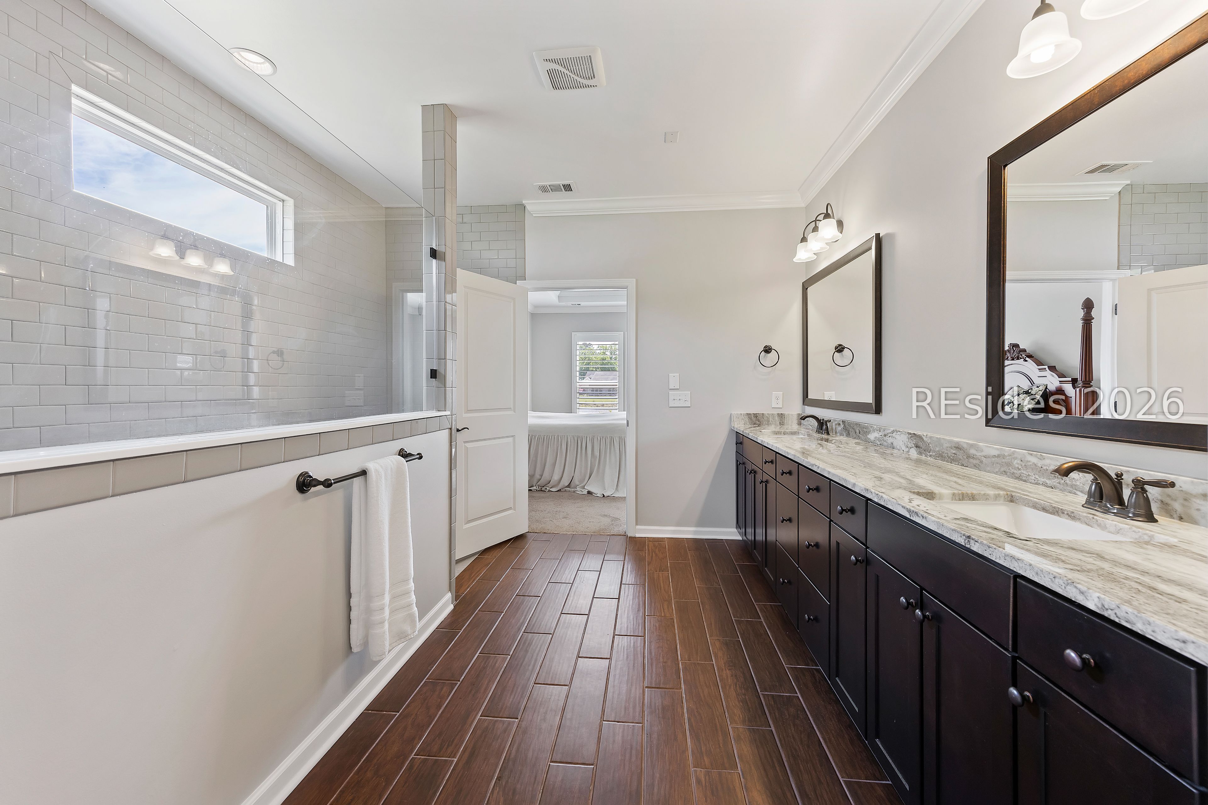 Don't miss out on this Rare South-facing full lagoon view Tangerly Oak model in The Haven at New Riverside, Bluffton's 55+ community. This beautifully upgraded single-story home, has 2,700+ square ft, features 3 bedrooms, 2 and a half baths, smooth ceilings, spacious open floorpan with $75,000 in upgrades. Enjoy a gorgeous lagoon view even from front door. gracious entry provides ample room. Attractive batten/board, Hardie plank ext siding along with brick accents & front porch, new interior and exterior paint, fresh landscaping, plantation shutters throughout, custom crown moulding, attractive wood grain plank tile flooring. A gourmet updated kitchen in this single level home boasts granite ctops, custom walk-in pantry, black Whirlpool appliances, new dishwasher, 6-burner gas cooktop, a porcelain farmhouse sink w/water view from kit. The kit has large island with seating, breakfast bar and upgraded cabinetry w/pull out shelving and soft close drawers/doors. This open floorplan of one level living also features a bright, light filled Sun Room/Carolina Room with tri-fold sliding doors opening to a screen lanai/screen porch & separate patio overlooking lagoon.The trifold sliding doors are great for entertaining making the Screen Porch & Sun Room seem like one open sun drenched space to enjoy your Outdoor Retreat. The primary suite offers a beautiful lagoon view, tray ceiling, luxurious tiled rain shower, custom walk-in closet w/direct pass-thru to laundry rm for convenience. The 4' extended garage w/added storage for a golf cart or workshop, includes a walk-up attic and Lifestyle garage screen. Off the garage is a spacious drop zone for convenience and storage. This is the perfect gated community for the active adult lifestyle and popular retirement community, The Haven at New Riverside allows you to enjoy resort-style amenities including a Jr. Olympic pool, jacuzzi, newly remodeled Club House, fitness center, 4 Har-tru lighted tennis courts, Pickleball, Dog park, miles of walking & biking trails, garden plots, playground and social clubs. Located near Old Town Bluffton, Hilton Head Island, Savannah, Beaufort, shopping, dining. Added features: whole home security system including smoke detection/alarms keeping your home safe while you are away; sound system wiring; drip watering system on most landscaping; and Ring doorbell w/additional camera keeps you informed of visitors & when important deliveries arrive. Low HOA & property taxes!! Don't miss out!