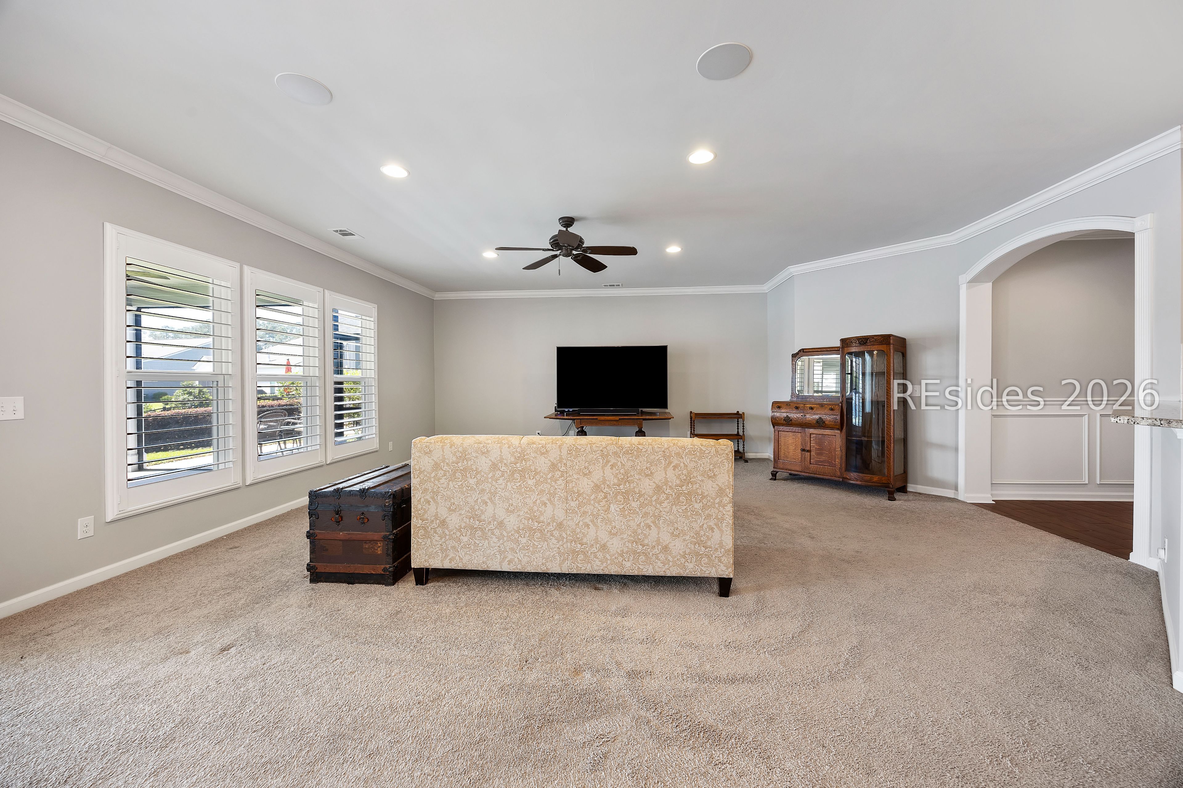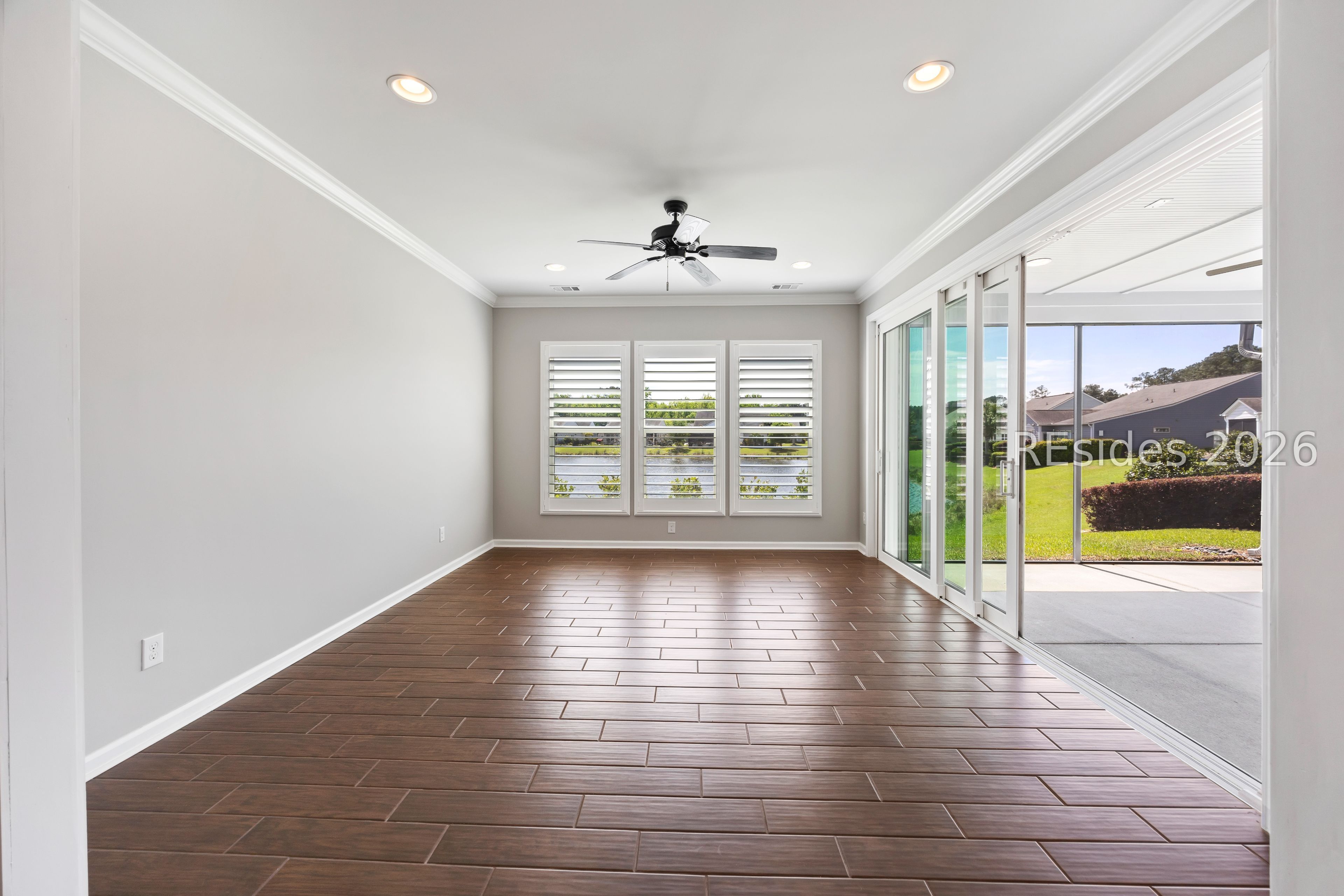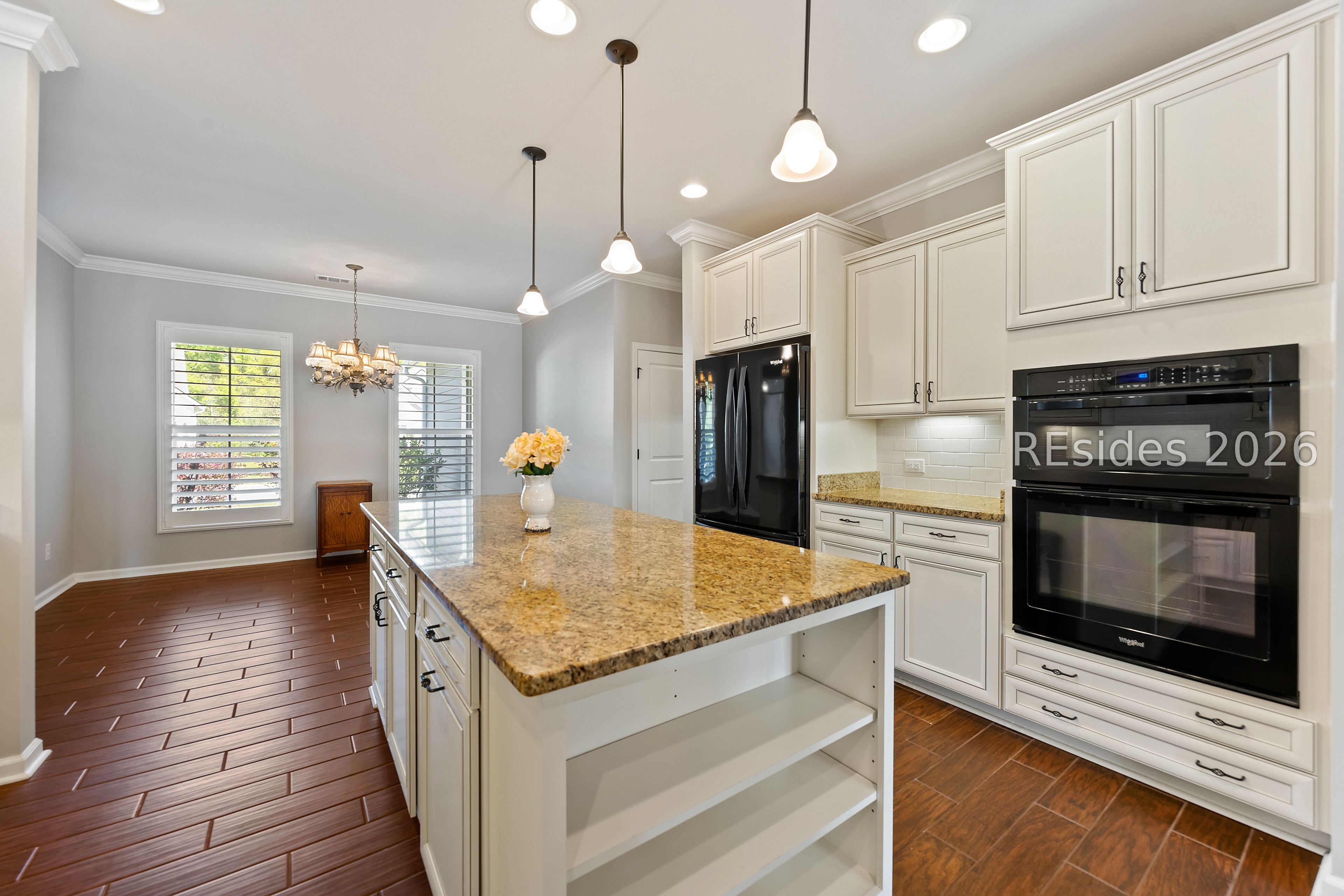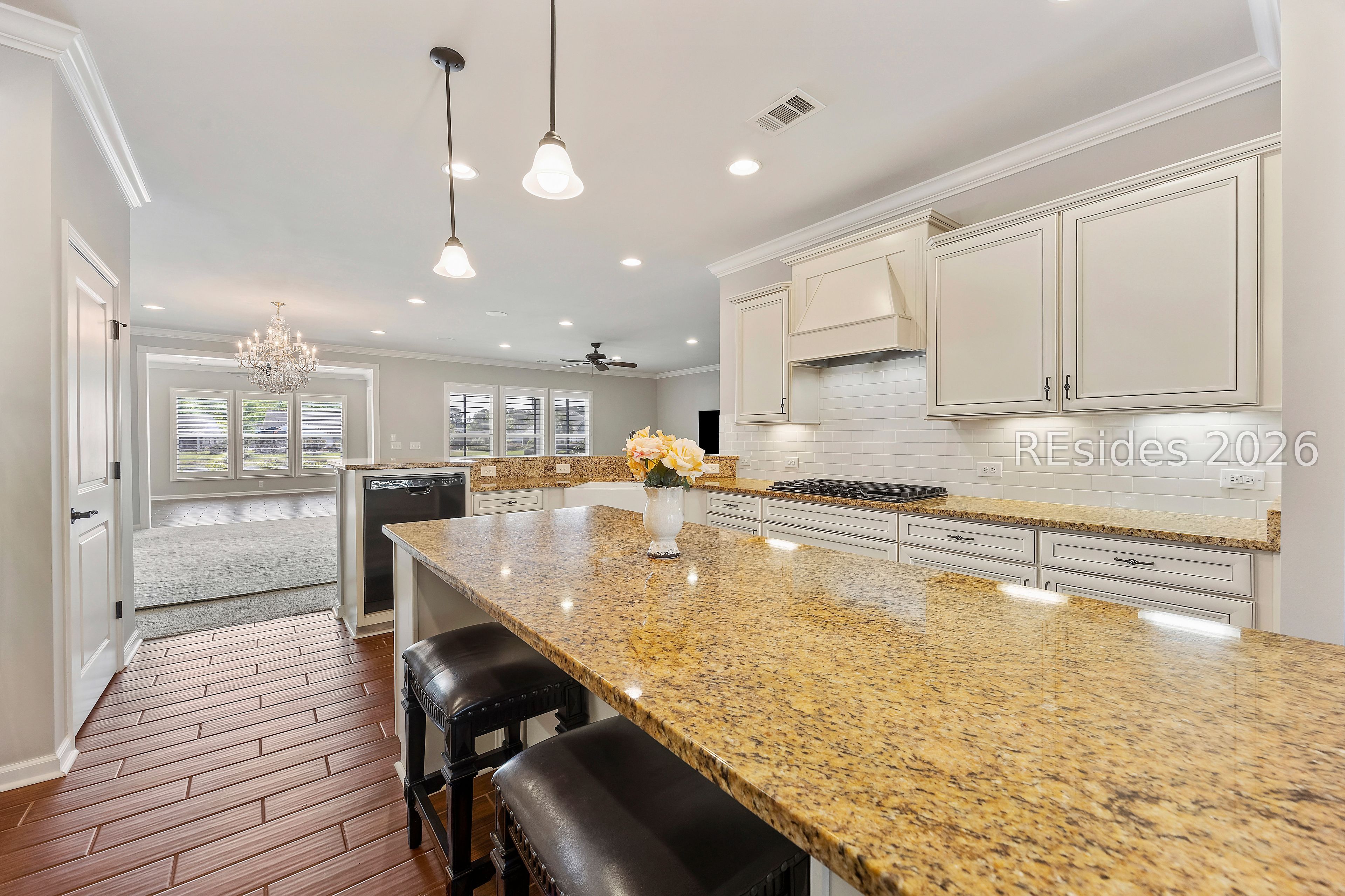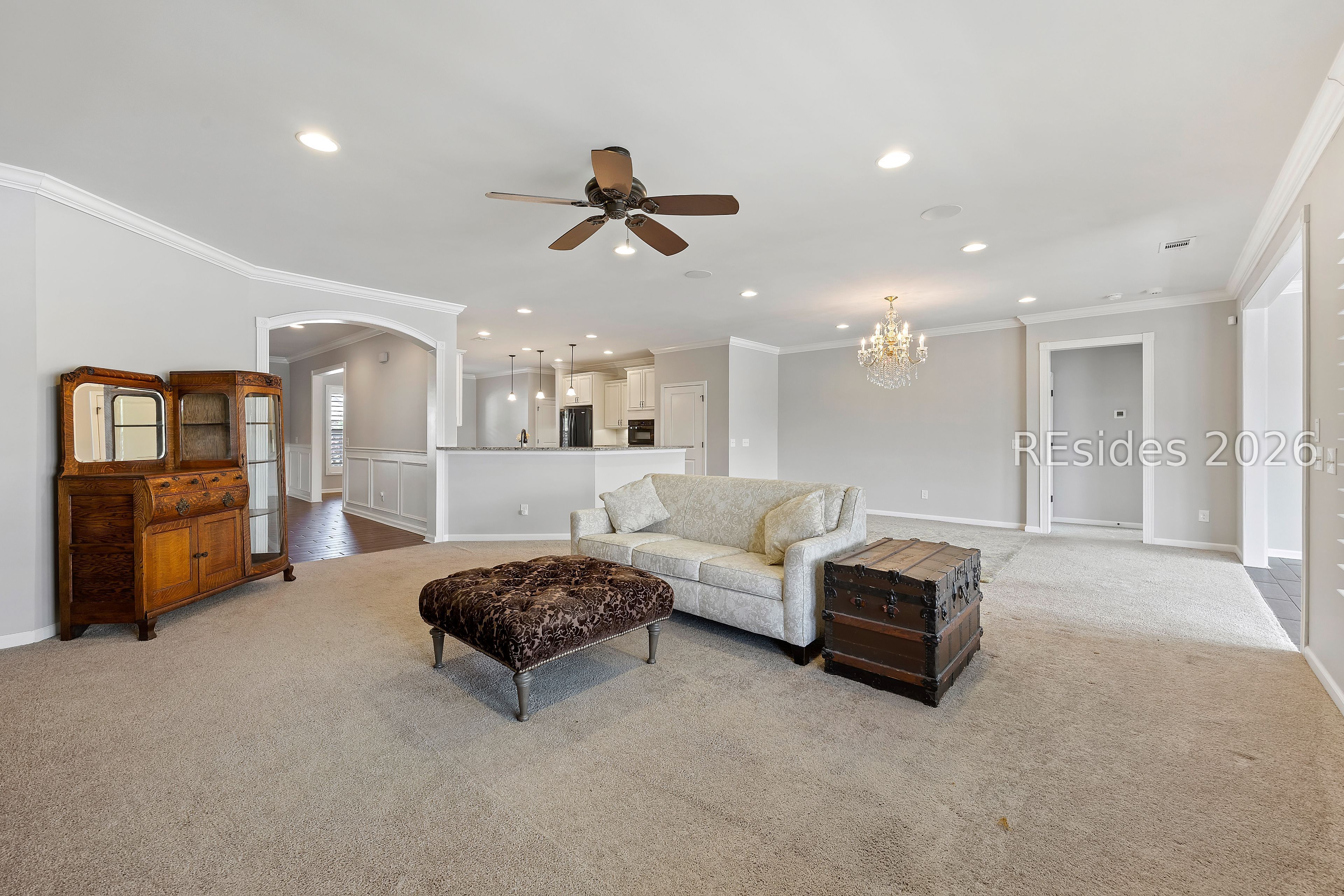Don't miss out on this Rare South-facing full lagoon view Tangerly Oak model in The Haven at New Riverside, Bluffton's 55+ community. This beautifully upgraded single-story home, has 2,700+ square ft, features 3 bedrooms, 2 and a half baths, smooth ceilings, spacious open floorpan with $75,000 in upgrades. Enjoy a gorgeous lagoon view even from front door. gracious entry provides ample room. Attractive batten/board, Hardie plank ext siding along with brick accents & front porch, new interior and exterior paint, fresh landscaping, plantation shutters throughout, custom crown moulding, attractive wood grain plank tile flooring. A gourmet updated kitchen in this single level home boasts granite ctops, custom walk-in pantry, black Whirlpool appliances, new dishwasher, 6-burner gas cooktop, a porcelain farmhouse sink w/water view from kit. The kit has large island with seating, breakfast bar and upgraded cabinetry w/pull out shelving and soft close drawers/doors. This open floorplan of one level living also features a bright, light filled Sun Room/Carolina Room with tri-fold sliding doors opening to a screen lanai/screen porch & separate patio overlooking lagoon.The trifold sliding doors are great for entertaining making the Screen Porch & Sun Room seem like one open sun drenched space to enjoy your Outdoor Retreat. The primary suite offers a beautiful lagoon view, tray ceiling, luxurious tiled rain shower, custom walk-in closet w/direct pass-thru to laundry rm for convenience. The 4' extended garage w/added storage for a golf cart or workshop, includes a walk-up attic and Lifestyle garage screen. Off the garage is a spacious drop zone for convenience and storage. This is the perfect gated community for the active adult lifestyle and popular retirement community, The Haven at New Riverside allows you to enjoy resort-style amenities including a Jr. Olympic pool, jacuzzi, newly remodeled Club House, fitness center, 4 Har-tru lighted tennis courts, Pickleball, Dog park, miles of walking & biking trails, garden plots, playground and social clubs. Located near Old Town Bluffton, Hilton Head Island, Savannah, Beaufort, shopping, dining. Added features: whole home security system including smoke detection/alarms keeping your home safe while you are away; sound system wiring; drip watering system on most landscaping; and Ring doorbell w/additional camera keeps you informed of visitors & when important deliveries arrive. Low HOA & property taxes!! Don't miss out!