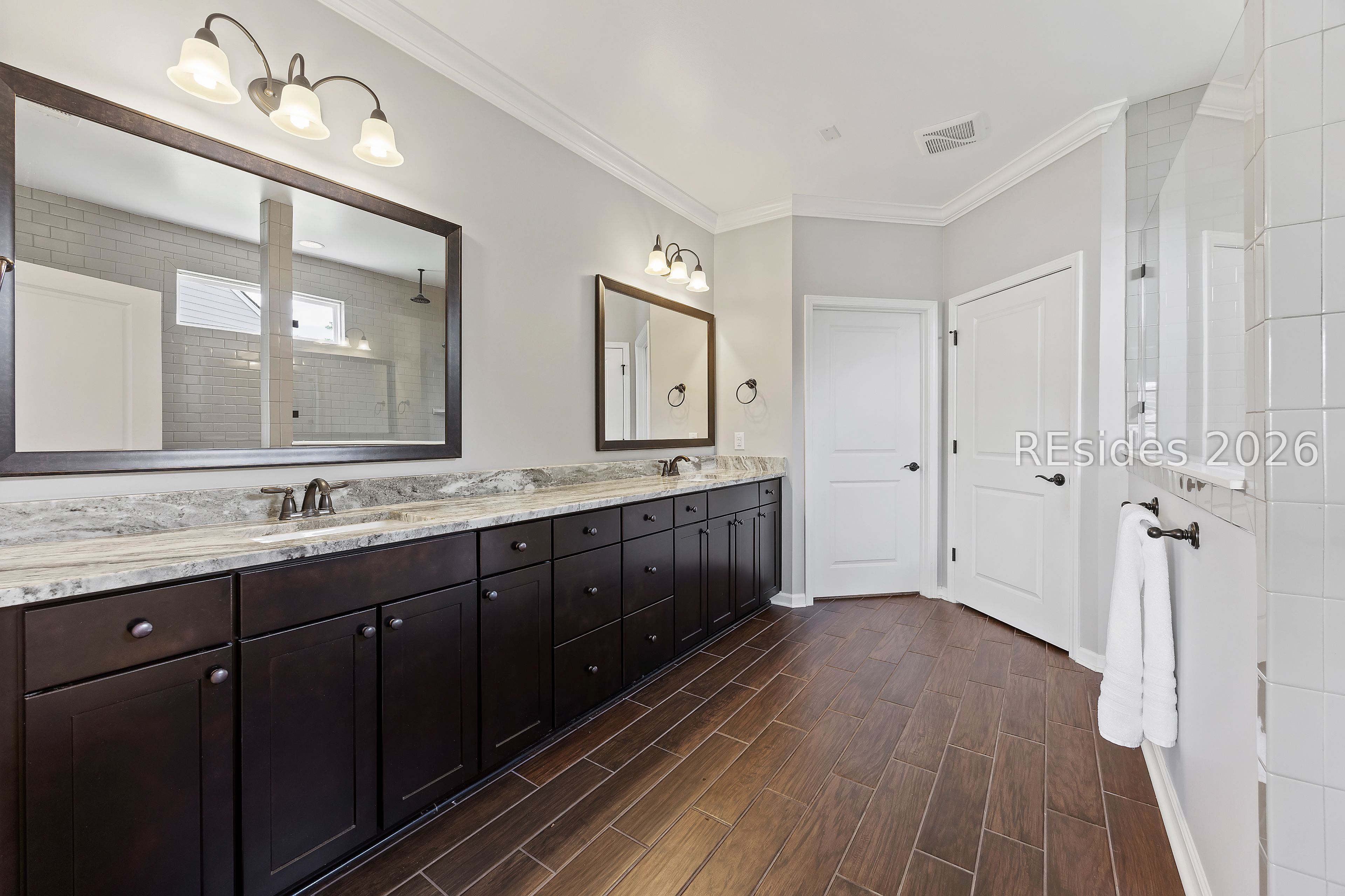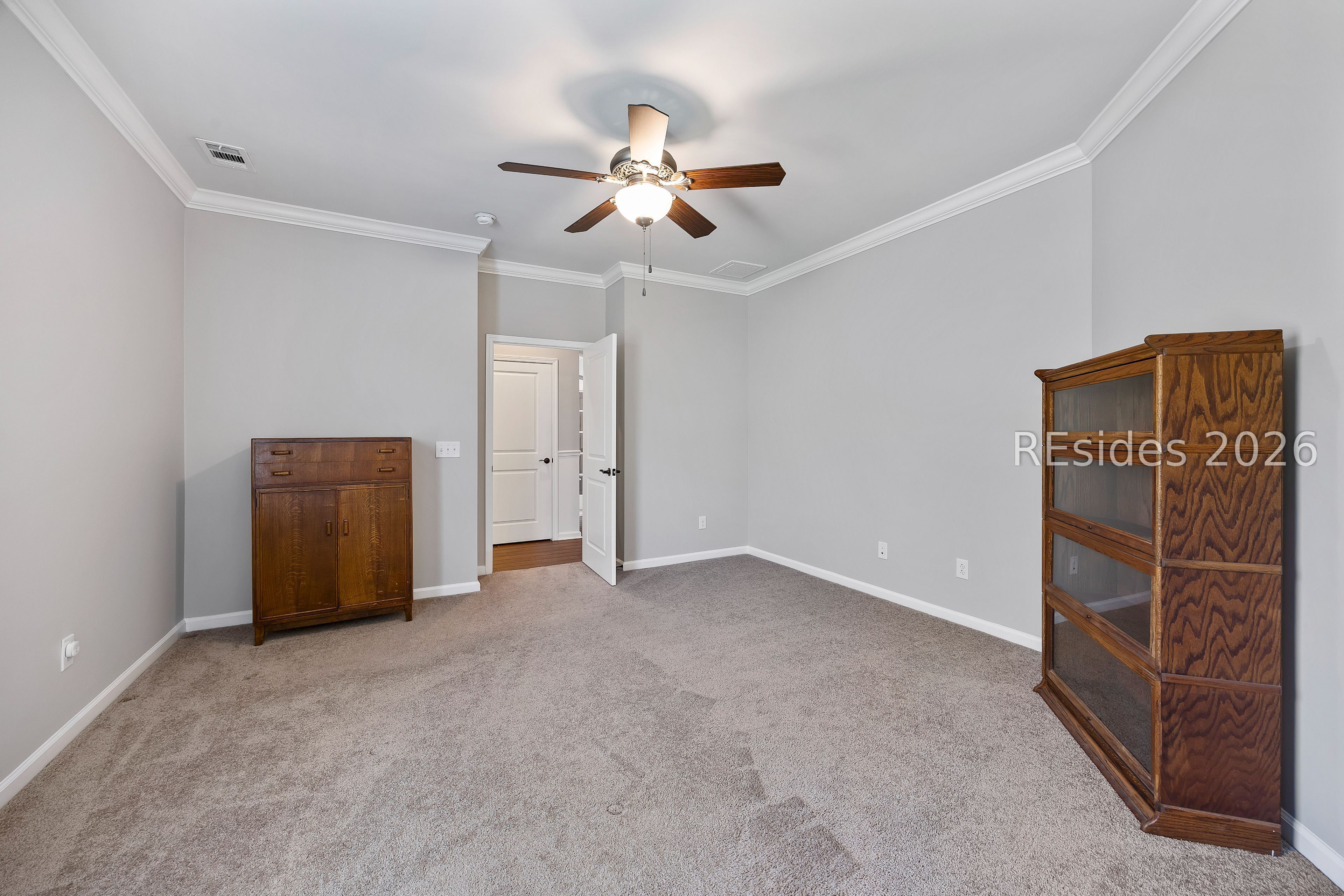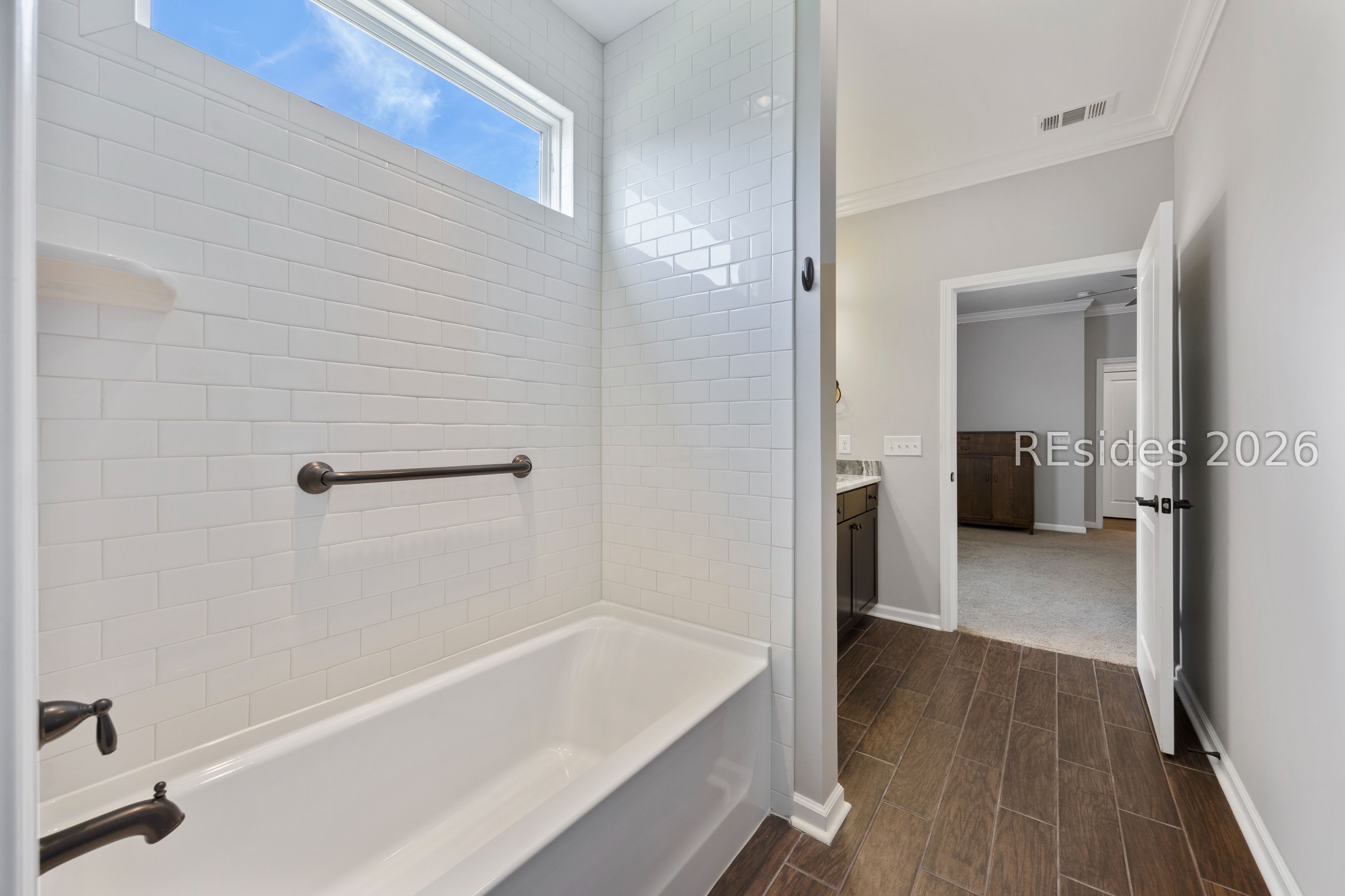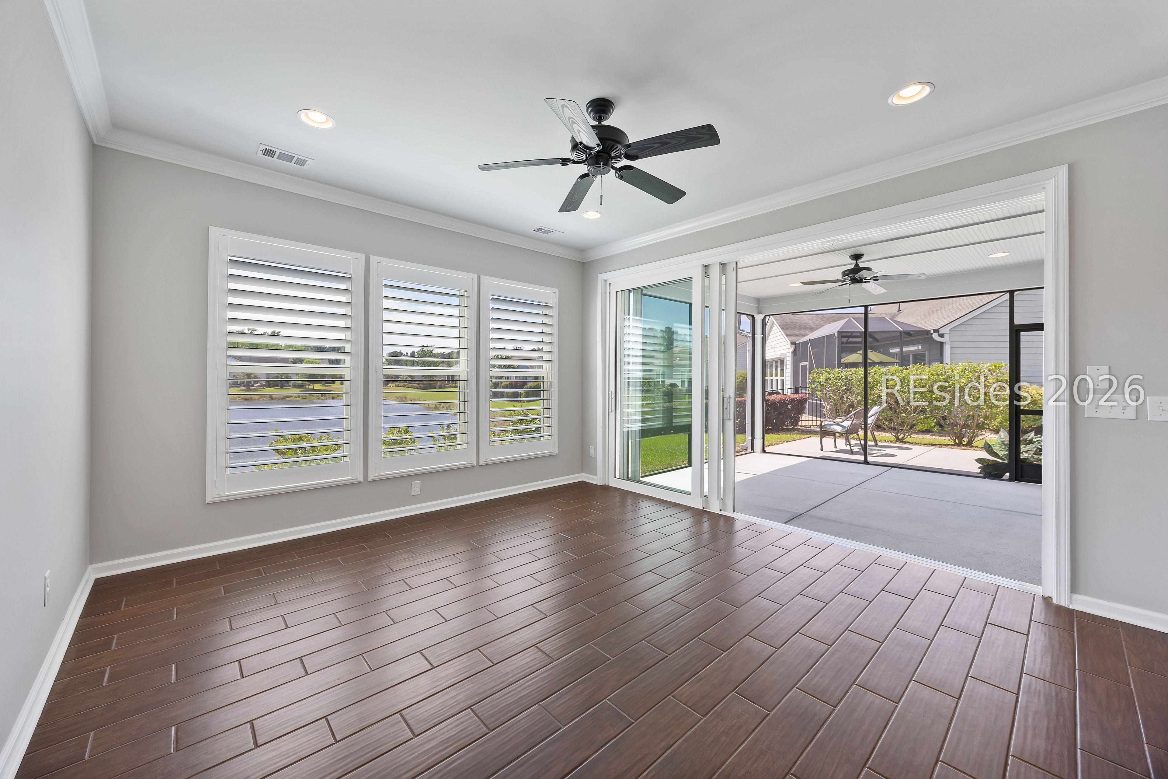Don't miss out on this Rare South-facing full lagoon view Tangerly Oak model in The Haven at New Riverside, Bluffton's 55+ community. This beautifully upgraded single-story home, has 2,700+ square ft, features 3 bedrooms, 2 and a half baths, smooth ceilings, spacious open floorpan with $75,000 in upgrades. Enjoy a gorgeous lagoon view even from front door. gracious entry provides ample room. Attractive batten/board, Hardie plank ext siding along with brick accents & front porch, new interior and exterior paint, fresh landscaping, plantation shutters throughout, custom crown moulding, attractive wood grain plank tile flooring. A gourmet updated kitchen in this single level home boasts granite ctops, custom walk-in pantry, black Whirlpool appliances, new dishwasher, 6-burner gas cooktop, a porcelain farmhouse sink w/water view from kit. The kit has large island with seating, breakfast bar and upgraded cabinetry w/pull out shelving and soft close drawers/doors. This open floorplan of one level living also features a bright, light filled Sun Room/Carolina Room with tri-fold sliding doors opening to a screen lanai/screen porch & separate patio overlooking lagoon.The trifold sliding doors are great for entertaining making the Screen Porch & Sun Room seem like one open sun drenched space to enjoy your Outdoor Retreat. The primary suite offers a beautiful lagoon view, tray ceiling, luxurious tiled rain shower, custom walk-in closet w/direct pass-thru to laundry rm for convenience. The 4' extended garage w/added storage for a golf cart or workshop, includes a walk-up attic and Lifestyle garage screen. Off the garage is a spacious drop zone for convenience and storage. This is the perfect gated community for the active adult lifestyle and popular retirement community, The Haven at New Riverside allows you to enjoy resort-style amenities including a Jr. Olympic pool, jacuzzi, newly remodeled Club House, fitness center, 4 Har-tru lighted tennis courts, Pickleball, Dog park, miles of walking & biking trails, garden plots, playground and social clubs. Located near Old Town Bluffton, Hilton Head Island, Savannah, Beaufort, shopping, dining. Added features: whole home security system including smoke detection/alarms keeping your home safe while you are away; sound system wiring; drip watering system on most landscaping; and Ring doorbell w/additional camera keeps you informed of visitors & when important deliveries arrive. Low HOA & property taxes!! Don't miss out!