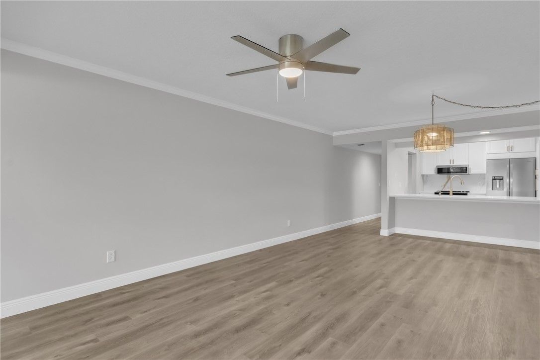 This is what you've been WAITING for! Indulge in pure LUXURY in this completely renovated FIRST FLOOR beauty! Captivating BRAND NEW kitchen w/ quartz counters & backsplash, SS appliance package, soft-close cabinets & pantry! Luxury plank floors flow seamlessly throughout w/ BRAND NEW crown molding/paint/knockdown ceilings/doors/fans/vanities/toilets/water heater! Plus a added Primary tiled walk-in shower! Convenience of covered parking, impact windows, poured concrete walls! Hello LOCATION! Only STEPS from heated pool, bbq & pavilion! Stunning lake/golf views to enjoy year round or seasonally!