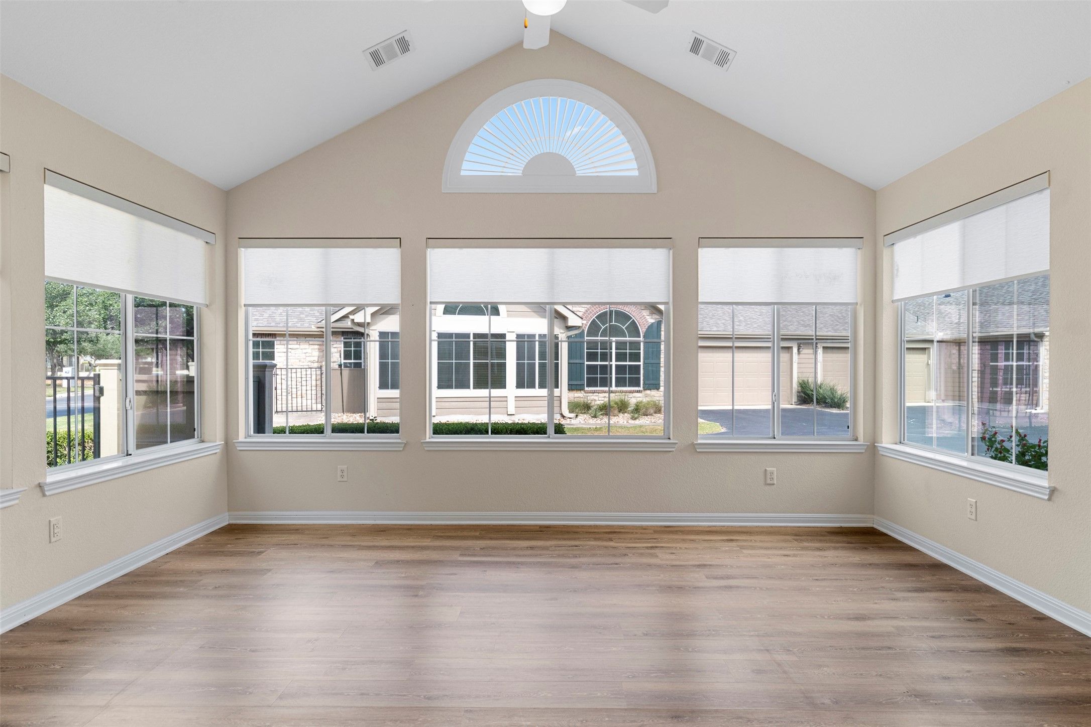 UPGRADES, UPGRADES! In the last few years these are the improvements made to this condo: wood laminate floors * plantation shutters * remote control shades in sunroom * tankless water heater * replaced kitchen range (gas cooktop with electric oven) * replaced dishwasher * under counter lighting in kitchen * pull out drawers in lower cabinets in kitchen * replaced shower doors in both baths * added 2 beautiful chandeliers! Added oversized patio with fence and gate! 2021 model washer and dryer and 2021 refrigerator will remain * Neighborhood pool and clubhouse with exercise room plus neighborhood social activities. HOA includes water, trash, exterior maintenance and insurance on the unit and HOA area lawn maintenance. This is a 55+ community - come live in this easy maintenance condo!