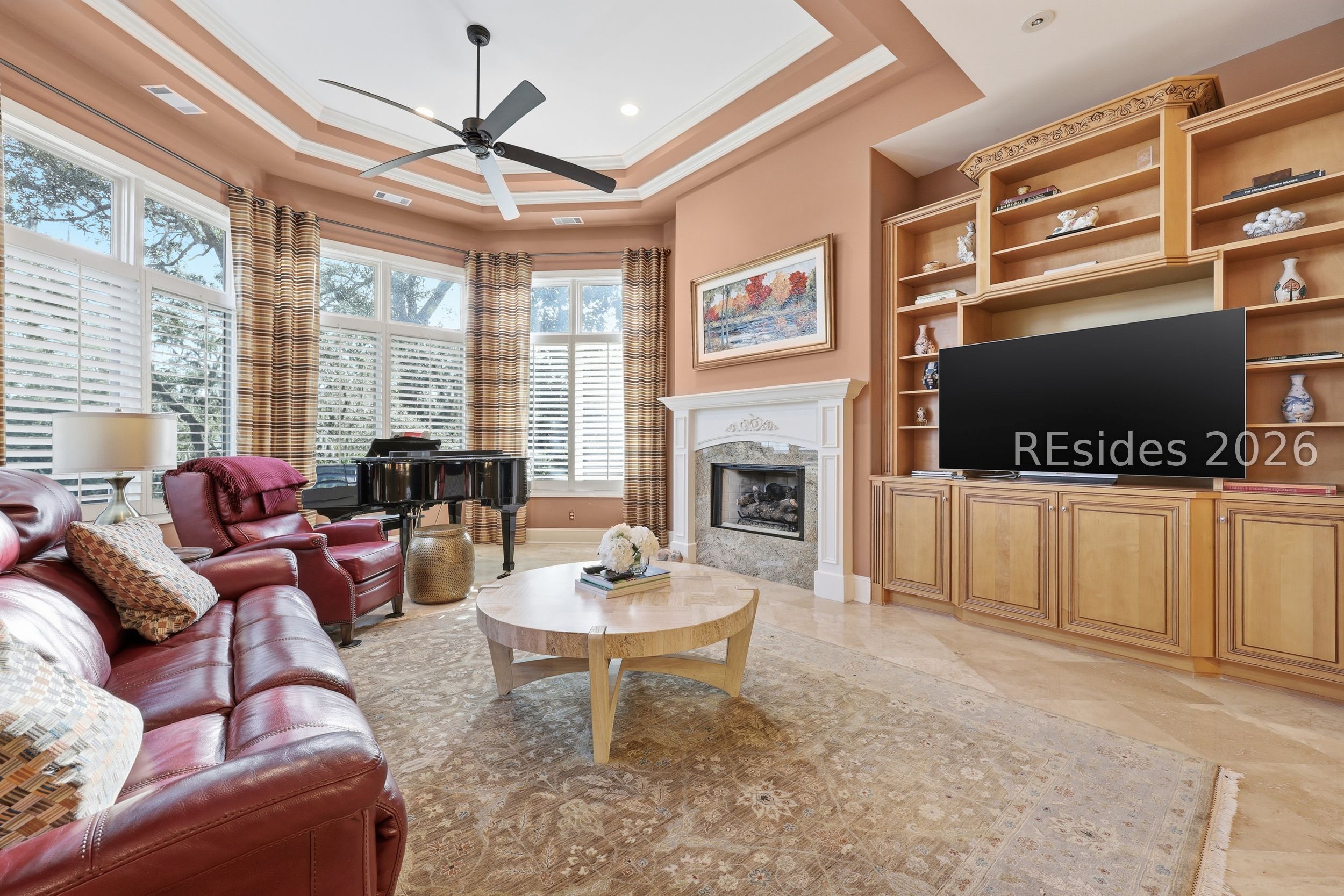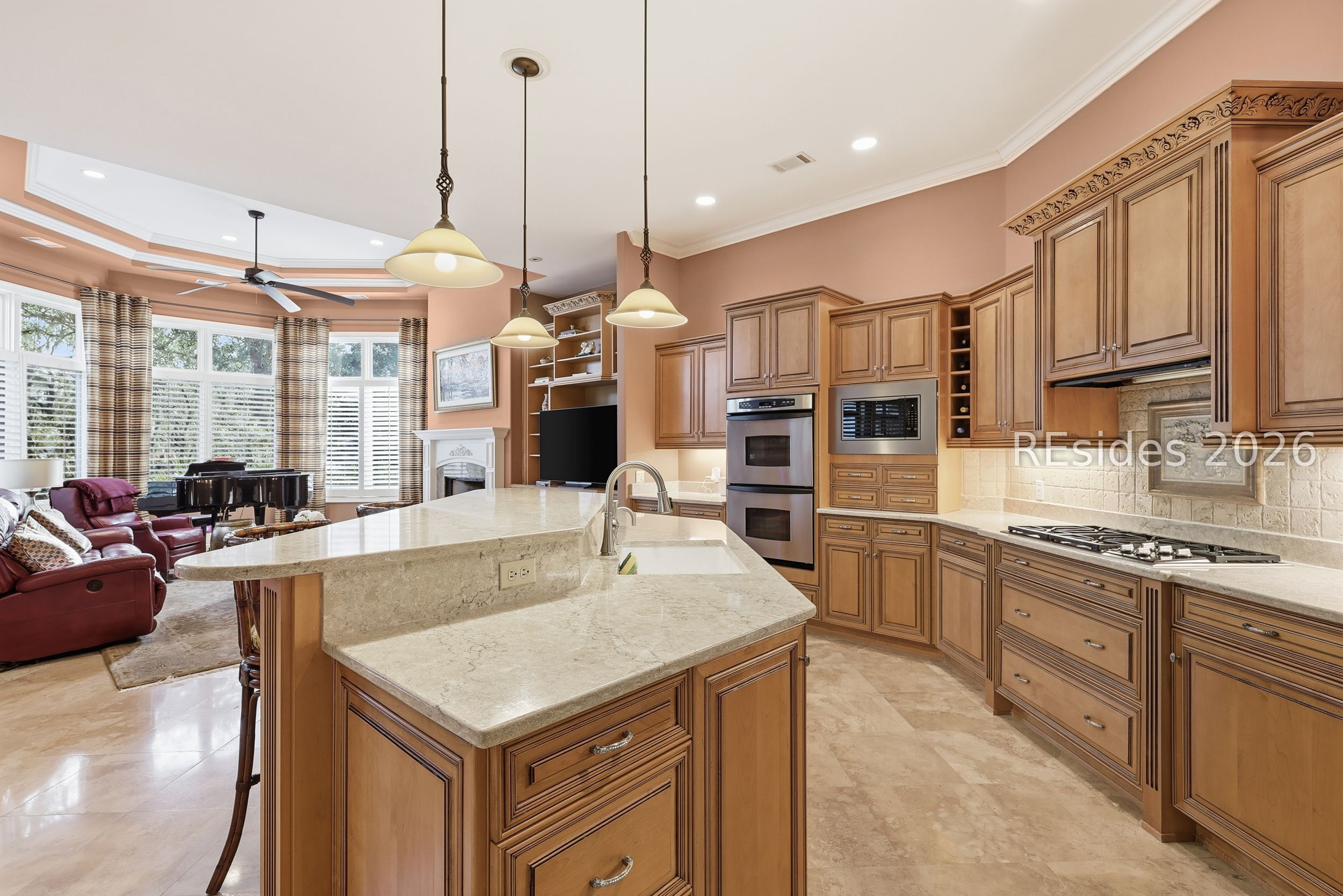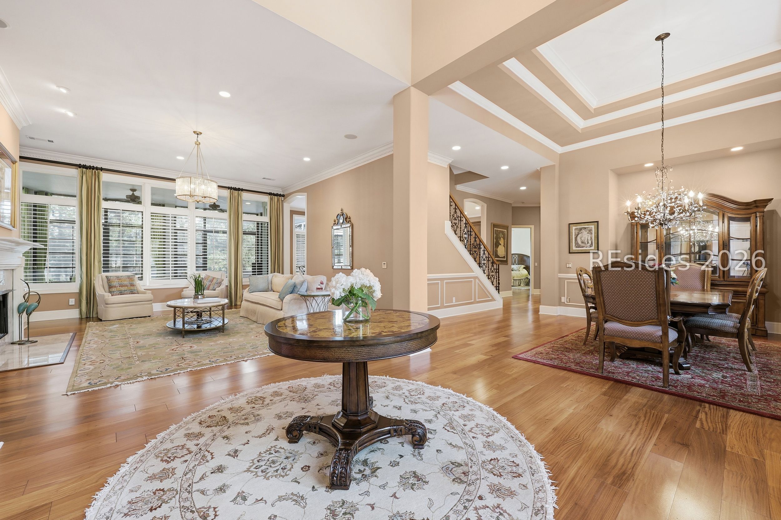 Enjoy sweeping marsh-to-deep-water views from this exceptional home located in the private, gated Broad Pointe section of Indigo Run, offering access to a private community dock and an elevated Lowcountry lifestyle. This spacious residence features 5 bedrooms and 5.5 baths, including a first-floor primary suite with a well-appointed bath showcasing dual vanities, a large walk-in closet, separate soaking tub, and walk-in shower. Designed for both comfort and entertaining, the home offers a living room with built-ins and fireplace, along with a separate family room featuring a second fireplace that opens seamlessly to the kitchen. The kitchen is thoughtfully designed with quartz countertops, a Sub-Zero refrigerator, stainless steel appliances, double ovens, gas range, and a breakfast area, complemented by a separate formal dining room. Additional living spaces include a large bonus room/flex space, dedicated office, and a three-car garage. Outdoor living is a true highlight, with a screened porch and built-in outdoor kitchen, all perfectly positioned to take in the stunning marsh and water views. Plantation shutters throughout add timeless Lowcountry charm. Located within Indigo Run, club members enjoy access to premier amenities including security, golf privileges, swimming pool, pickleball, and more-just minutes from beaches, dining, and shopping. A rare opportunity to own a private waterfront home with views, space, and amenities that truly set it apart.