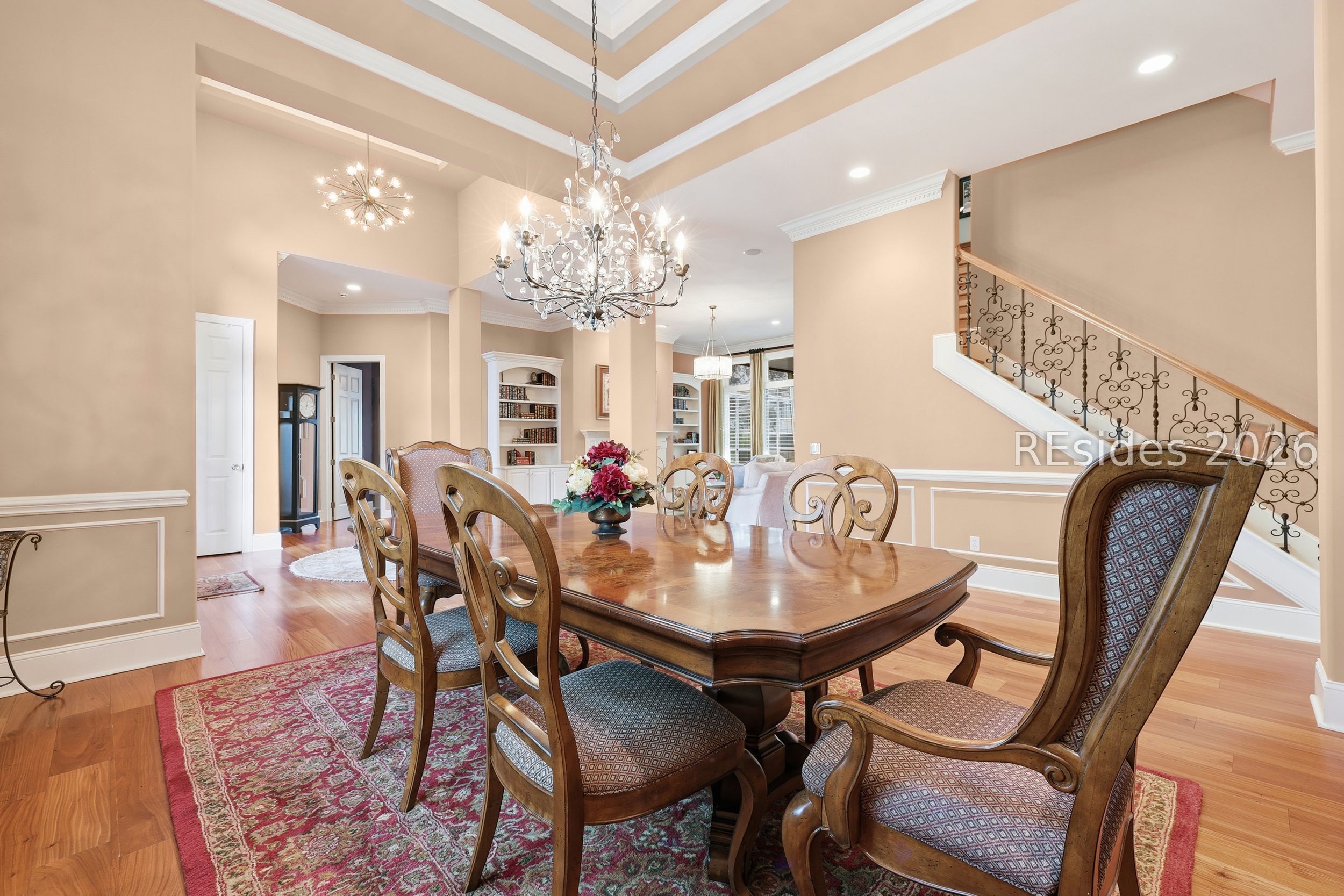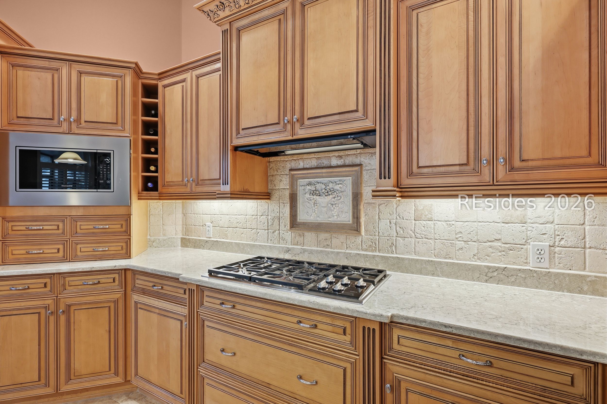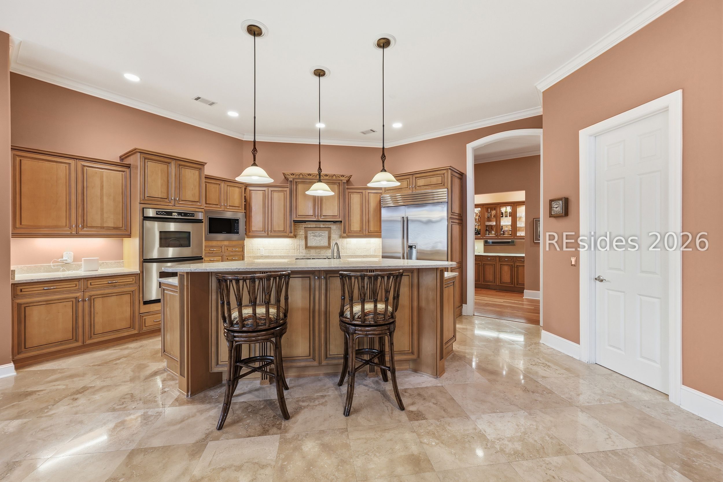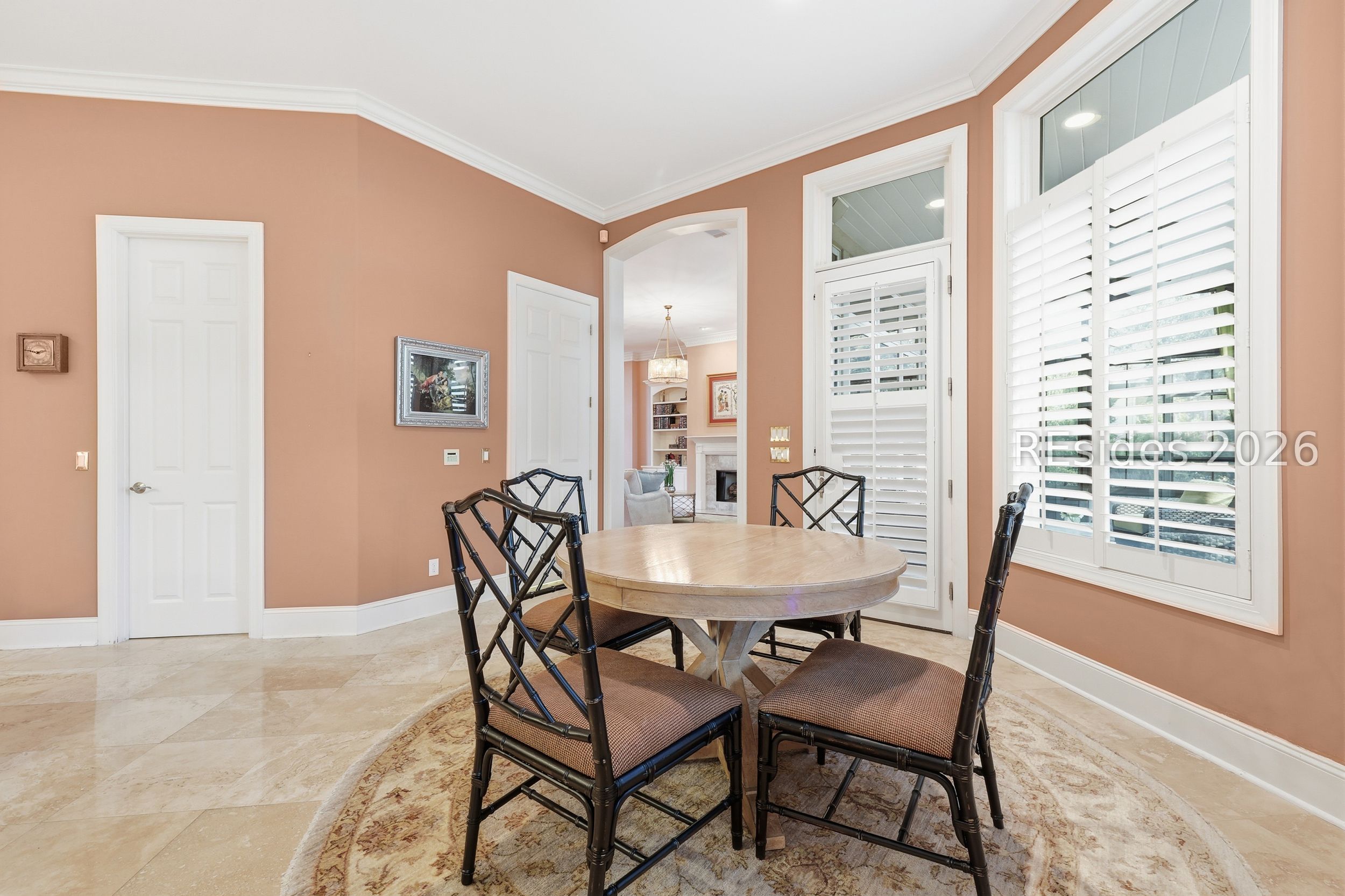 Enjoy sweeping marsh-to-deep-water views from this exceptional home located in the private, gated Broad Pointe section of Indigo Run, offering access to a private community dock and an elevated Lowcountry lifestyle. This spacious residence features 5 bedrooms and 5.5 baths, including a first-floor primary suite with a well-appointed bath showcasing dual vanities, a large walk-in closet, separate soaking tub, and walk-in shower. Designed for both comfort and entertaining, the home offers a living room with built-ins and fireplace, along with a separate family room featuring a second fireplace that opens seamlessly to the kitchen. The kitchen is thoughtfully designed with quartz countertops, a Sub-Zero refrigerator, stainless steel appliances, double ovens, gas range, and a breakfast area, complemented by a separate formal dining room. Additional living spaces include a large bonus room/flex space, dedicated office, and a three-car garage. Outdoor living is a true highlight, with a screened porch and built-in outdoor kitchen, all perfectly positioned to take in the stunning marsh and water views. Plantation shutters throughout add timeless Lowcountry charm. Located within Indigo Run, club members enjoy access to premier amenities including security, golf privileges, swimming pool, pickleball, and more-just minutes from beaches, dining, and shopping. A rare opportunity to own a private waterfront home with views, space, and amenities that truly set it apart.