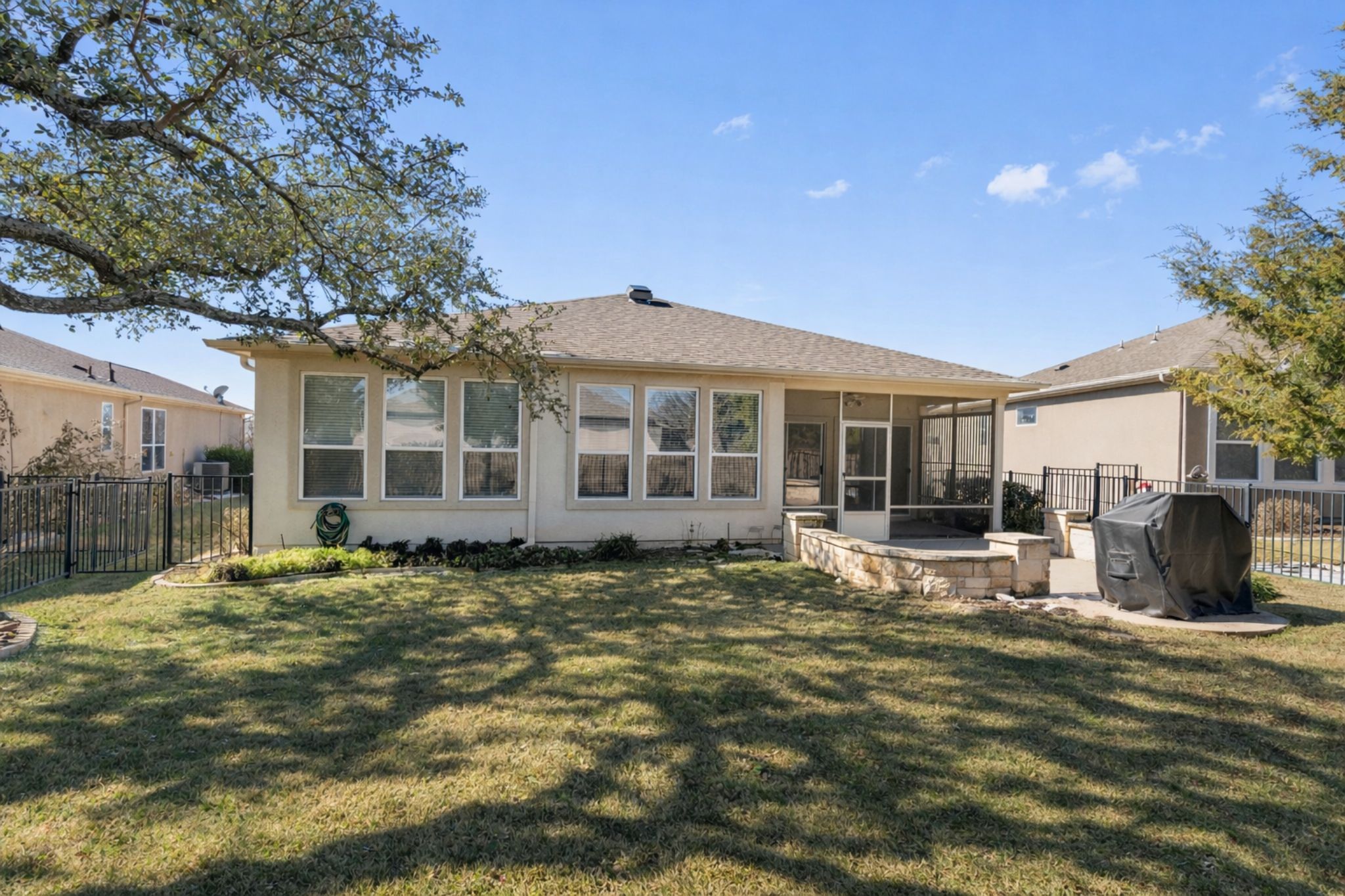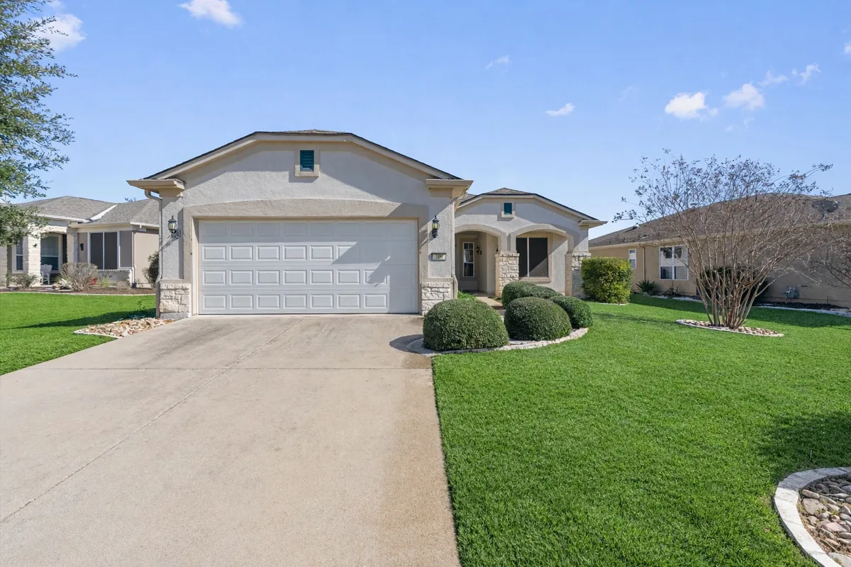 Experience the absolute best of your golden years in this meticulously maintained residence, perfectly situated within the vibrant 55+ community of Sun City. From the moment you arrive, the stunning low-maintenance landscaping sets a tone of easy living and curb appeal. Inside, the popular Surrey Crest floor plan unfolds with an airy, light-filled layout. The spacious living room is centered by a cozy fireplace & offers serene views of the backyard. The kitchen, features corian countertops, a center island with bar seating, stainless steel appliance, a wealth of gorgeous stained wood cabinetry, and a pantry. Nearby, a bright dining area is highlighted by a striking mirrored wall. For those who need a dedicated workspace or a quiet retreat, the versatile flex room with classic French doors serves as the perfect home office or a formal dining area. The spacious primary suite, boasts a generous walk-in closet and a spa-like ensuite bath complete with a dual vanity, soaking tub, and a separate shower. Guests will feel right at home in the well-appointed secondary bedroom, conveniently located near a full second bath. The laundry room is elevated with a dedicated sink and cabinetry for organization. Outdoor living is where this home truly shines. Transition seamlessly to the screened-in patio for year-round morning coffee or evening hobbies, then step out onto the extended stone patio. Featuring a circular stone wall, this outdoor oasis is the ultimate backdrop for lounging in the sun or hosting al fresco parties.Living in Sun City isn't just about a beautiful home; it’s about an unparalleled lifestyle. You’ll enjoy world-class amenities including three championship golf courses, two fitness centers, eight swimming pools, and courts for tennis, pickleball, and bocce. With over 145 social clubs and proximity to top-tier medical facilities, shopping, and major thoroughfares like TX-195 and I-35, this is more than a house—it’s the vibrant lifestyle you’ve earned.