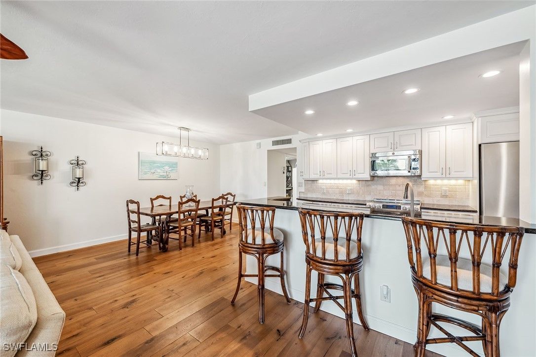 Welcome to this second-floor, three-bedroom, two-bath condominium in Harbour Cove with views of Moorings Bay and partial views of the Gulf. The unit features hurricane glass sliders, GE Cafe stainless steel appliances, granite countertops, tile and engineered hardwood flooring throughout. Enjoy gorgeous bay views from your expanded living room and enclosed lanai or from your western-exposed, open-air balcony from the main suite. Conveniently between two beach access points, this peaceful getaway is ideal for spending the day basking in sunshine and ending the day watching the colorful sunset. For boating enthusiasts, boat slips with and without lifts are available for lease through the association and for those looking for potential income, owners can lease their unit three times per year with a minimum of 60 days. Residents can enjoy the sparkling bayfront pool with an outdoor kitchen and grilling area, chickee hut and a communal fishing pier with kayak launch. The unit also includes a covered parking space, in-unit laundry room and a private storage room adjacent to the kitchen door. Only minutes from Naples renowned Fifth Avenue and Venetian Village, you’ll find world-class dining, shopping and entertainment at your doorstep.