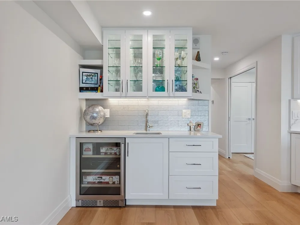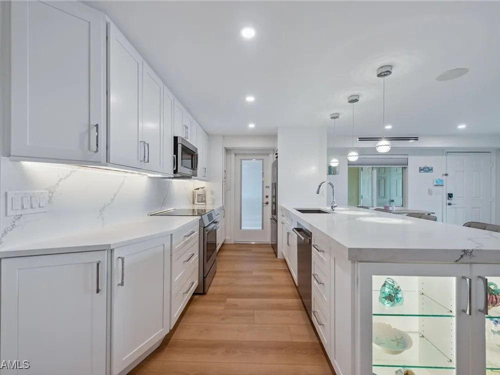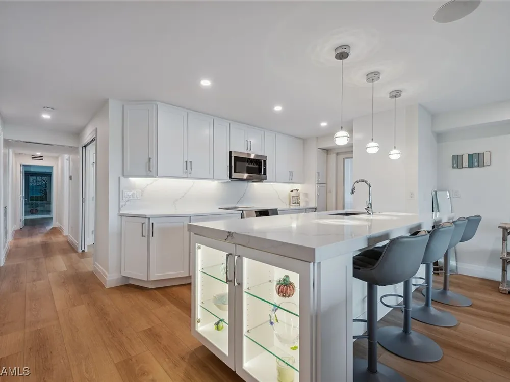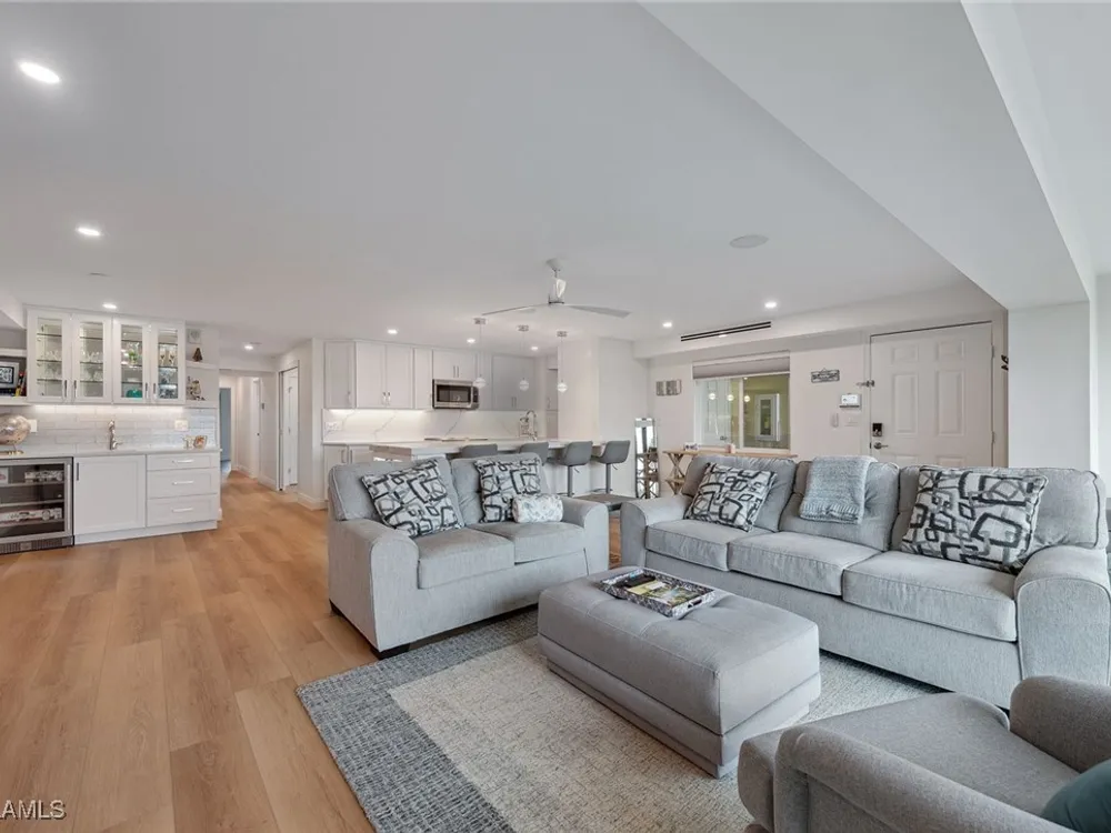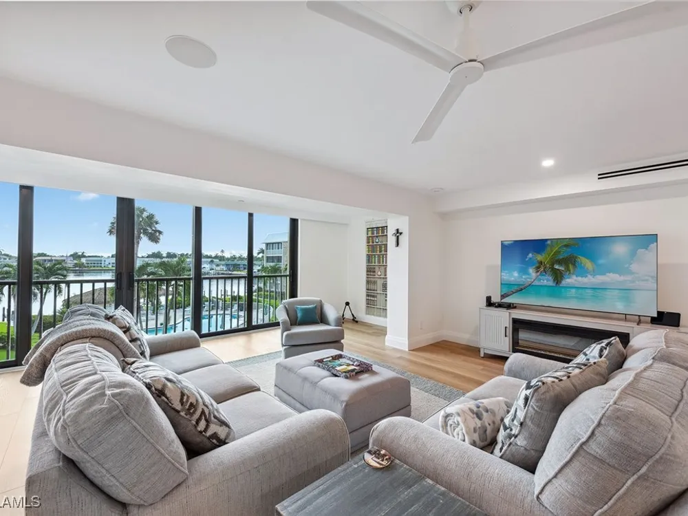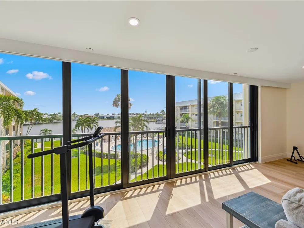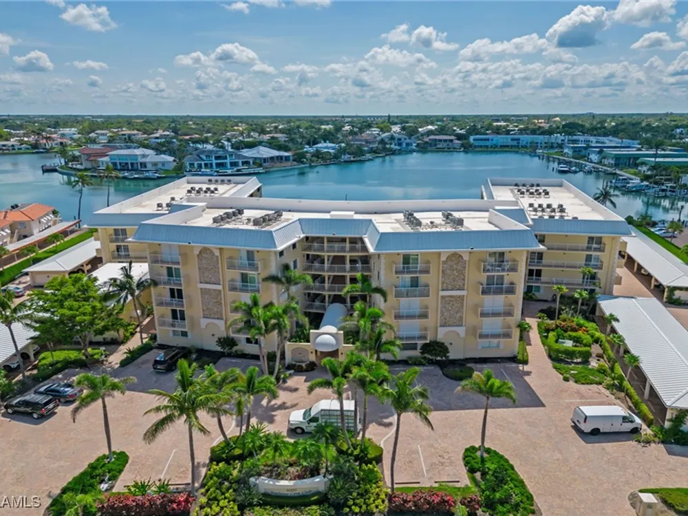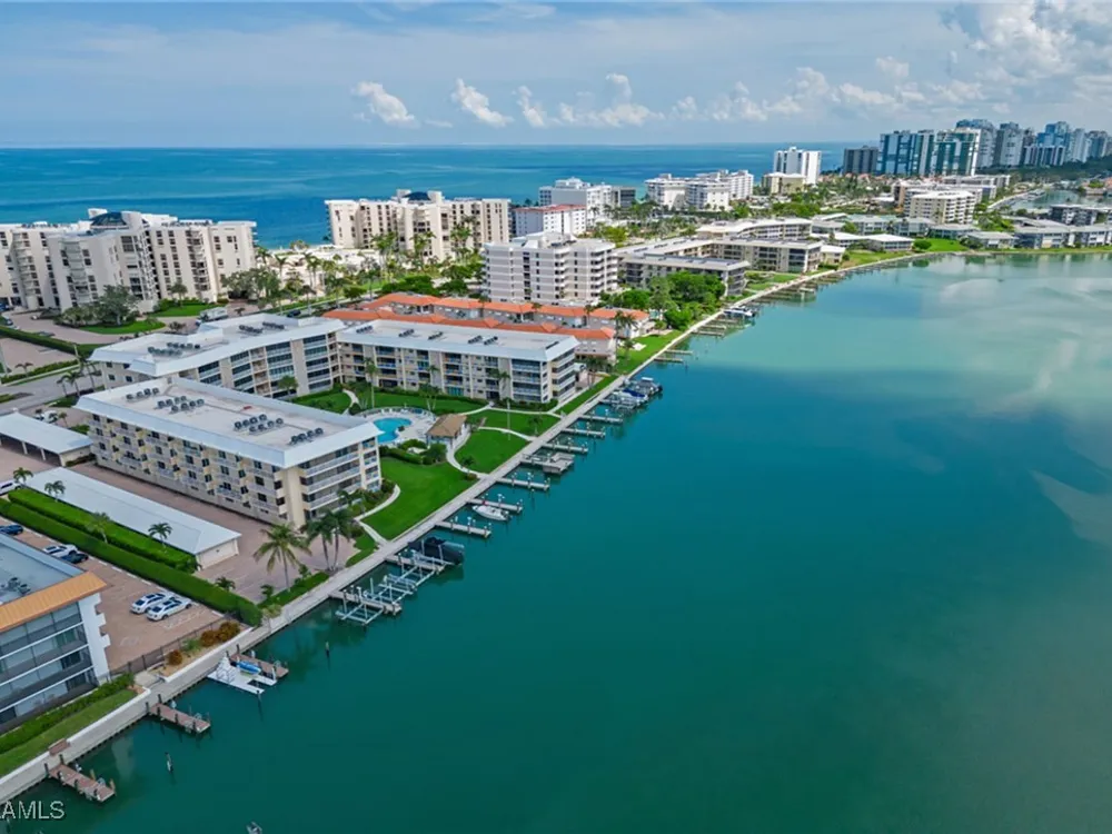 This updated third-floor, three-bedroom home offers stunning views of Moorings Bay. Conveniently located across from beach access, you can spend your days basking in the sunshine and end the day watching the colorful sunset. This newly remodeled unit features luxury vinyl plank flooring throughout, a smart home control panel, in-unit laundry, a west-facing open-air private balcony off the primary bedroom with Gulf views, and much more. Enjoy this bay-front residence featuring a wall of impact glass sliders designed to maximize the view. The kitchen is equipped with Lincoln quartz countertops and backsplash, a large island with bar seating that is perfect for entertaining guests, Bosch appliances and a wet bar complete with a wine cooler. Harbour Cove residents enjoy a peaceful bay-front pool, grills, and on-site boat slips that can be leased through the association. Owners can lease their units three times a year with a 60-day minimum. Located on Gulf Shore Boulevard, just north of Harbour Drive, it's a quick bike ride to the private Moorings Beach Park or the renowned shopping and dining at Venetian Village.