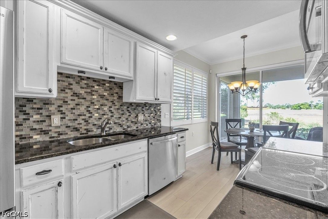 A fantastic opportunity awaits to own a piece of paradise with this 1421 sq. ft. coach home boasting stunning views of the golf course and lake. Enjoy breathtaking sunrises with the eastern rear exposure of this home. Featuring 2 bedrooms plus a den, 2 baths, and a spacious 2-car garage on the lower level, this home is move-in ready and being offered turnkey with numerous upgrades already completed. Some of the enhancements include tile and LVP flooring throughout, crown molding, white cabinets with an attractive backsplash in the kitchen, newer appliances, elegant window treatments, tray ceilings in certain areas, a picture window in the lanai to enhance the view, and more. Situated on a corner lot, this home offers added privacy. Upon entering, you are welcomed by an open family room area adjacent to the dining room, kitchen, and breakfast nook. The split bedroom layout and den provide privacy for guests from the master bedroom suite. With a 2-car garage and a large lanai offering a great view, this home has it all. Idlewild community amenities include a pool, clubhouse, and small fitness area. Roofs were replaced within the last 5 years, and all coach homes were externally painted. As a member of the Verandah Club, residents have access to a full array of amenities such as 2 championship golf courses designed by Bob Cupp and Jack Nicklaus, a tennis complex, pickleball courts, a state-of-the-art fitness center, a resort-style community pool, 9 miles of walking or biking paths, bocce courts, a playground, a dog park, kayaks on the Orange River, multiple restaurants, and a social calendar to meet everyone's needs. Come secure your place in Paradise today.