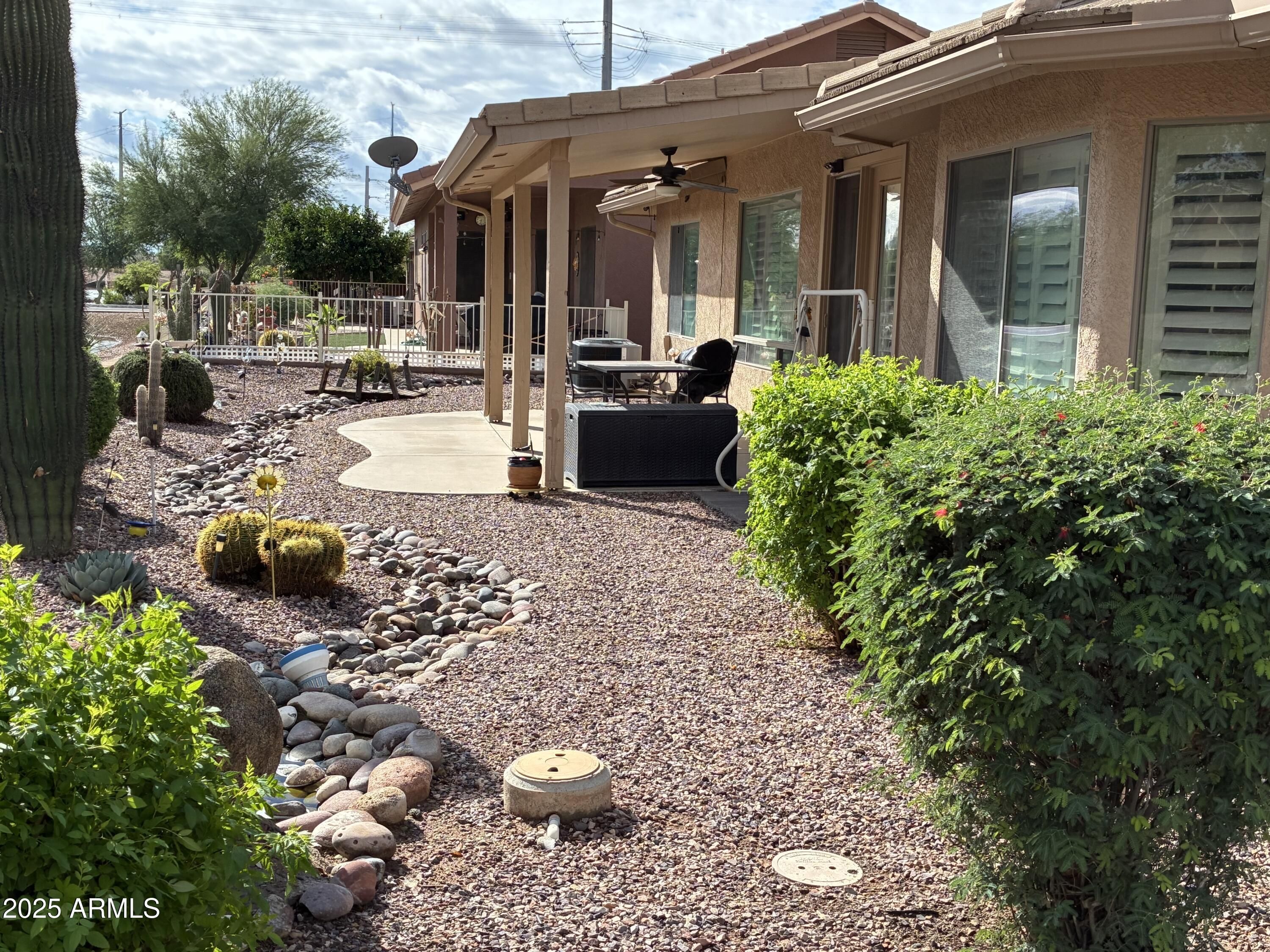 Furnished & ready to move into! This split 2 bedroom, 2 bath home with 9ft ceilings is well maintained. It has a walk-in shower & double closets in the large master, all windows have plantation shutters & the back views common area. A water fall in the back yard with covered patio gives you that relaxing atmosphere. The HOA in Sunland Springs is a low $915 a year & provides activities of all sorts, softball, tennis, pickle ball, woodshop, 2 pools, 2 excerise rms, card & billards, bocce ball, Lapidary & the list goes on.