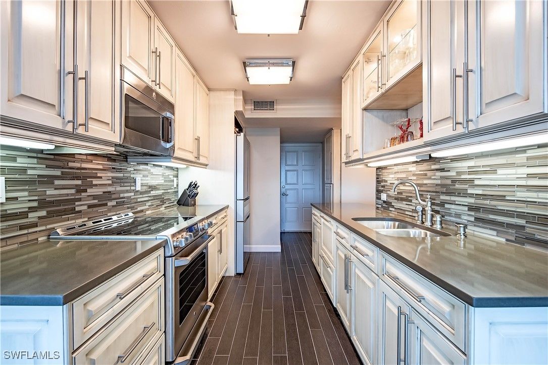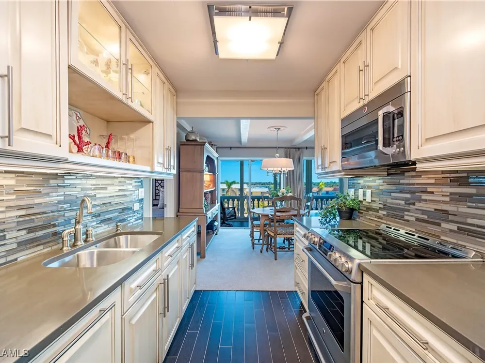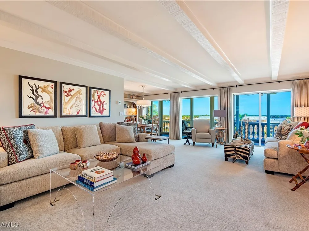 Experience beachfront luxury and sophistication in this meticulously updated sixth-floor residence at the prestigious Martinique Club, located in the coveted Moorings. Offering 1,440 square feet of thoughtfully designed living space, this 2-bedroom, 2-bathroom oasis boasts an open-concept layout perfect for entertaining, with seamless connections between the living, dining, and kitchen areas. From the expansive enclosed lanai, enjoy breathtaking panoramic views of Venetian Bay, while ample windows flood the space with natural light, enhancing the bright and airy ambiance. The primary suite serves as a tranquil retreat, featuring a walk-in closet and a spa-inspired shower. Recent renovations include new flooring, a modernized kitchen with state-of-the-art appliances, and exquisitely updated bathrooms. Additional features include electric shutters on the lanai, impact glass windows, extra storage, and a deeded parking space. Martinique Club offers an unparalleled lifestyle with only 35 residences, private beach access, a beachfront pool, a pool cabana room, and a newly renovated lobby. Located steps from Venetian Village’s upscale boutiques and dining, and just a short drive to Waterside Shops, Artis-Naples, Mercato, and Naples' iconic 5th Avenue South and 3rd Street South, this home represents coastal elegance at its finest.