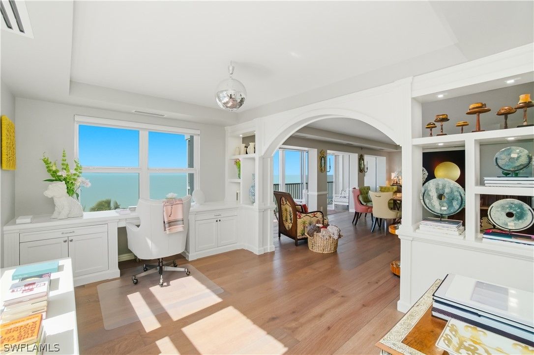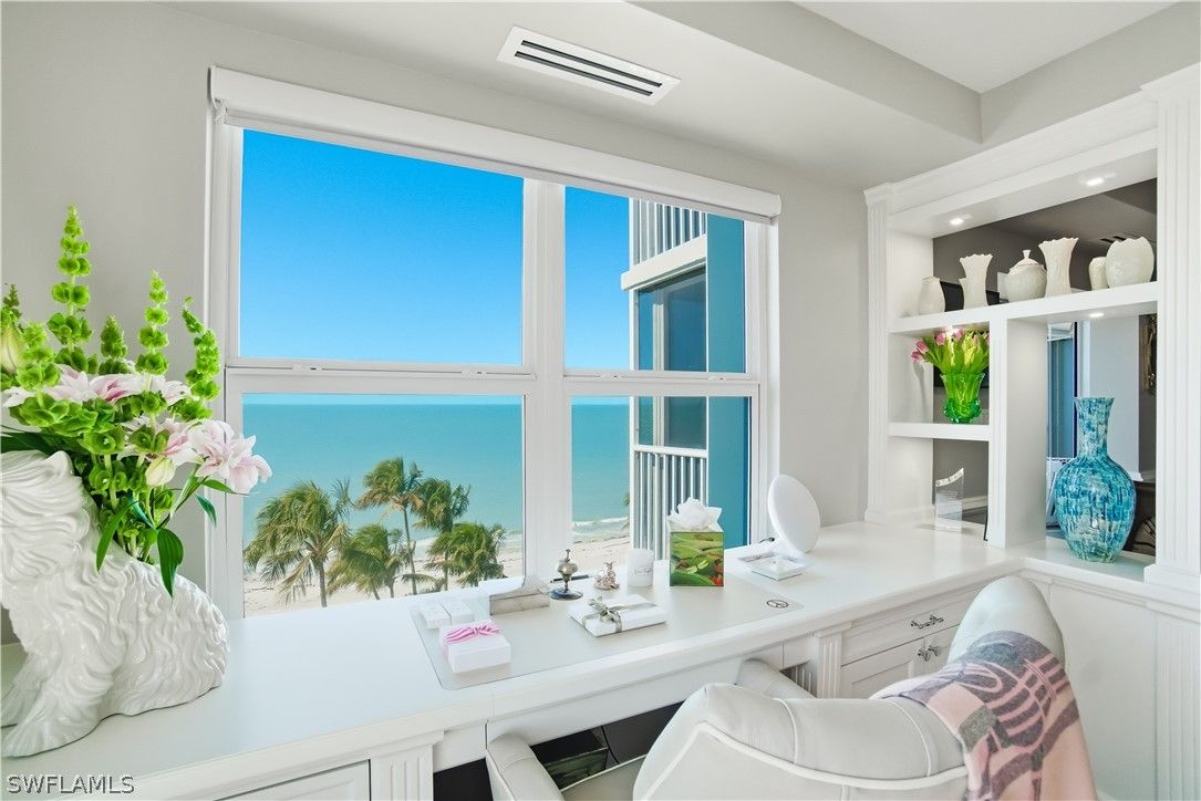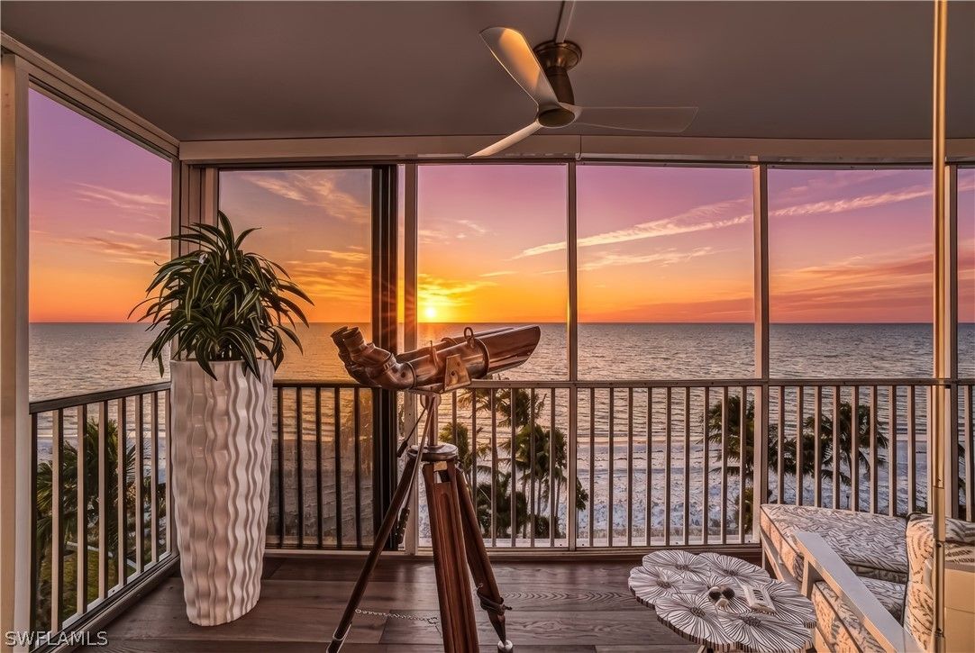 Experience a luxurious beachfront lifestyle at Martinique Club in The Moorings, an intimate Gulf front building offering just 35 private residences. This magnificently updated seventh floor end unit captures panoramic views spanning the Gulf, Venetian Bay, and the Naples skyline, delivering breathtaking sunsets, warm coastal breezes, and an abundance of natural light throughout. Spanning over 2,300 square feet, the well thought out floor plan features three bedrooms and three bathrooms, with expansive living and dining areas that flow seamlessly to a screened and enclosed balcony creating an ideal space for entertaining. The kitchen is beautifully appointed with custom cabinetry and countertops and high end appliances. All bedrooms offer ensuite bathrooms, generous closet space, and stunning water views. Additional features include electric shutters, impact glass windows, custom built ins with cedar drawers, automatic shades on every window, in residence laundry, extra storage, and a deeded parking space. Martinique Club offers private beach access, a beachfront pool, poolside cabana room, outdoor grills, and a newly renovated secure lobby, with no land lease in place. Ideally located just steps from Venetian Village’s upscale dining and boutiques and minutes to Waterside Shops, Artis Naples, Mercato, and Naples iconic Fifth Avenue South and Third Street South, this residence represents coastal elegance at its finest.