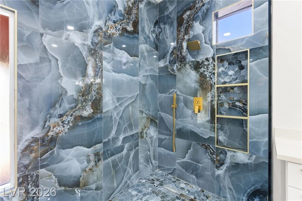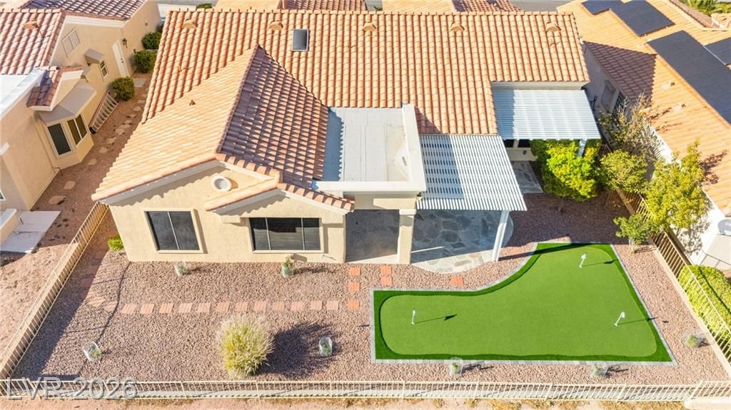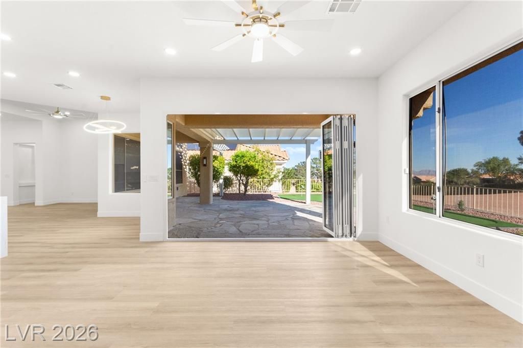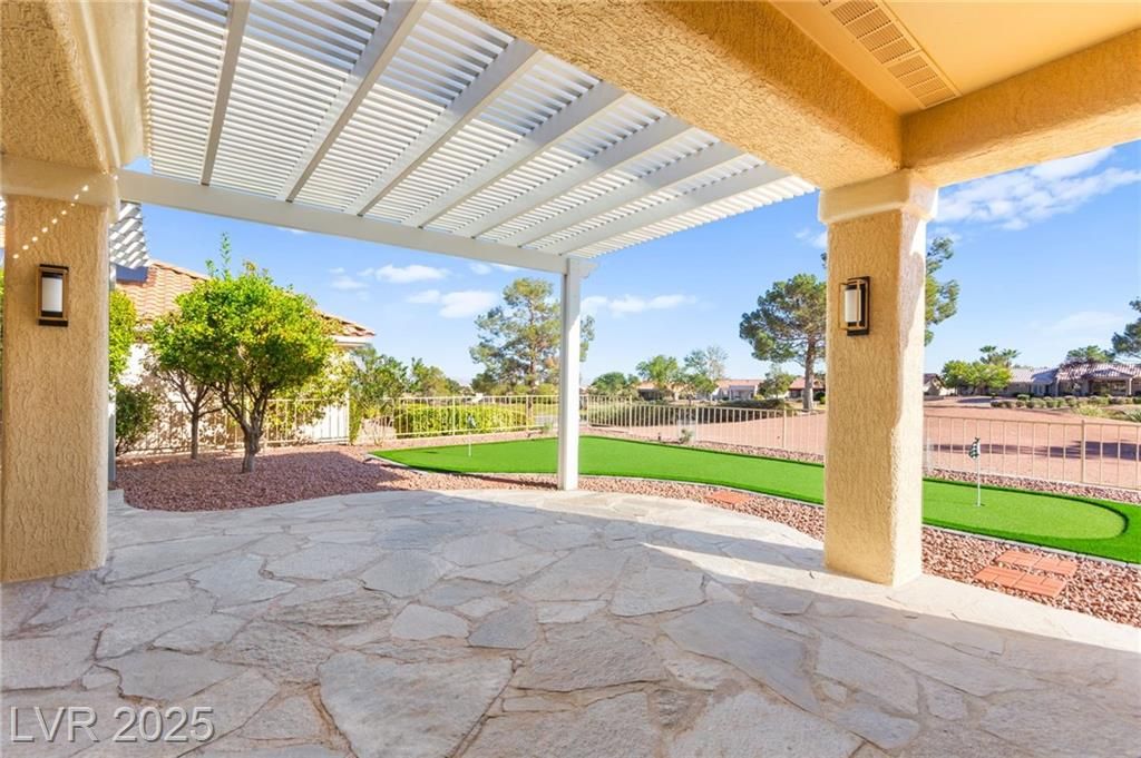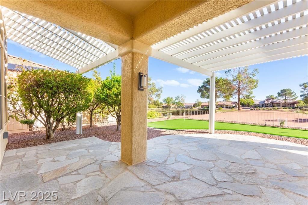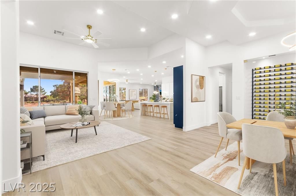 This stunning 2-bedroom, 2-bath, 2,161 sq. ft. home on the 11th hole of the Highland Falls Golf Course in Sun City Summerlin has been fully remodeled with modern designer finishes throughout. The open-concept layout features wide-plank flooring, sleek gold accents, and a chef’s kitchen with two-tone cabinetry, a quartz waterfall island, and professional-grade stainless steel appliances. The living area showcases a striking Belize Azul tile feature wall with a 100 inch electric fireplace and included Frame TV, while the dining area includes a custom glass-enclosed wine display. The primary suite bathroom offers dual vanities, gold fixtures, and a luxurious walk-in shower with dual shower 3 way shower heads, wrapped in matching Belize Azul tile. Enjoy golf course views from the covered patio or the private backyard putting green. Sun City Summerlin offers world-class amenities, golf, pools, fitness centers, and endless social activities. Cal today for a private showing!