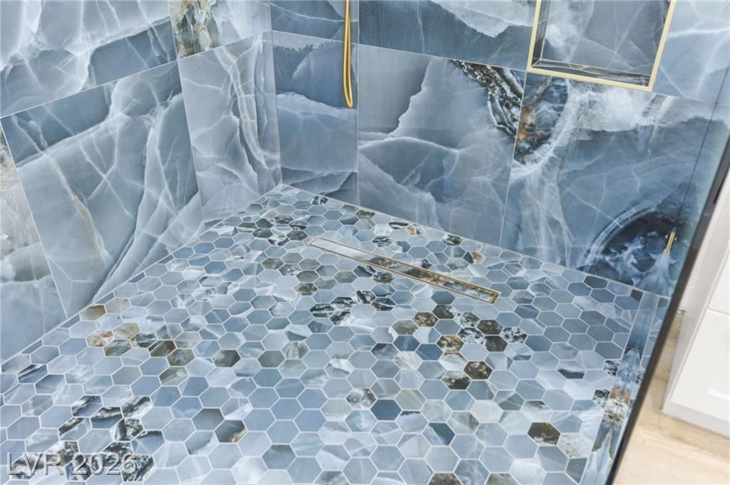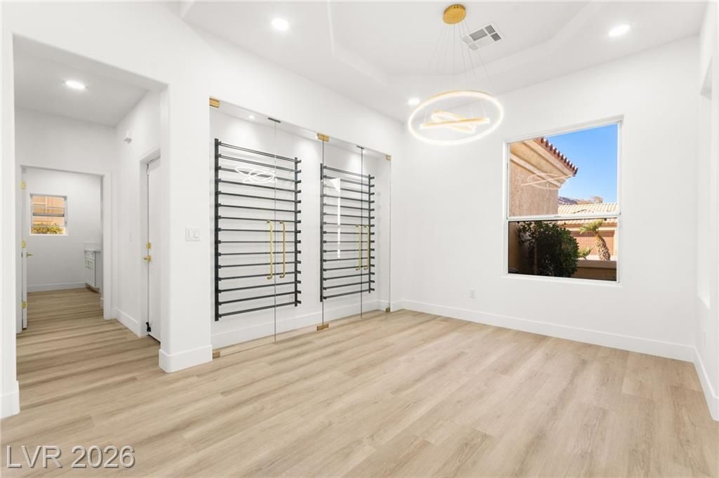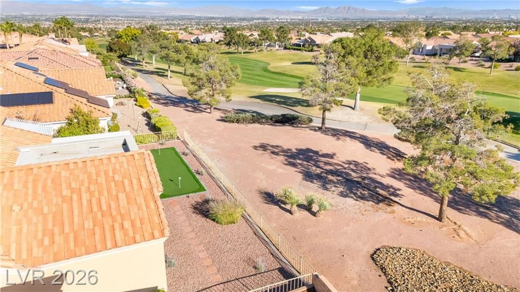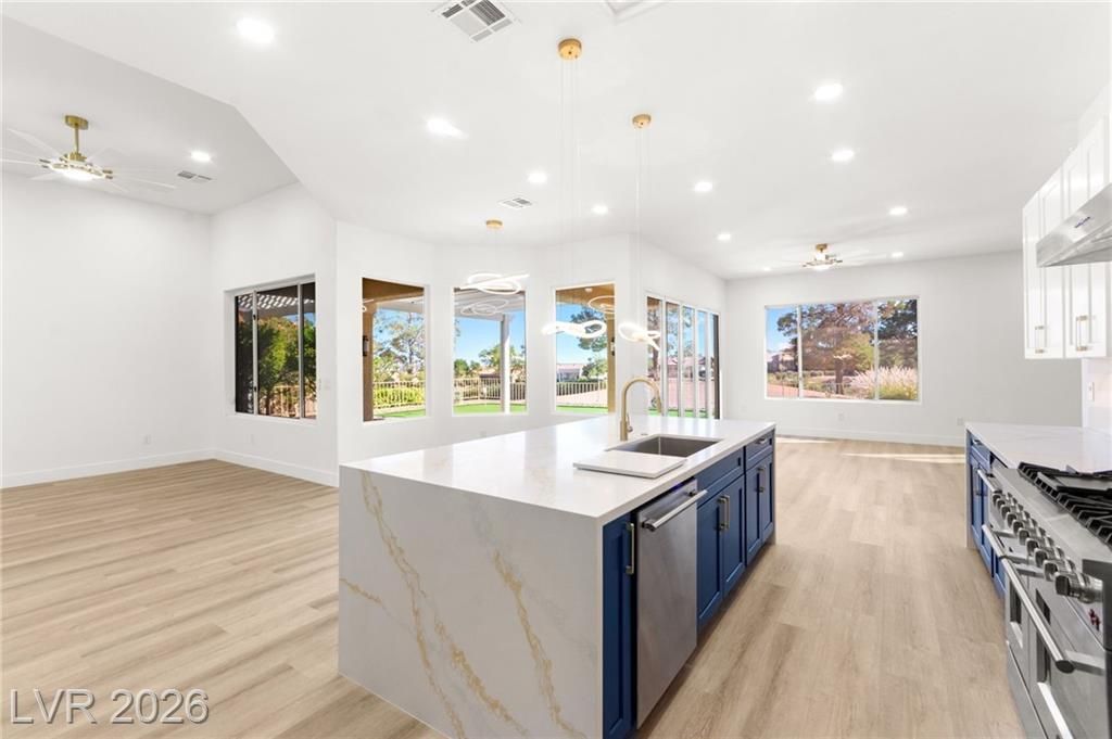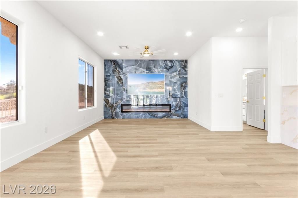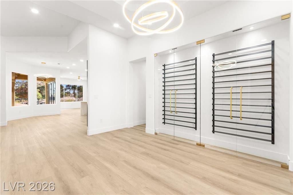 This stunning 2-bedroom, 2-bath, 2,161 sq. ft. home on the 11th hole of the Highland Falls Golf Course in Sun City Summerlin has been fully remodeled with modern designer finishes throughout. The open-concept layout features wide-plank flooring, sleek gold accents, and a chef’s kitchen with two-tone cabinetry, a quartz waterfall island, and professional-grade stainless steel appliances. The living area showcases a striking Belize Azul tile feature wall with a 100 inch electric fireplace and included Frame TV, while the dining area includes a custom glass-enclosed wine display. The primary suite bathroom offers dual vanities, gold fixtures, and a luxurious walk-in shower with dual shower 3 way shower heads, wrapped in matching Belize Azul tile. Enjoy golf course views from the covered patio or the private backyard putting green. Sun City Summerlin offers world-class amenities, golf, pools, fitness centers, and endless social activities. Cal today for a private showing!