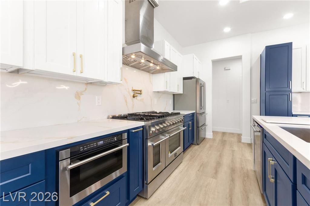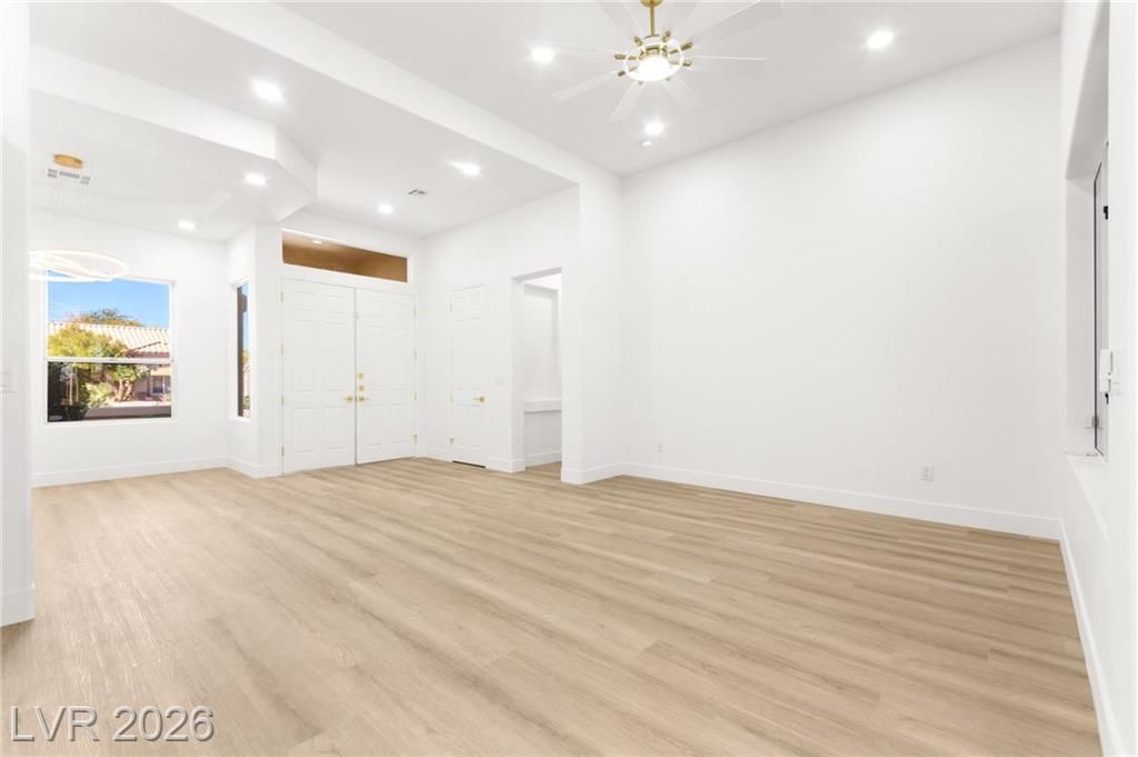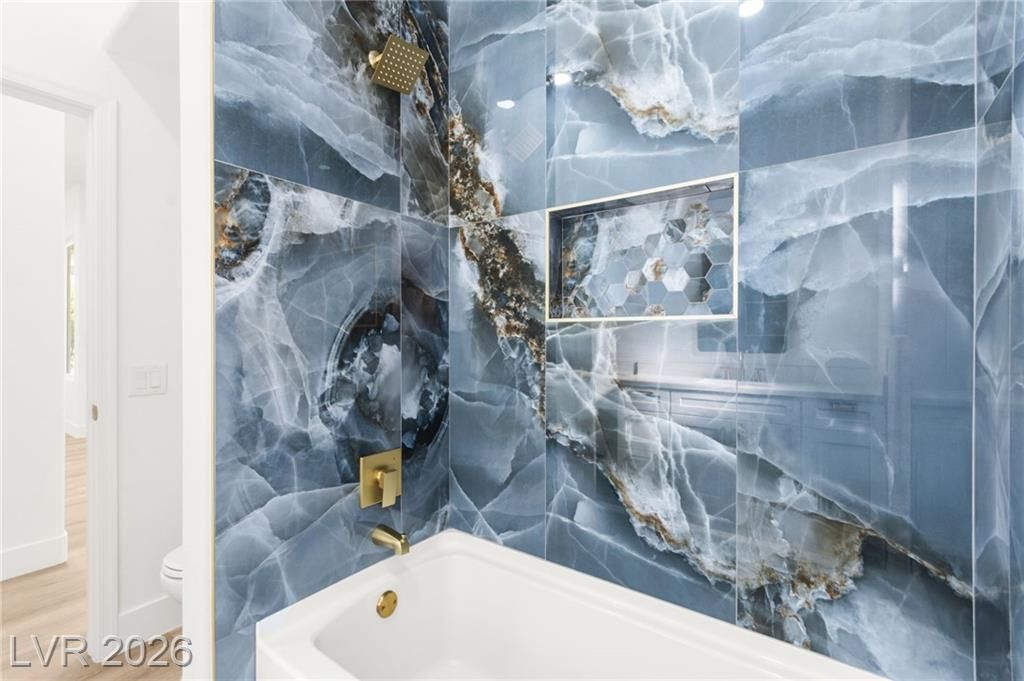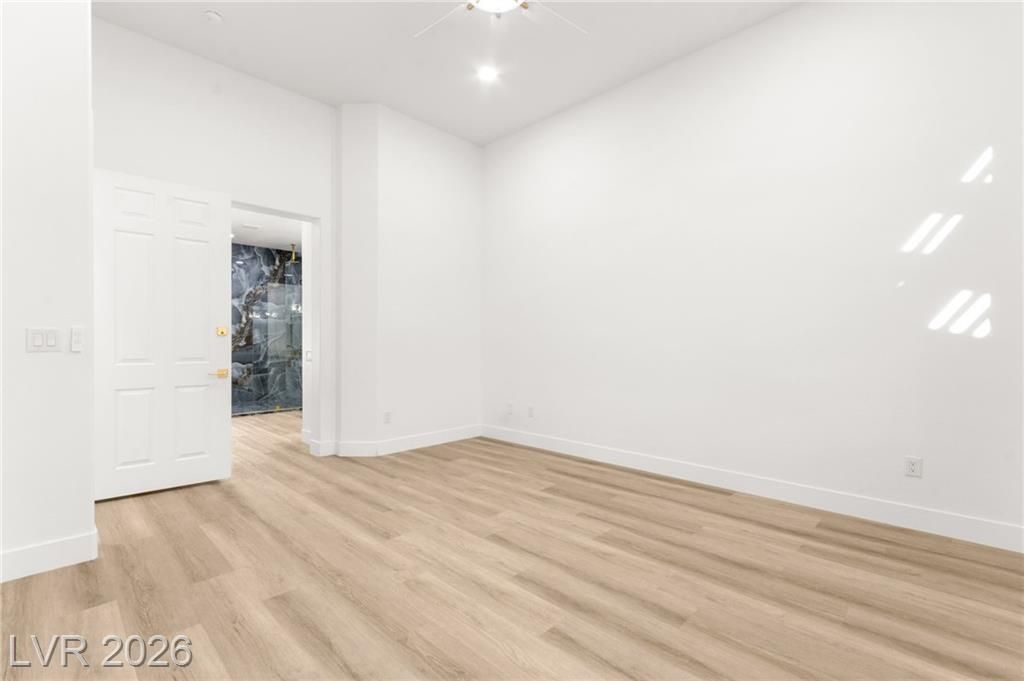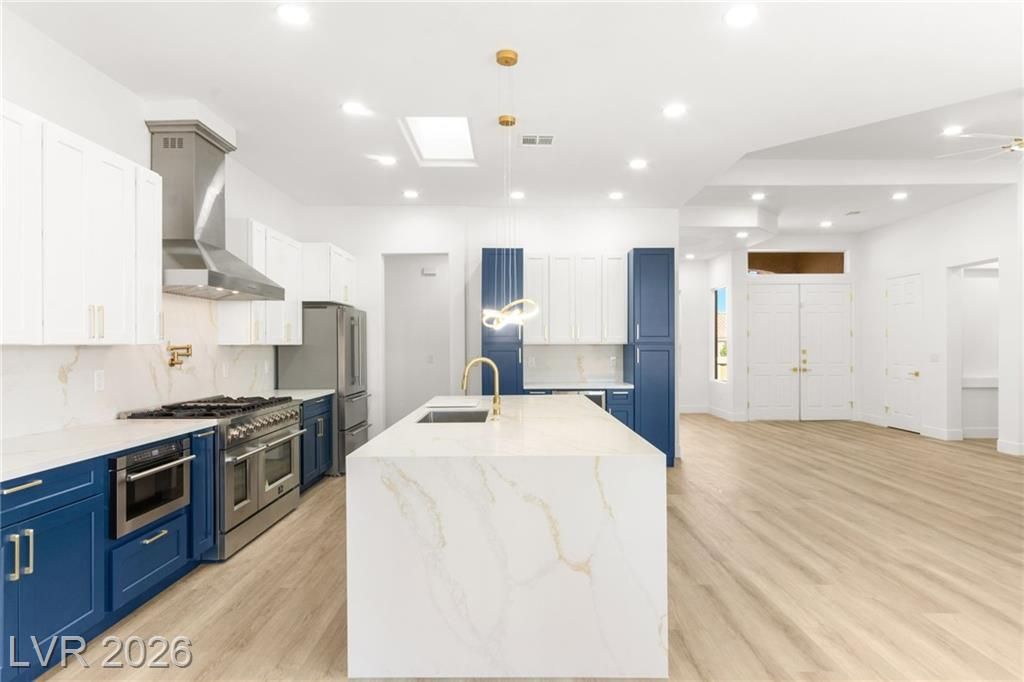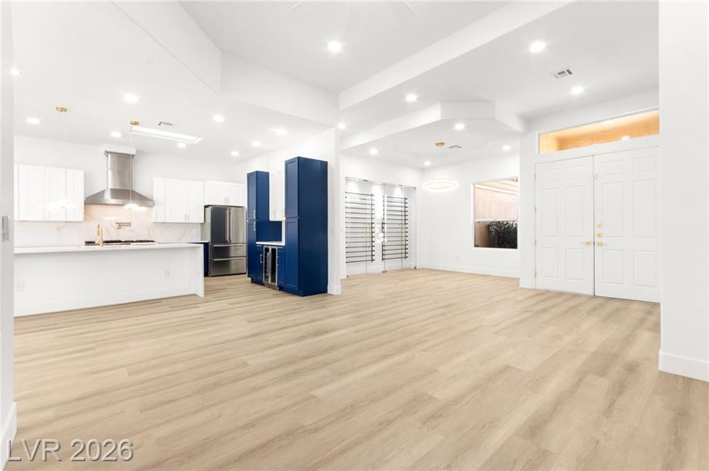 This stunning 2-bedroom, 2-bath, 2,161 sq. ft. home on the 11th hole of the Highland Falls Golf Course in Sun City Summerlin has been fully remodeled with modern designer finishes throughout. The open-concept layout features wide-plank flooring, sleek gold accents, and a chef’s kitchen with two-tone cabinetry, a quartz waterfall island, and professional-grade stainless steel appliances. The living area showcases a striking Belize Azul tile feature wall with a 100 inch electric fireplace and included Frame TV, while the dining area includes a custom glass-enclosed wine display. The primary suite bathroom offers dual vanities, gold fixtures, and a luxurious walk-in shower with dual shower 3 way shower heads, wrapped in matching Belize Azul tile. Enjoy golf course views from the covered patio or the private backyard putting green. Sun City Summerlin offers world-class amenities, golf, pools, fitness centers, and endless social activities. Cal today for a private showing!