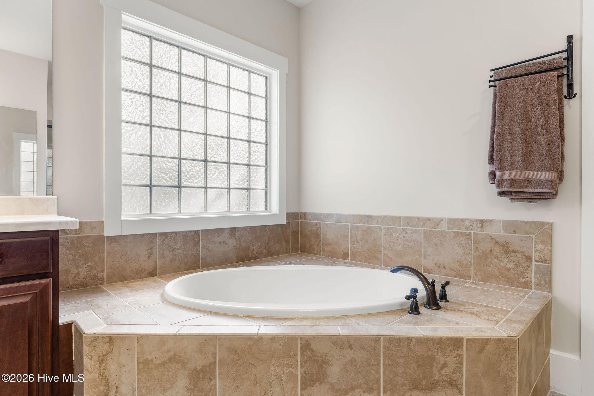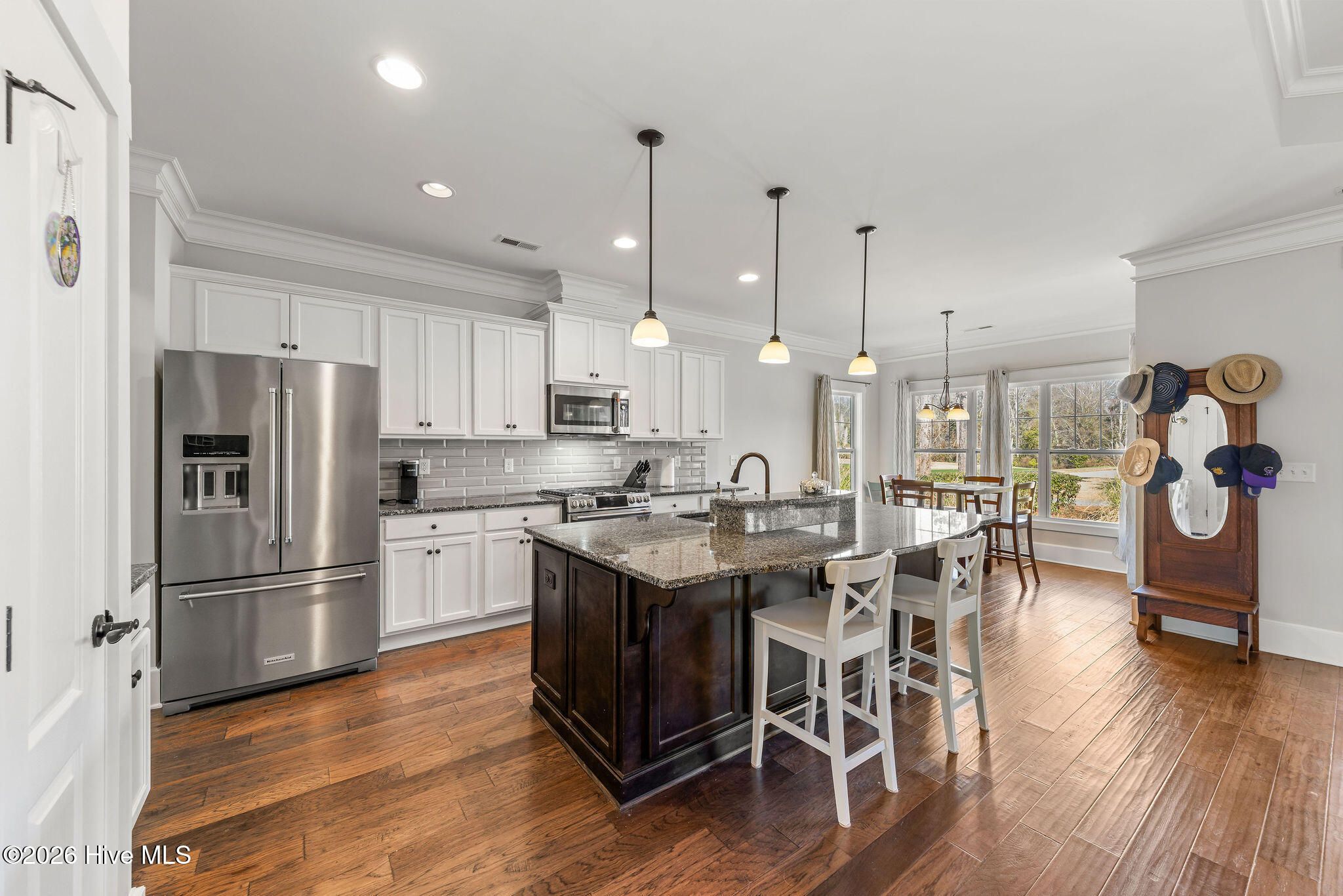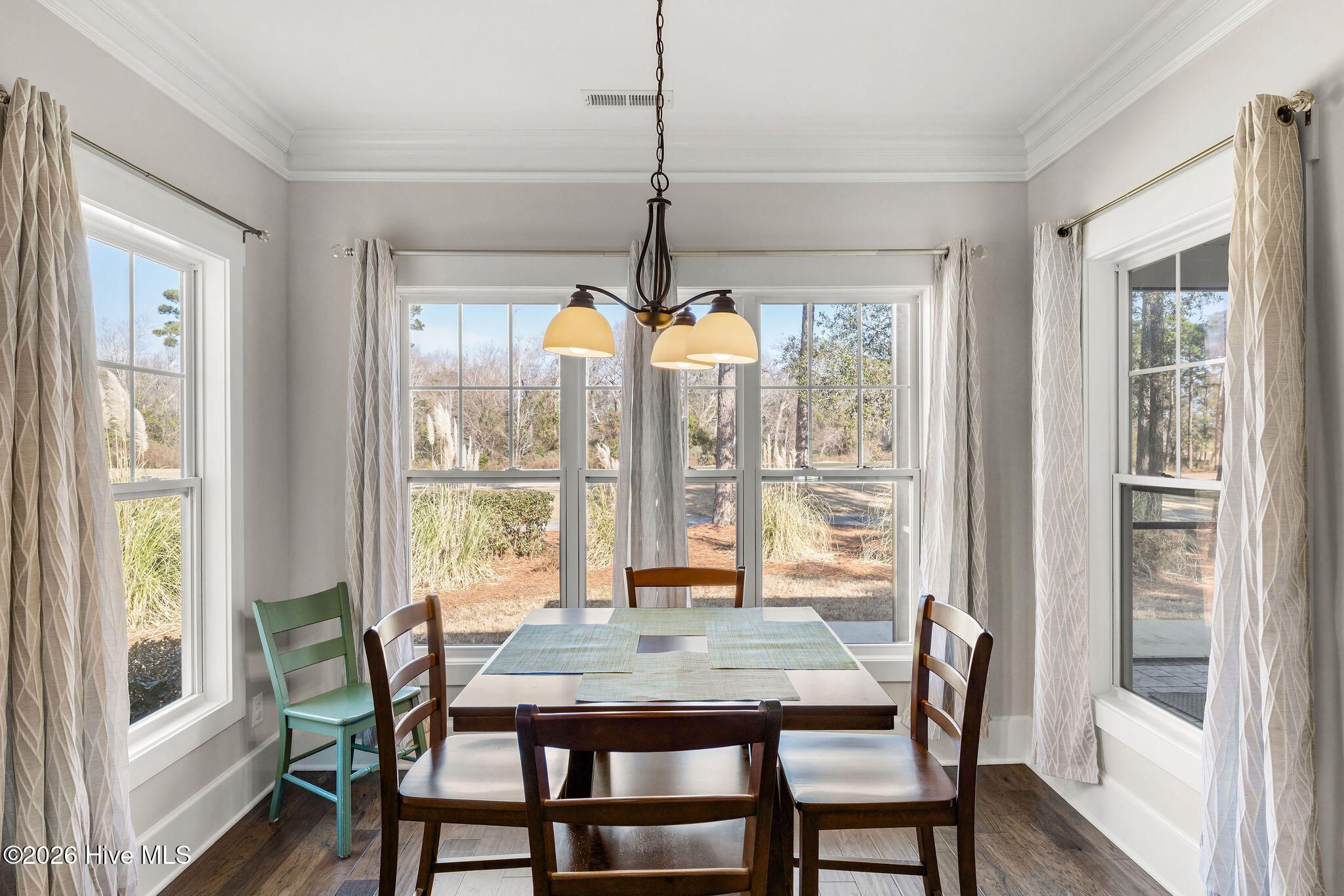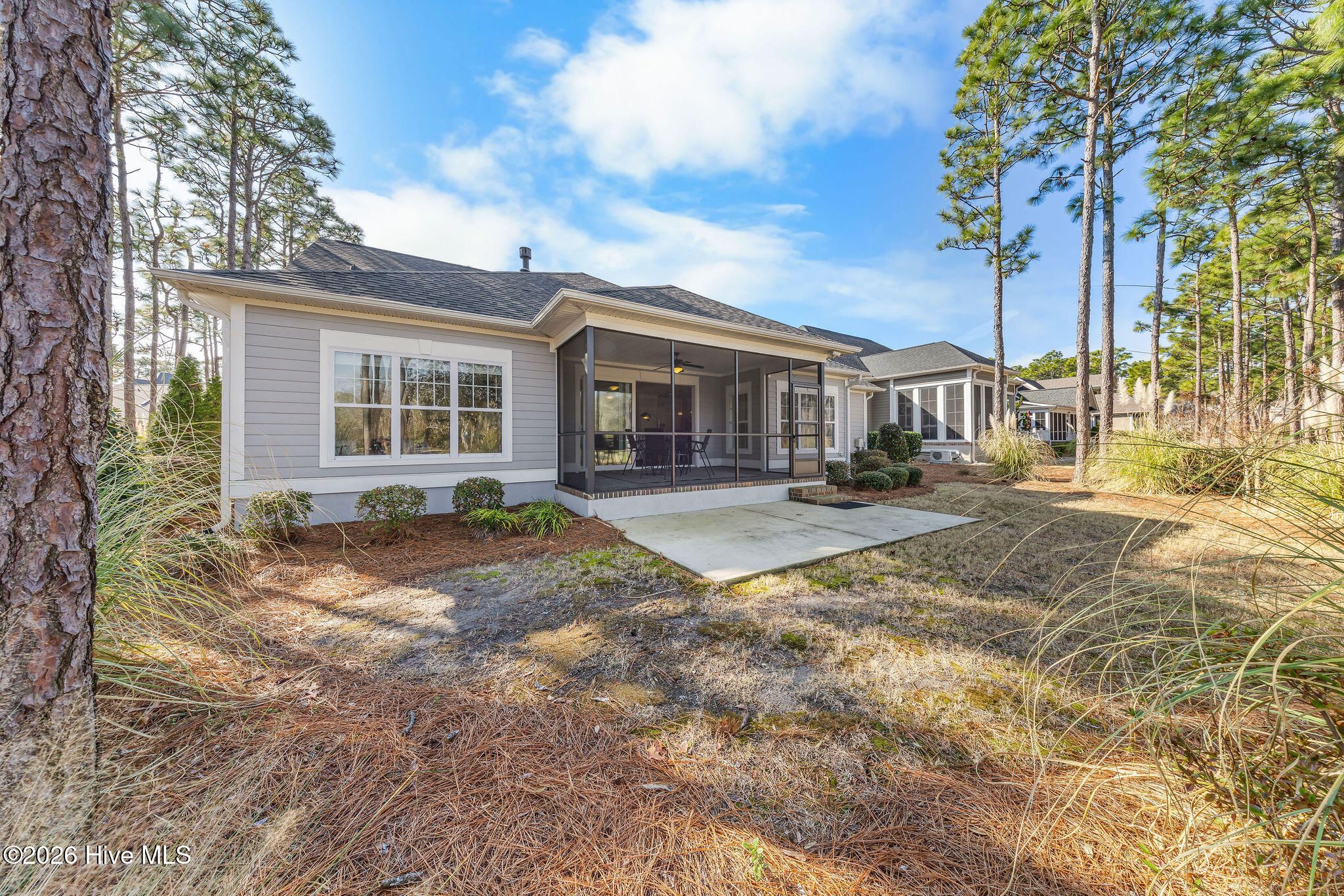 This stunning modern Low Country-style home is perfectly maintained and gently used, beautifully situated on the 12th green of the Members Club golf course in prestigious St. James Plantation. The pristine 4-bedroom, 3-full-bath residence offers sweeping golf and nature views, exceptional privacy, and numerous custom upgrades throughout. An expansive rocking-chair front porch welcomes you into an open-concept living space highlighted by hardwood floors, tray ceilings in the living and dining areas, elegant two-piece crown molding, and custom built-in cabinetry surrounding the fireplace. An enclosed room within the open living area features extended wainscoting and offers exceptional flexibility—ideal for a study, formal dining room, sitting room, or additional bedroom. The entire downstairs has been refreshed with new carpet and fresh paint, enhancing the home's move-in-ready appeal. The spacious kitchen is perfect for entertaining, featuring a large island, granite countertops, stainless steel appliances, a new gas cooktop with double oven, and a bright breakfast nook. Three-paneled telescoping sliders open to the screened porch, where you can enjoy spectacular views of the 12th hole. The owner's suite is privately located on one side of the home and features a spacious bedroom with a tray ceiling, serene golf course views, and direct access to the screened porch. The en-suite bath includes separate his-and-hers vanities, a large soaking tub, a barrier-free tiled shower with a built-in bench, and an oversized walk-in closet. Two additional bedrooms and a full bath complete the main level. Upstairs, a large bonus room—ideal as a bedroom, game room, or hobby space—includes a full bath and recessed lighting, making it perfect for guests or grandchildren. Additional features include a new water heater, laundry room sink, full walk-in attic storage, enclosed garage storage area, and Craftsman-style door headers throughout.