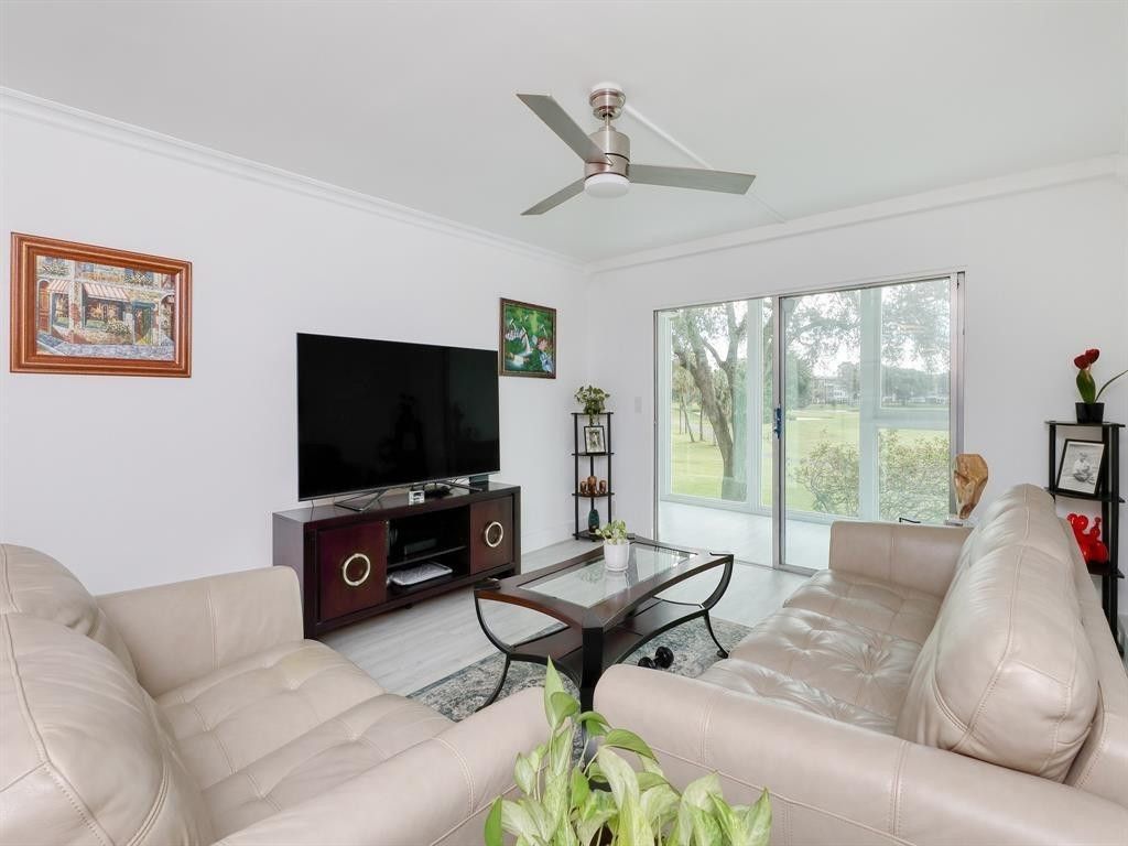 This fully renovated unit has captivating water vistas from its IMPACT glass-enclosed Florida Room, IMPACT WINDOWS & FRONT DOOR. Enjoy the spacious, open floor plan with abundant natural light. Open pass-thru and entryway. Quartz counters with Waterfall edge. SS Appliances, Custom Window Treatments. The bedrooms and bathrooms have been tastefully updated CUSTOM CLOSETS & DOORS. The master bathroom entry moved with barn doors. All SMOOTH CEILINGS with four ceiling fans. SHOWERS IN BOTH BATHROOMS (NO TUB), and the kitchen is a chef's dream. Master bedroom King-size bed. Large flat-screen TV in the living room. Enjoy the peaceful, serene Panoramic water and golf view. Great location & very quiet. Condo is completely furnished and is Turnkey 55+Good income and credit required