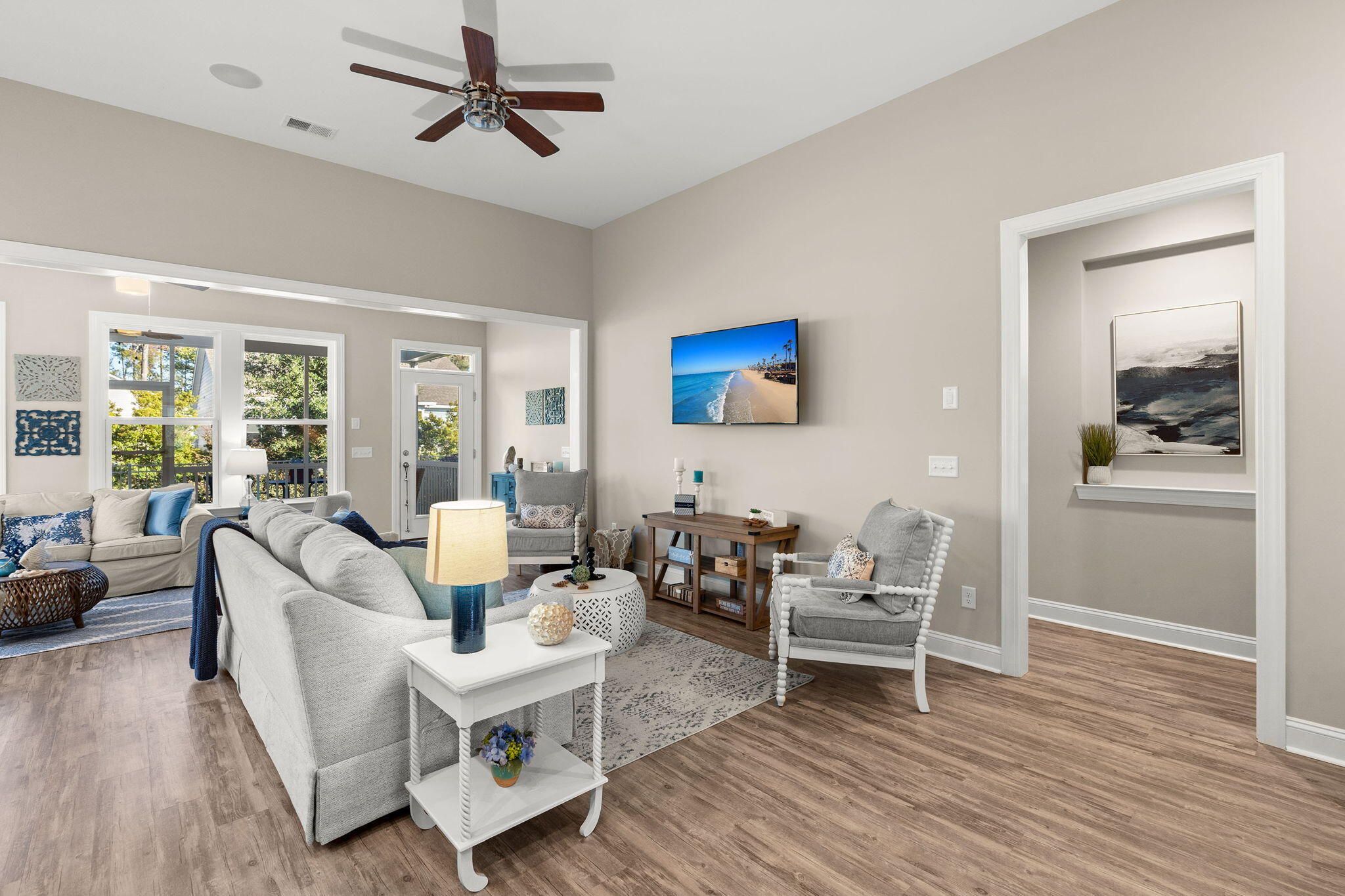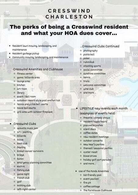 Located on a less traveled street, you can truly appreciate morning coffee or evening wine on the front porch. Deep in size, its a space to easily accommodate a handful of friends or neighbors.Stepping into the home, your eyes are drawn up to the soaring ceilings of the entry. LVP floors carry through the main living areas of the home while new carpet keeps your feet warm in the bedrooms. Natural light flows beautifully through this home compliments of the sunroom windows. The sunroom is a great upgraded feature of this home offering additional space to relax or entertain. The area overlooks the private backyard and screened back porch. You can seamlessly step from the sunroom, to the screened porch, to the additional poured patio. Both the screened porch and poured patio are generous in size. With great weather here in the Lowcountry, you can enjoy these two areas as an extension of your home all year long. Enjoy the sounds of serenading birds while your pups run in the fenced yard. This outdoor living space is such an amazing feature. An added bonus to this home is the Surround Sound offered on both the front and back porches along with the interior of the home. Back inside, you'll love the expansive granite kitchen countertop prep space, large island, soft close cabinetry, and hidden pull out waste can. The owners suite boasts tall tray ceilings, views of the back yard, soft new carpet, and an oversized walk-in closet. An added bonus to this home is the private door that connects the laundry room and owners walk-in closet. This is a semi-hidden door that allows the owner to move their laundry with ease. The owners bath offers a spacious zero entry shower, dual vanities, and an additional linen closet. The monthly HOA fee includes: Clubhouse o Social Room o Fitness Center o Aerobics & Yoga Studio o Men & Women's Locker Rooms o Billiards o Demonstration Kitchen o Arts & Crafts Room o Event/Party Room o Activity & Lifestyle Director Community - Resort Style Pool & Spa - Outdoor Fire Pit - Amphitheatre-Event Lawn - Grilling Area - Tennis Courts - Bocce Ball Courts - Pickle Ball Courts - Street Lights - Security Gates - Trash Service - Individual Home Lawn Care - Dog park - Additional resident pool in The Ponds - Numerous waters to fish - Community treehouse - Numerous play parks - Kayak launch - Coffee cottage - Pavilion and gas grills Cresswind is a premier, gated 55+ community located within the nature preserved community of The Ponds. It's much different than other 55 and over communities here in Summerville and Charleston. Its charm and beauty is just something special you have to see in person to really understand. Residents of Cresswind have access numerous miles of hiking trails, ponds for fishing, Schultz Lake, canoeing, wildlife watching, or even kayaking from the community kayak launch. Residents also enjoy the 10,000 square foot amenity center which includes a full-time social director, endless activities, a gym, demonstration kitchen, craft room, hot tub, resort style pool, and so much more. Many residents here enjoy the perks of 55+ living while their non 55+ relatives live within walking distance in the larger connecting neighborhood of The Ponds, just outside the gate. It's an excellent option for loved ones that want to live near each other, but not with each other. In addition to this amazing home and all that Cresswind has to offer, there is something to be said about the community of The Ponds as well, because it truly is a unique and special place. Many residents jokingly say it's much like a Hallmark movie. One which they enjoy having a role in. Zoned for highly desired DD2 schools, the Ponds is a community full of amenities and activities for all ages. Full of forest like woods with miles of trails to hike, unwind, and reconnect. This is the type of community where neighbors extend a hand to help. Where those same neighbors become friends, and grow to feel like family. If you are looking for a place to put down roots and grow, this is it. The Ponds is best known for its preserved natural beauty. Hundred year Oak trees positioned in the center of the community make for some insanely beautiful sunsets. If you are touring the home around that time, be sure to take a few minutes to find this spot. We guarantee that you won't leave without snapping a photo or two. These Oaks also set the stage for one of the most frequently used fields in the neighborhood. In the summer months, the HOA hosts food truck Fridays each month here and brings in live music. Neighbors of both Cresswind and The Ponds walk or drive their golf carts to this field, throw a blanket down and enjoy spirits, food trucks, and live music together. Just beside this field sits the custom built tree house. A naturesque playground built to allow all ages to climb up and into the branches of one of the hundred year old Oak trees. The community also offers a large zero entry swimming pool, a beautiful outdoor shelter with a fire place, picnic tables and 2 large gas grills, a community fire pit, a kayak launch, numerous ponds for fishing, and an amphitheater which is often used for events such as the neighborhoods Fourth of July festival and fireworks show. Other fun community activities include (subject to change): - Numerous golf cart parades - Annual Halloween "witch walk" (in-neighborhood pub crawl) - Youth fishing tournament with resident volunteers - Easter egg hunt - Bunco - Community 5k's - Weekly Tuesday evening food and dessert trucks - Fall festival with costume contest - Oyster roast & Chili cook off - Summertime Luau with live music, dancing, and food trucks - Oktoberfest - St. Patrick's Day parade and scavenger hunt - Holiday craft festival There are also several clubs within the community for residents to join (subject to change); a fishing club, a book club, and a photography club to name a few. The Ponds also boasts a historical farmhouse which serves as their amenity center. The farmhouse dates