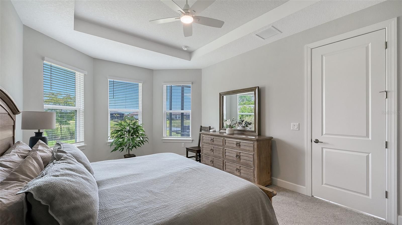 - Ceiling Fan(s), Eat-in Kitchen, Kitchen/Family Room Combo, Main Level Primary, Solid Surface Counters, Tray Ceiling(s)