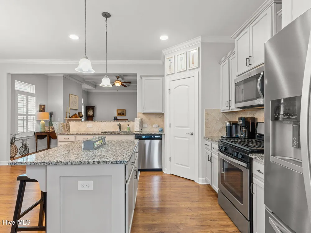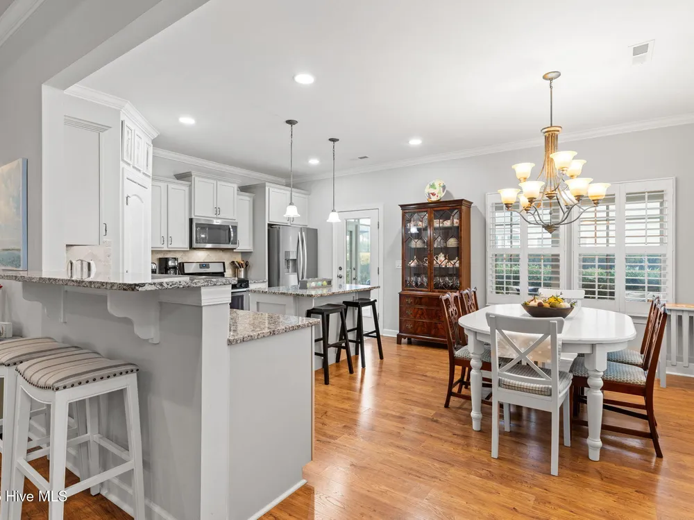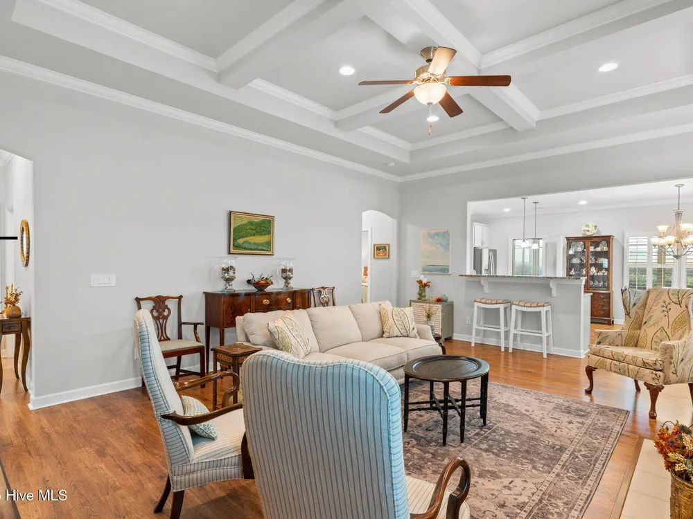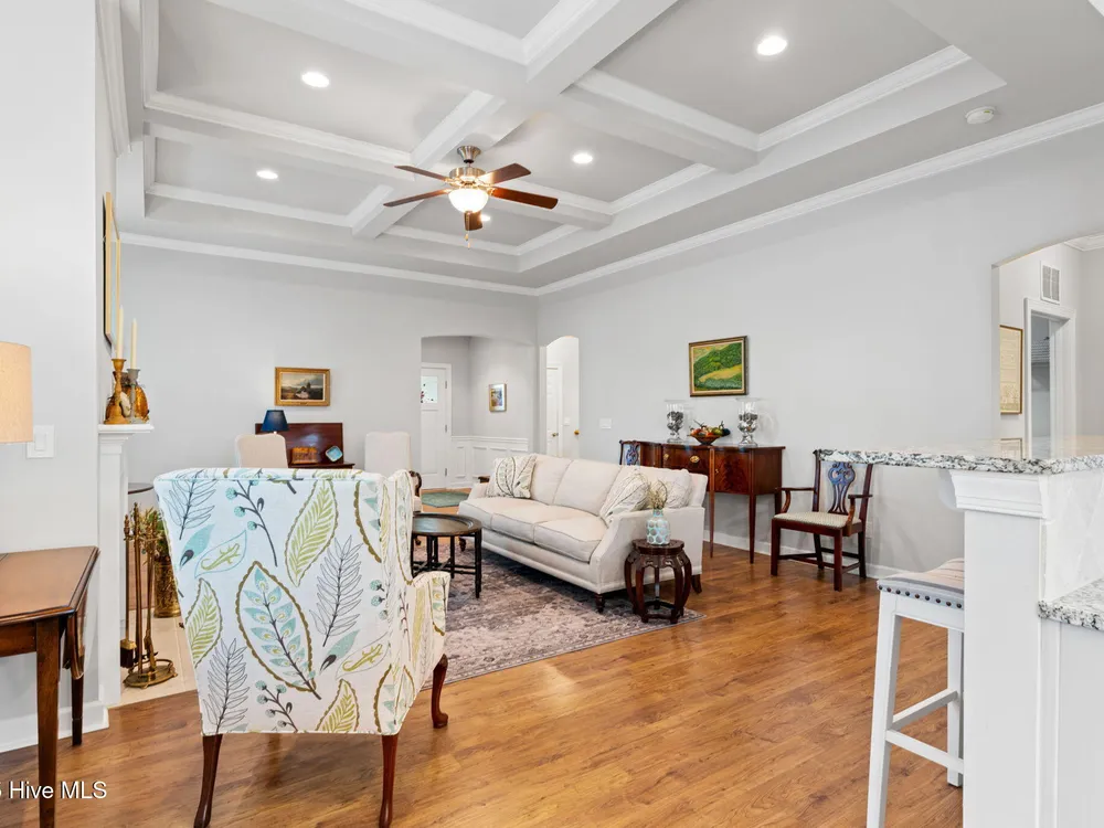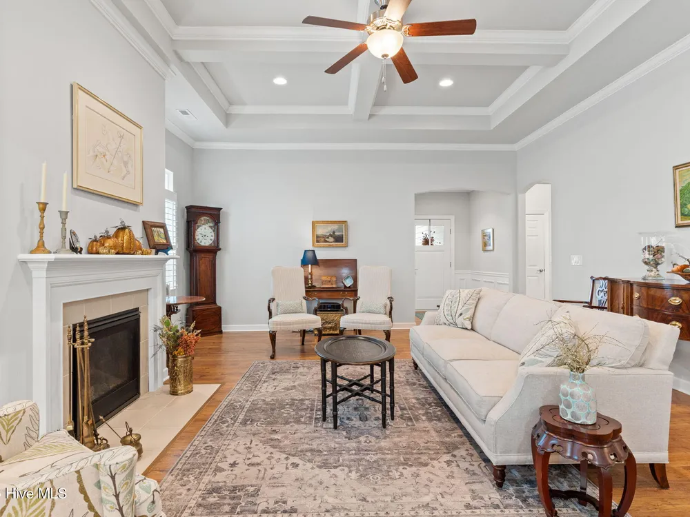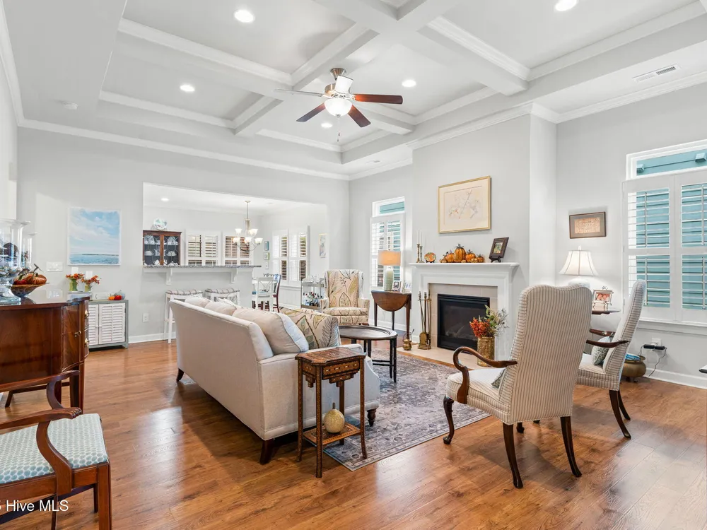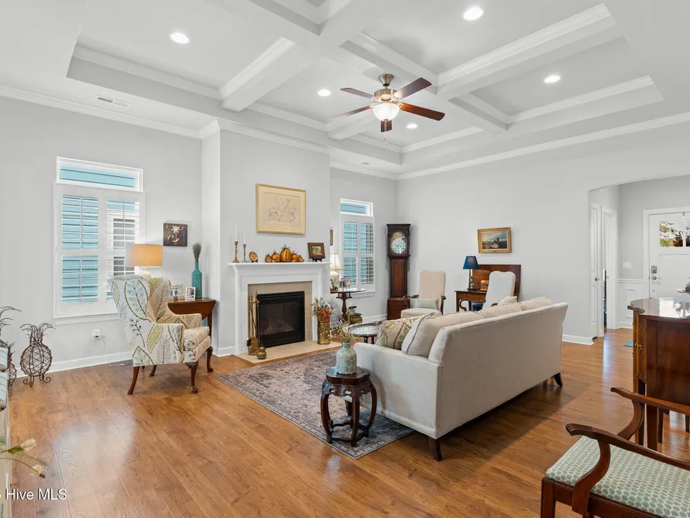 This luxurious home located in Brunswick Forest checks all of the boxes! The moment you walk through the front door, you will notice and appreciate how well the original owners have maintained this home. The foyer has upgraded picture frame trim work and the spacious living room features 11 foot coffered ceilings. There is a natural gas fireplace that anchors the living room. This functional floorplan is great for entertaining as the chef's kitchen is open to the living room with barstool seating. Upgrades in the kitchen include granite countertops, a tile backsplash and stainless steel appliances. There is ample cabinet space and a large walk-in corner pantry. While there are many awesome features in this house, perhaps the most impressive is the oversized primary suite. This bedroom is huge and easily accommodates any furniture configuration. The en-suite bath has two sinks in the granite vanity, a tile shower and a generous walk-in closet. There is a guest bedroom and an office on the first floor. The office room could be a den, game room, or converted to a fourth bedroom easily. Upstairs is a great guest suite complete with full bath. While no one enjoys laundry, this laundry room is worth mentioning, it has a folding table, shelving and a storage closet! The screened porch has EZ Breeze vinyl windows, tile floors and two fans, this will be one of your favorite rooms in the house. There is a grilling patio adjacent to the screened porch. The two car garage has an additional storage space under the stairs and there is ample parking in the driveway. The HOA fee includes lawn maintenance and access to resort style amenities including: 3 outdoor pools, an indoor pool, workout rooms, 3 fitness centers, tennis & pickleball courts, multiple parks, over 100+ miles of sidewalks and walking paths. There are countless social groups & classes. There is an 18 hole golf course available via membership. The location couldn't be better. You'll love living here!