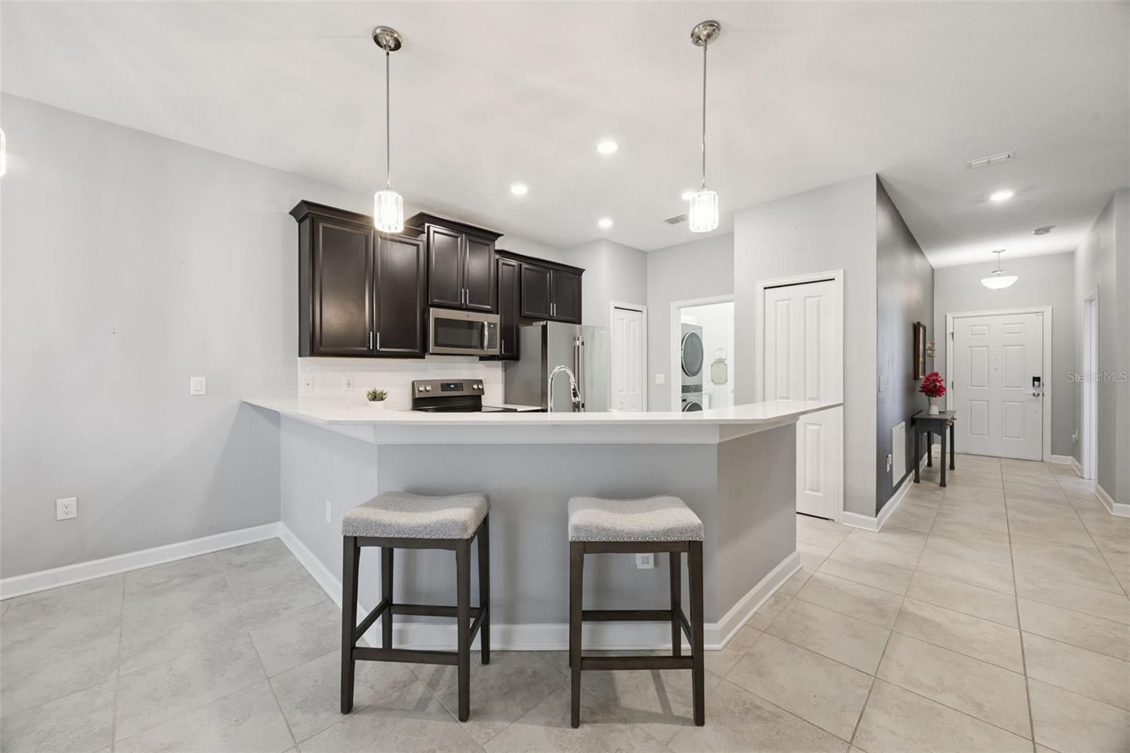 Situated in the desirable, maintenance-free gated community of Traditions, this gorgeous 2-bedroom, 2-bath villa with a flex room offers the perfect opportunity to enjoy a truly leisurely lifestyle. Designed for comfort, efficiency, and style, this home delivers the feel of single-family living with the convenience of condominium maintenance. Upon arrival, you’re welcomed by a charming screened-in front porch with pavers, setting the tone for the inviting interior. The well-equipped kitchen is a chef’s dream, featuring timeless 42" espresso-stained cabinetry with crown molding, brushed nickel hardware, and a classic subway tile backsplash. The breakfast bar—embellished with quartz countertops and pendant lighting—serves as a stunning focal point. Additional functional highlights include two closet pantries, recessed lighting, a USB receptacle outlet, and a stainless steel appliance package. The spacious great room is adorned with 17 inch porcelain tile flooring and oversized sliding glass doors that enhance natural light and create an open, airy feel. The open-concept layout also includes a charming dining area accented with custom pendant lighting—ideal for both everyday living and entertaining. The primary bedroom suite features luxury vinyl plank flooring and a large walk-in closet. The primary bathroom is beautifully appointed with a comfort-height vanity featuring pull-out shelves, quartz countertops, dual sinks, and a tiled walk-in shower with a glass enclosure. This eco-friendly home offers impressive energy-efficient features, including foam-filled block wall insulation, a programmable thermostat, Energy Star–rated appliance package, Low-E double-pane windows, and an irrigation system. Additional Features, Laundry room with cabinetry and high-efficiency washer & dryer, Hallway linen closet, Alarm system, Gutters, Paved walkway and driveway, One-car garage with garage door opener and overhead storage rack. As part of the active 55+ community of Traditions, you'll have access to a lakefront clubhouse, a boat ramp and dock, a heated pool and spa, a fitness center, a dog park, tennis courts, bocce ball, pickleball, a billiard room, shuffleboard, and much more. Experience the feel of single-family home living with the convenience of a condominium lifestyle. Monthly fees cover exterior maintenance—including roofs and exterior painting—plus cable (three cable boxes included), internet, lawn service, irrigation water, and exterior building insurance, ensuring a truly worry-free lifestyle. Conveniently located near shopping, restaurants, Legoland, Bok Tower Gardens, and major routes, this exceptional villa offers the perfect blend of comfort, convenience, and carefree living. This home is being sold partially furnished.
