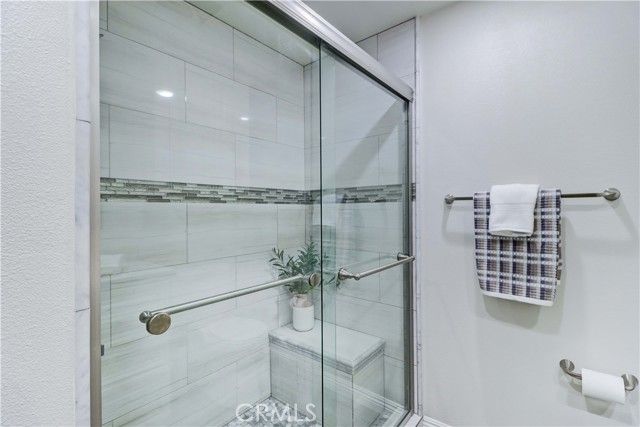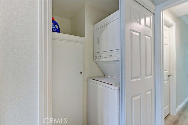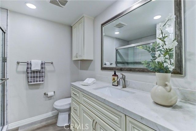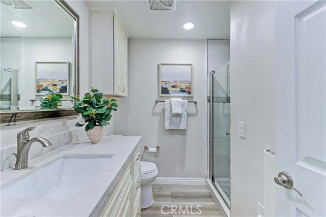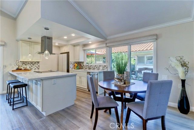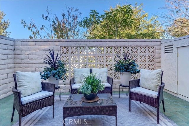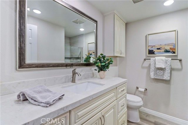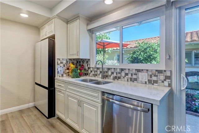 Remodeled "San Clemente" condo cottage perfectly situated inside Gate 7 on a quiet interior street with large greenbelt right outside the front door. Enjoy the beautiful walk-up full of gorgeous trees and grass - a nice yard without the maintenance! Walk right in to this stunning remodel featuring vinyl plank flooring, smooth ceilings, crown molding, recessed lights, dual pane windows with custom roman blinds, washer/dryer and paneled interior doors. Living/great room is enhanced with a vaulted ceiling, recessed lighting and contains access to the private patio area with good-sized storage shed. The open kitchen has a stainless hood over the breakfast bar providing a beautiful focal point to complement the quartz counters, tile backsplash, recessed and pendant lighting, timeless off-white cabinets, stainless appliances and modern refrigerator. Enjoy all the additional storage under the breakfast bar. This area has an east-facing window over the kitchen sink and slider out to the shared courtyard. Guest bedroom has ceiling fan, mirrored closet door and sunny southern outlook. The adjacent remodeled guest bathroom provides a beautiful space for your visitors including large vanity with ample counter space and gorgeous tiled walk in shower with glass enclosure. Continuing down the h