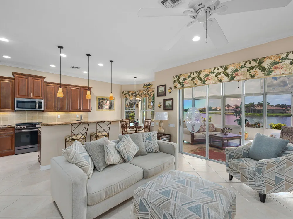 This is the Diamond you've been waiting for! Imagine relaxing with your morning coffee and enjoying the sun rise over the serene lake view every day. In excellent condition and meticulously maintained, this home was designed with entertainment in mind. The inviting Florida room was added in 2017. The island kitchen features granite counters and stainless appliances. Accordion shutters and new A/C in 2021. From the stately gated entry and tree lined streets to the world class clubhouse and sports center, Cascades has it all. This active, friendly 55 plus offers a gorgeous lobby, card rooms, arts,crafts, fitness center with saunas, library and ballroom. Outside you will find a resort style pool, spa, 9 hole executive golf course, tennis courts, bocce courts, shuffleboard and pickleball.