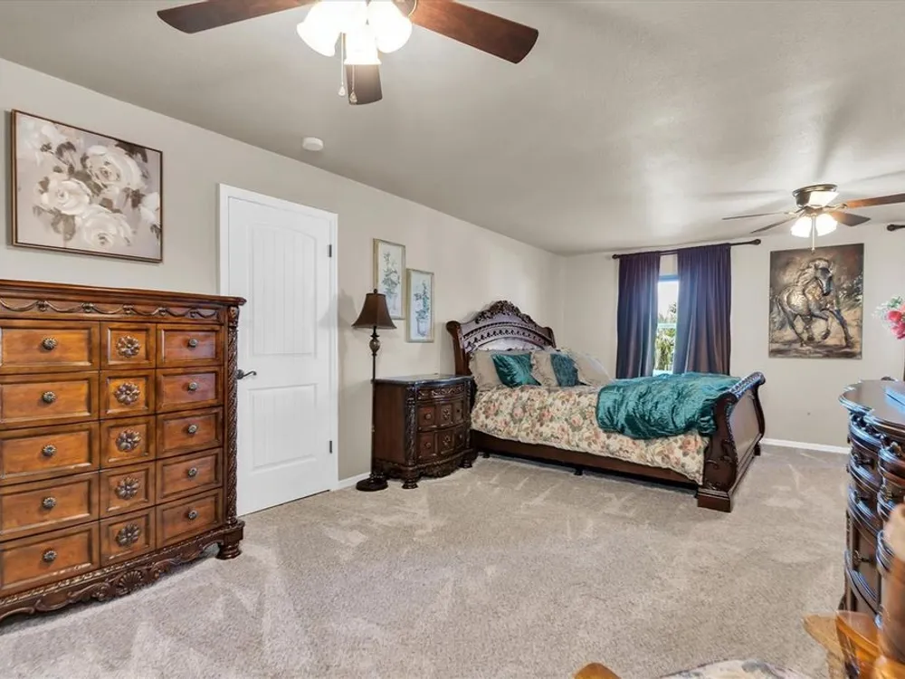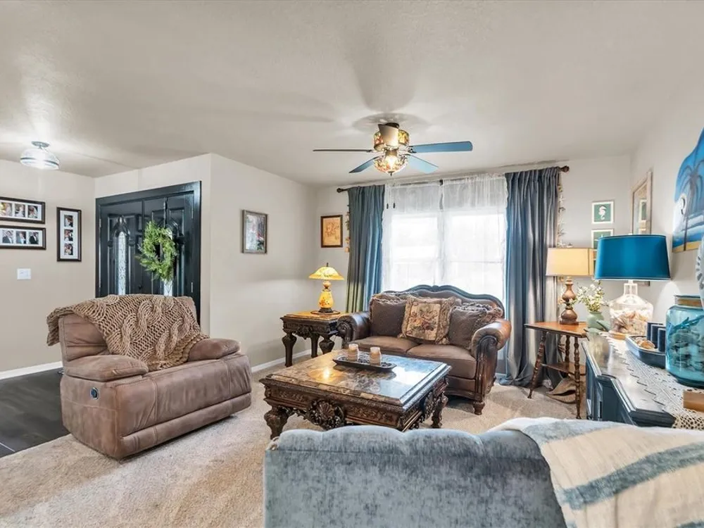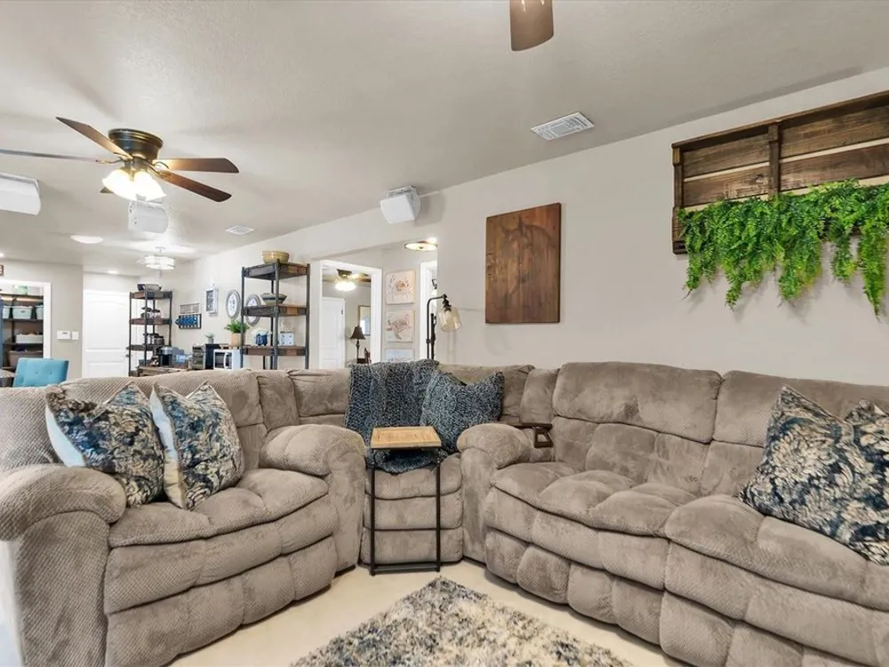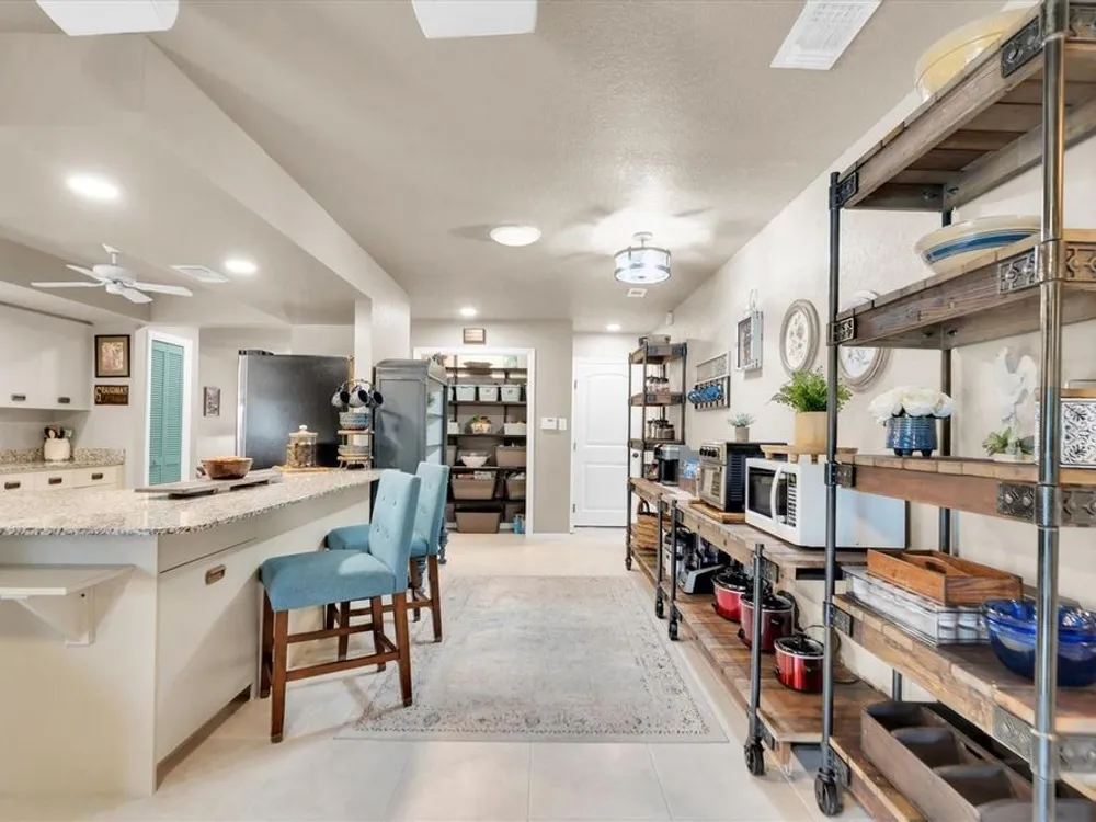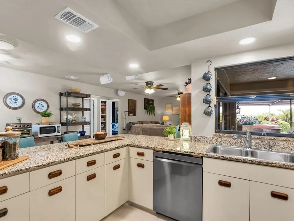 - Ceiling Fan(s), Eat-in Kitchen, Kitchen/Family Room Combo, Main Level Primary, Solid Surface Counters, Split Bedrooms, Thermostat, Walk-In Closet(s), Window Treatments