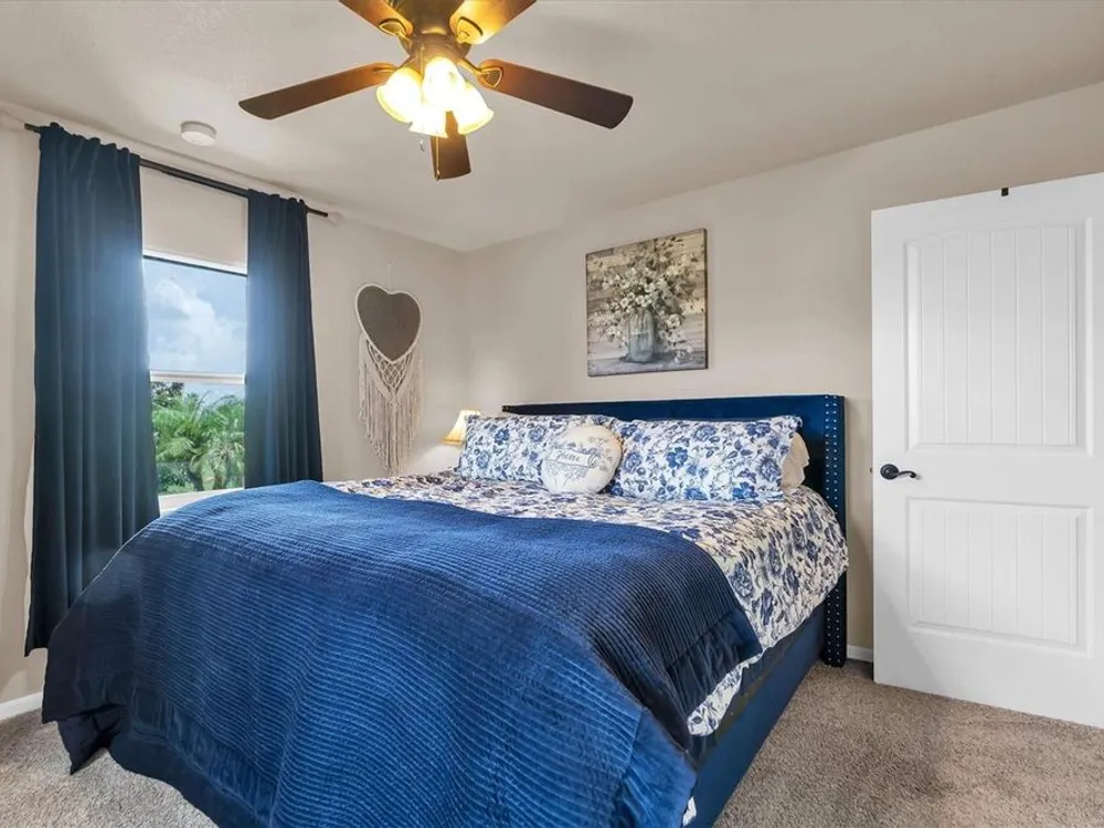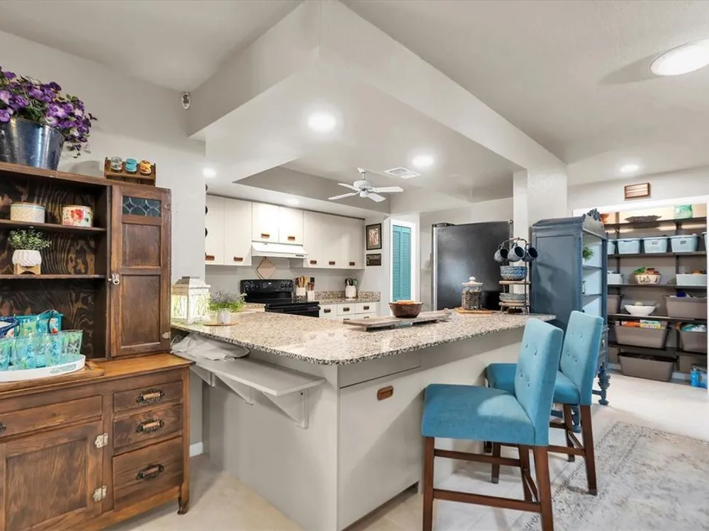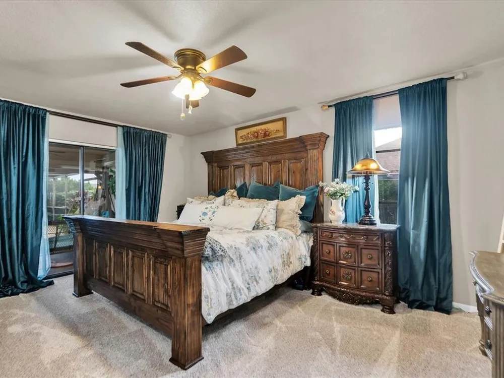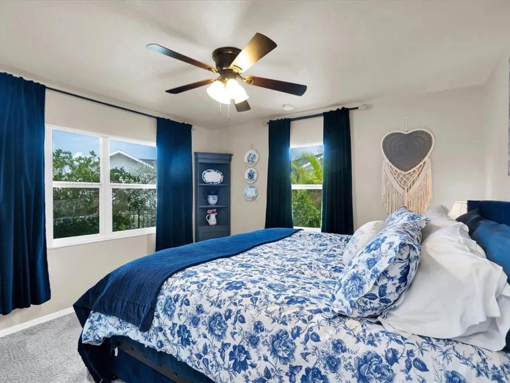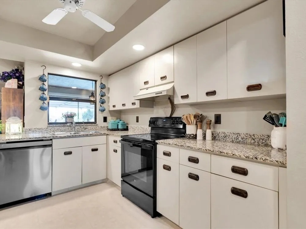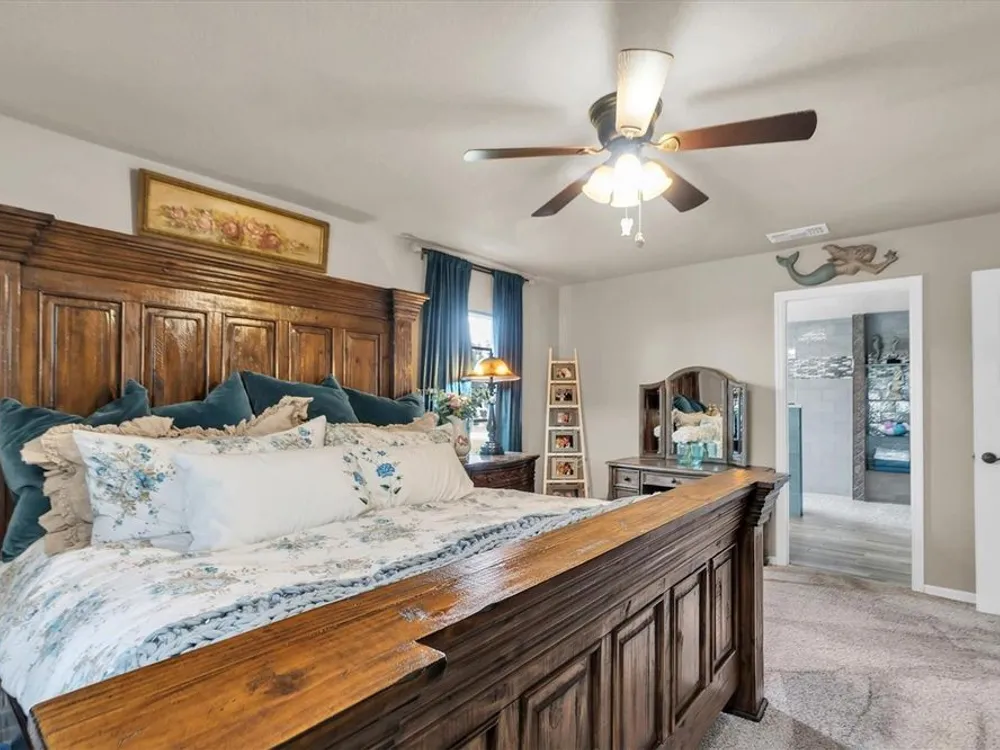 - Ceiling Fan(s), Eat-in Kitchen, Kitchen/Family Room Combo, Main Level Primary, Solid Surface Counters, Split Bedrooms, Thermostat, Walk-In Closet(s), Window Treatments