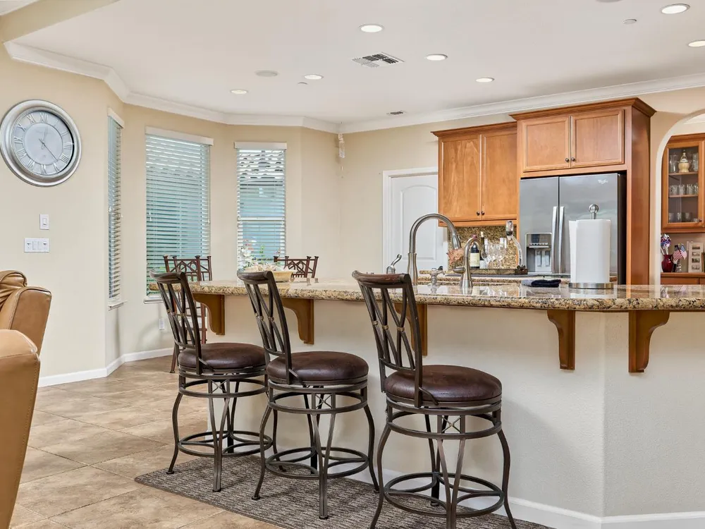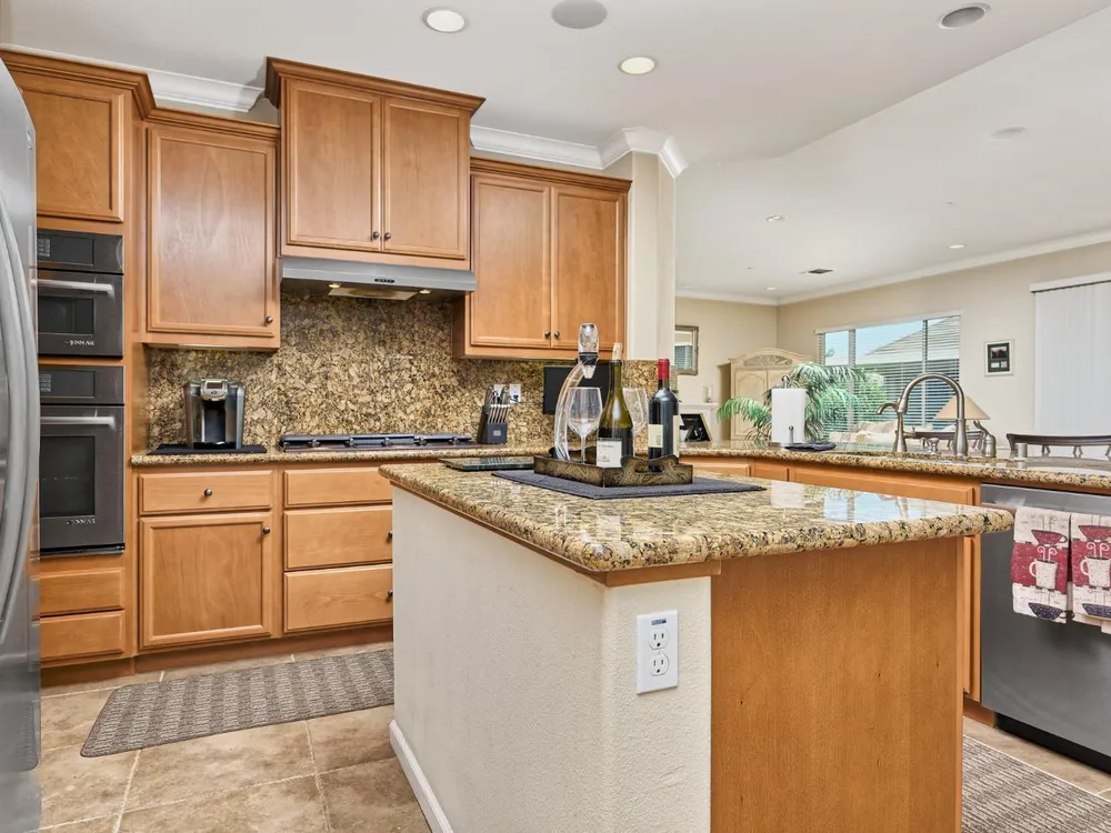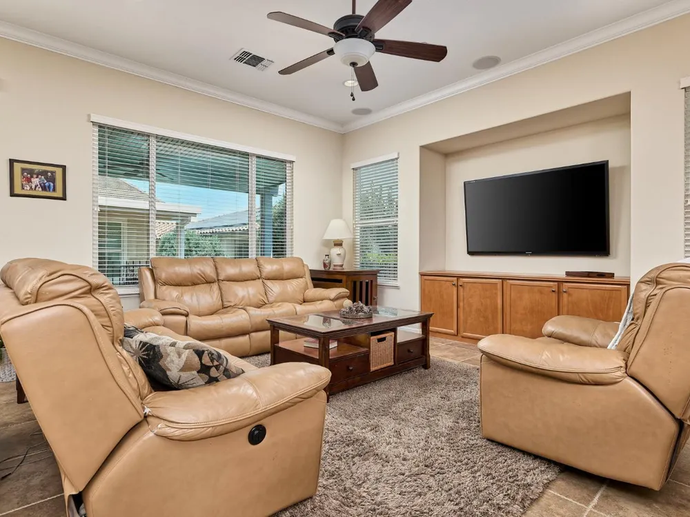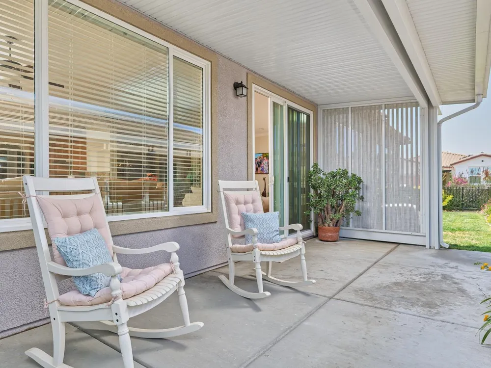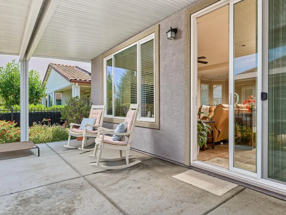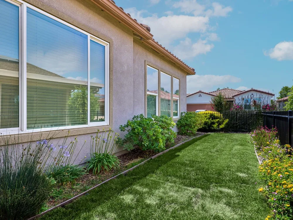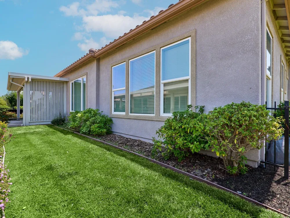 Beautifully appointed Yountville style home for sale in Trilogy with tons of upgrades including: Crown Molding throughout, Surround Sound, Large Tile throughout most of the home, Covered patio and fenced backyard, Built-in cabinet at TV niche, 5 burner Gas Cooktop, Newer Maytag Washer/dryer (2024) and refrigerator also included. Home also has large pantry, butler pantry, gas fireplace, 2 full Bedrooms, Den, 2.5 baths, 3 car garage, corner location with beautiful landscaping. Solar free to 2032.