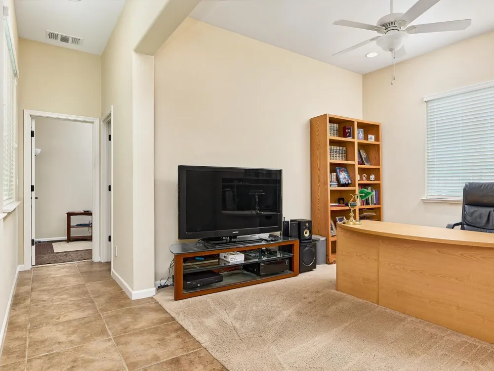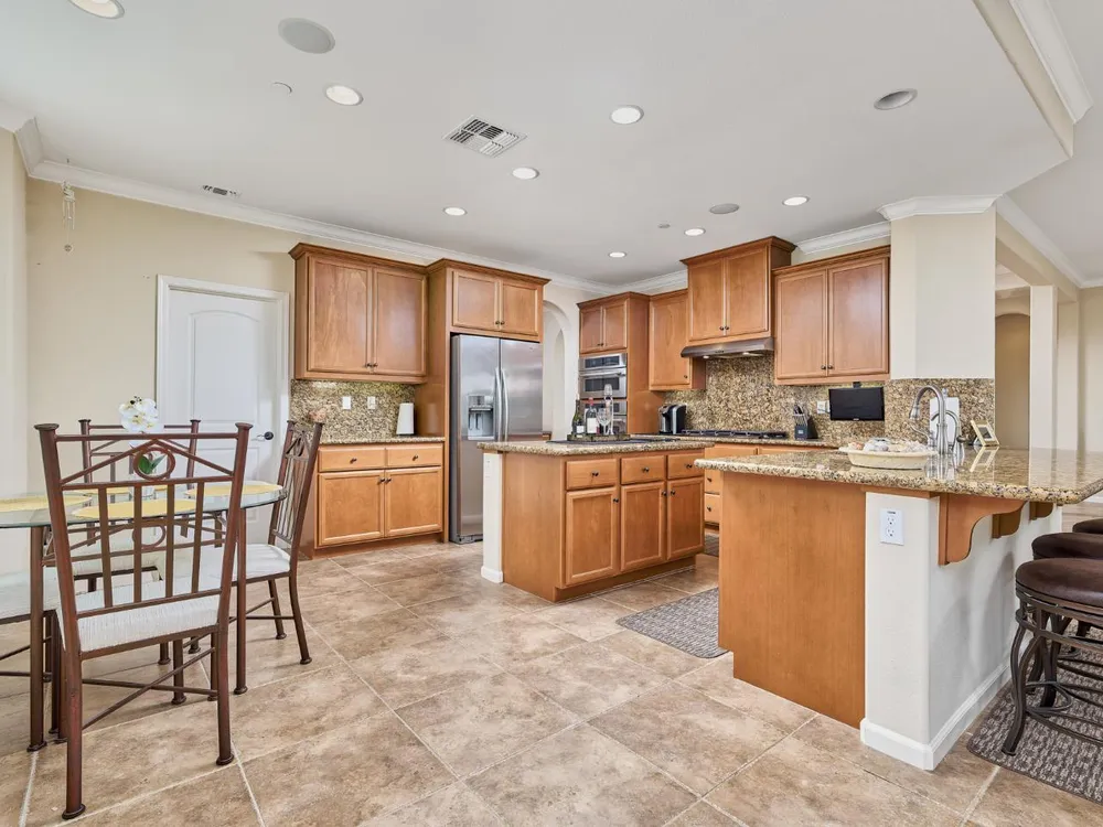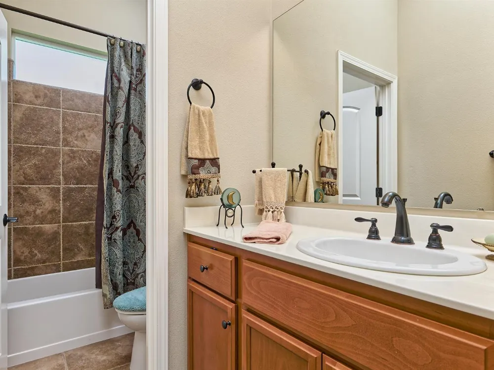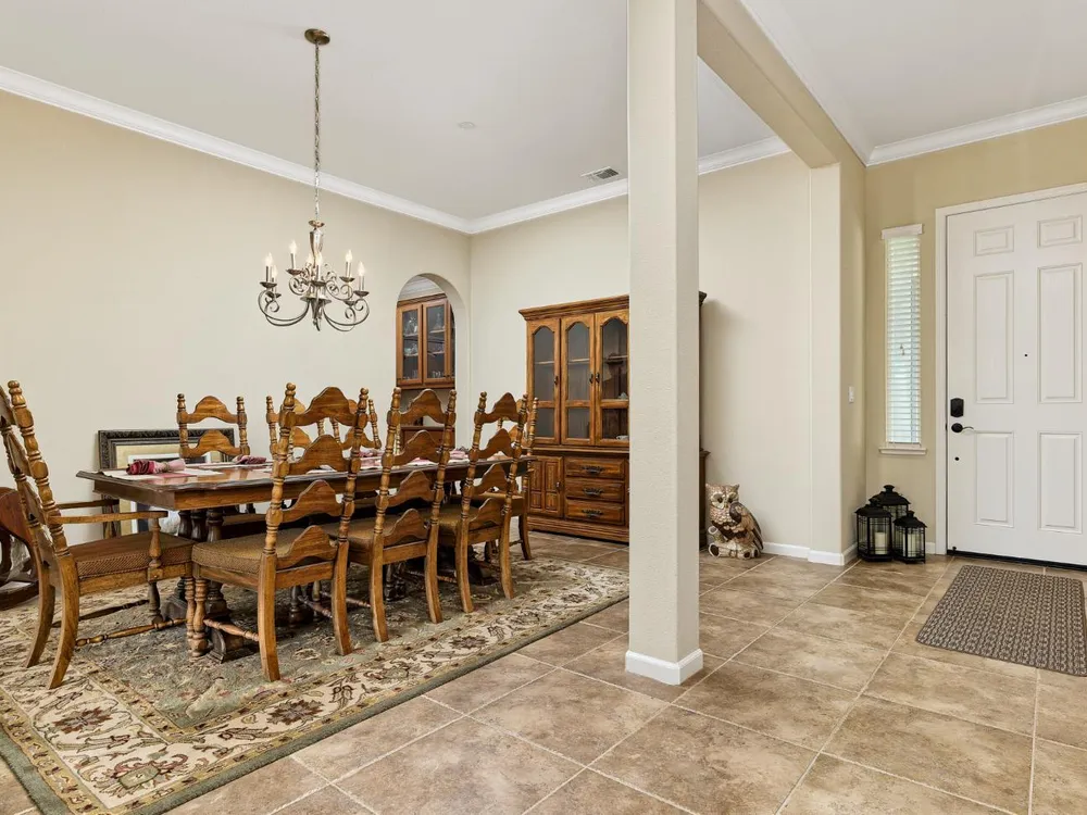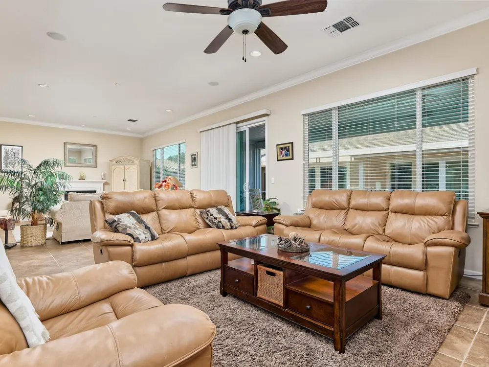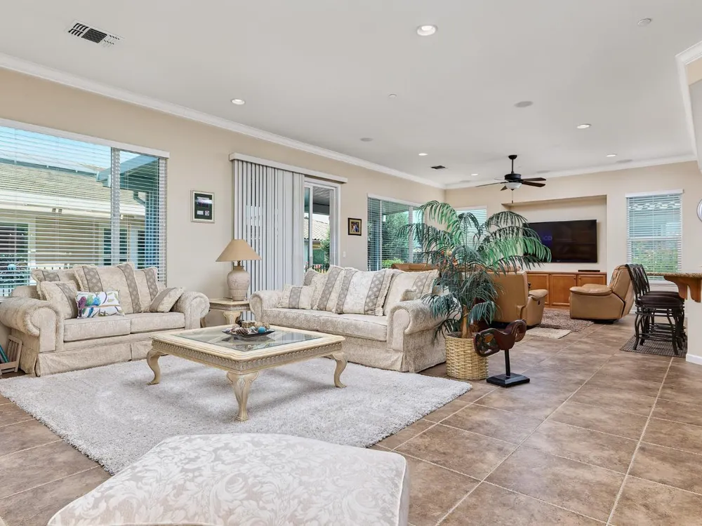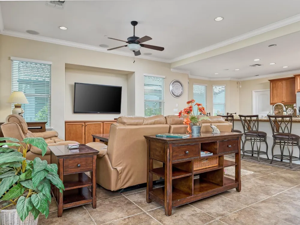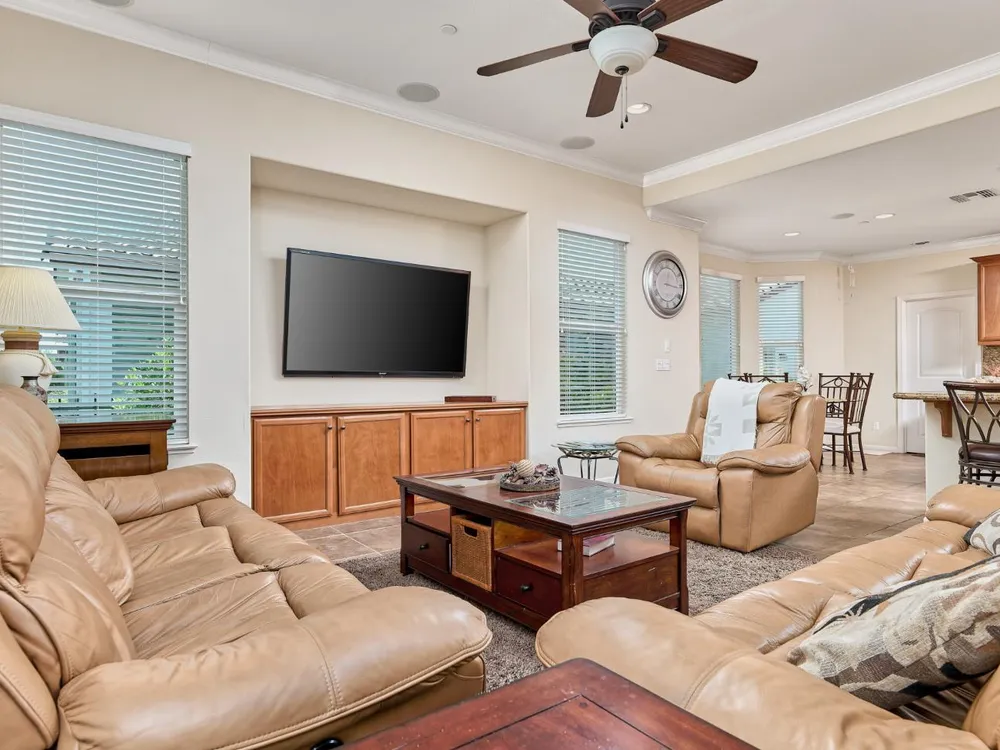Beautifully appointed Yountville style home for sale in Trilogy with tons of upgrades including: Crown Molding throughout, Surround Sound, Large Tile throughout most of the home, Covered patio and fenced backyard, Built-in cabinet at TV niche, 5 burner Gas Cooktop, Newer Maytag Washer/dryer (2024) and refrigerator also included. Home also has large pantry, butler pantry, gas fireplace, 2 full Bedrooms, Den, 2.5 baths, 3 car garage, corner location with beautiful landscaping. Solar free to 2032.