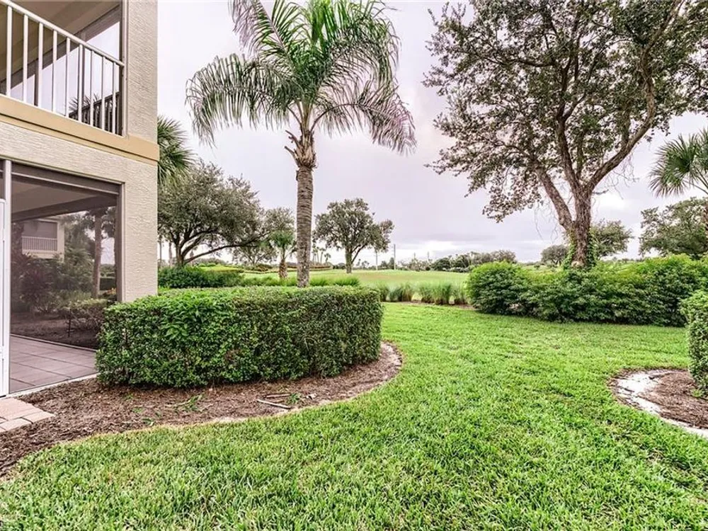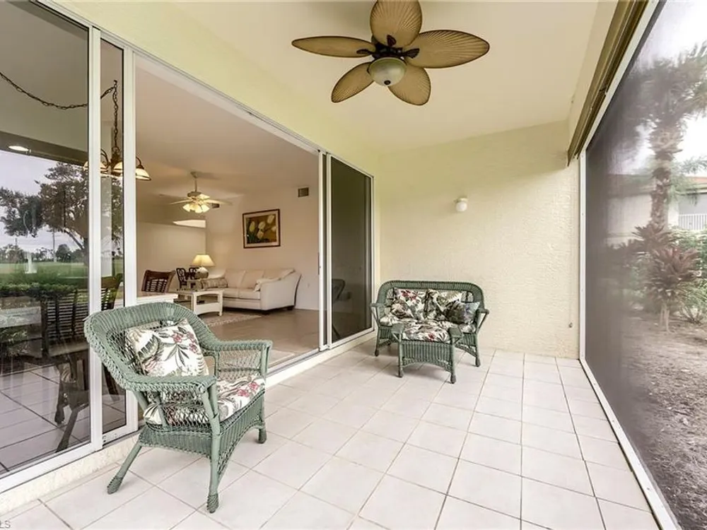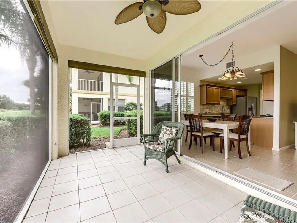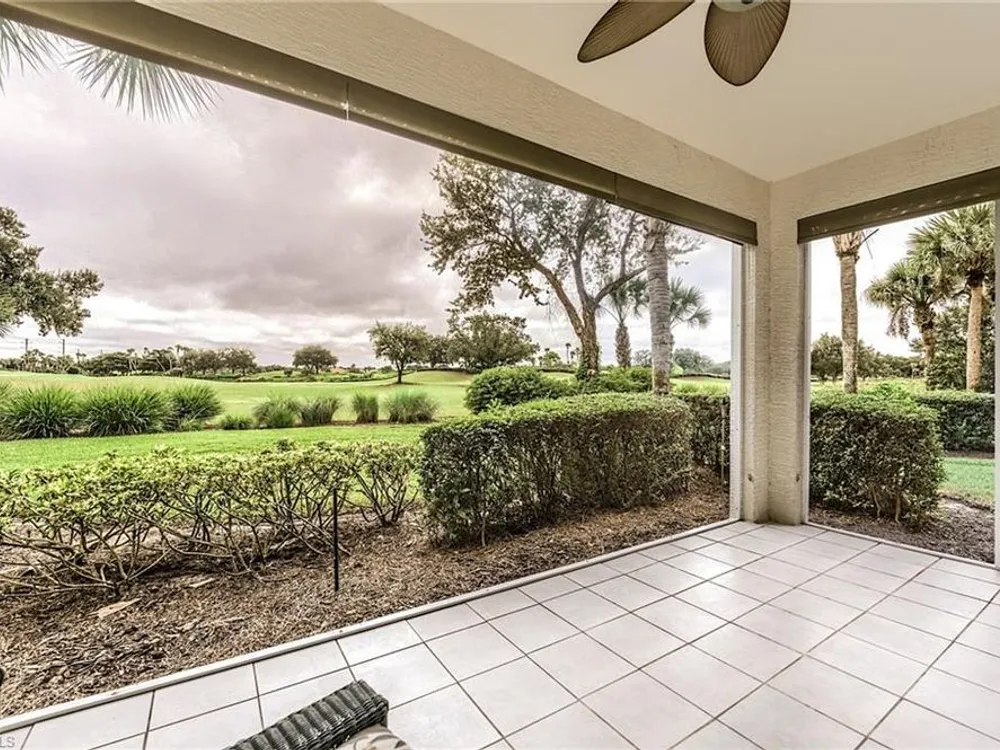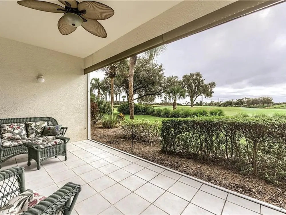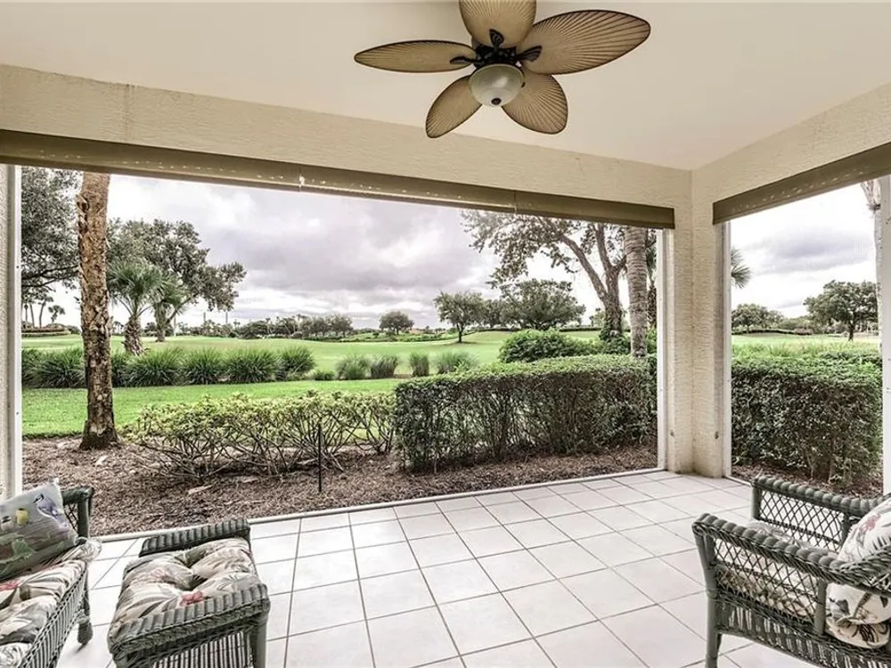 If you're looking for an incredible condo, you're in luck! This furnished downstairs condo with attached 2 car garage has a magnificent view of the putting green on the 4th hole of the Old Orange golf course. On top of that, the condo has been recently renovated so you don't have to worry about doing a bunch of remodeling after you move in. The kitchen has been updated with new granite counters, tile backsplash, new stainless steel appliances and sink. Other features in this 2 bedroom plus den/2 bathroom condo include plantation shutters on most windows, new tile plank flooring in the master bedroom and bathroom, freshly painted interior of the condo, new lanai cage with large picture window screen giving you an enhanced view of the beautiful Old Orange golf course, sun screens on the lanai, cabinets installed in the laundry room for extra storage, new garage door opener and compression springs and new insulated garage door to help keep out the Florida heat! Don't spend another winter up north freezing and worrying about icy roads when you could be sitting on your lanai with your morning coffee, watching another breathtaking sunrise over the golf course. Your biggest dilemma living in Verandah is trying to figure out how you're going to spend your day. Will it be golf, tennis, pickleball, walking or riding your bike on our 9 miles of paths, kayaking, swimming or getting a workout in our state of the art attended fitness center? The choices are endless!