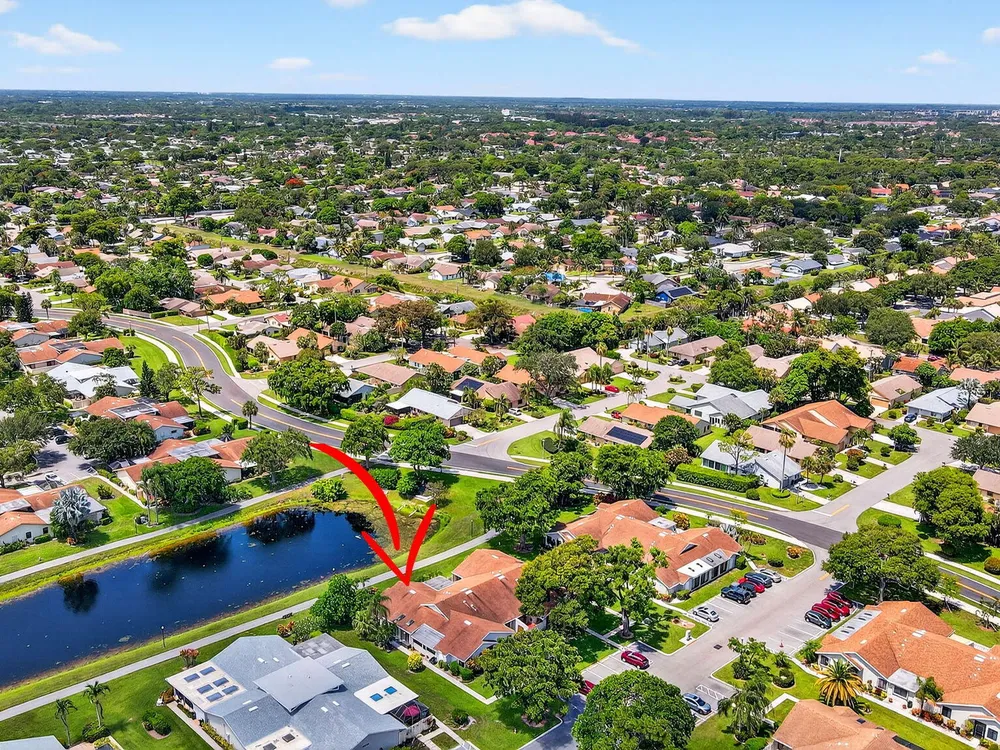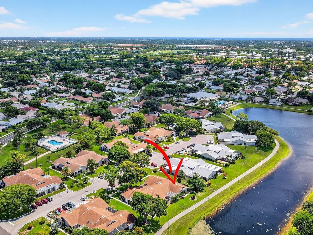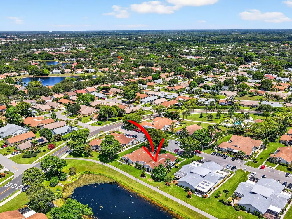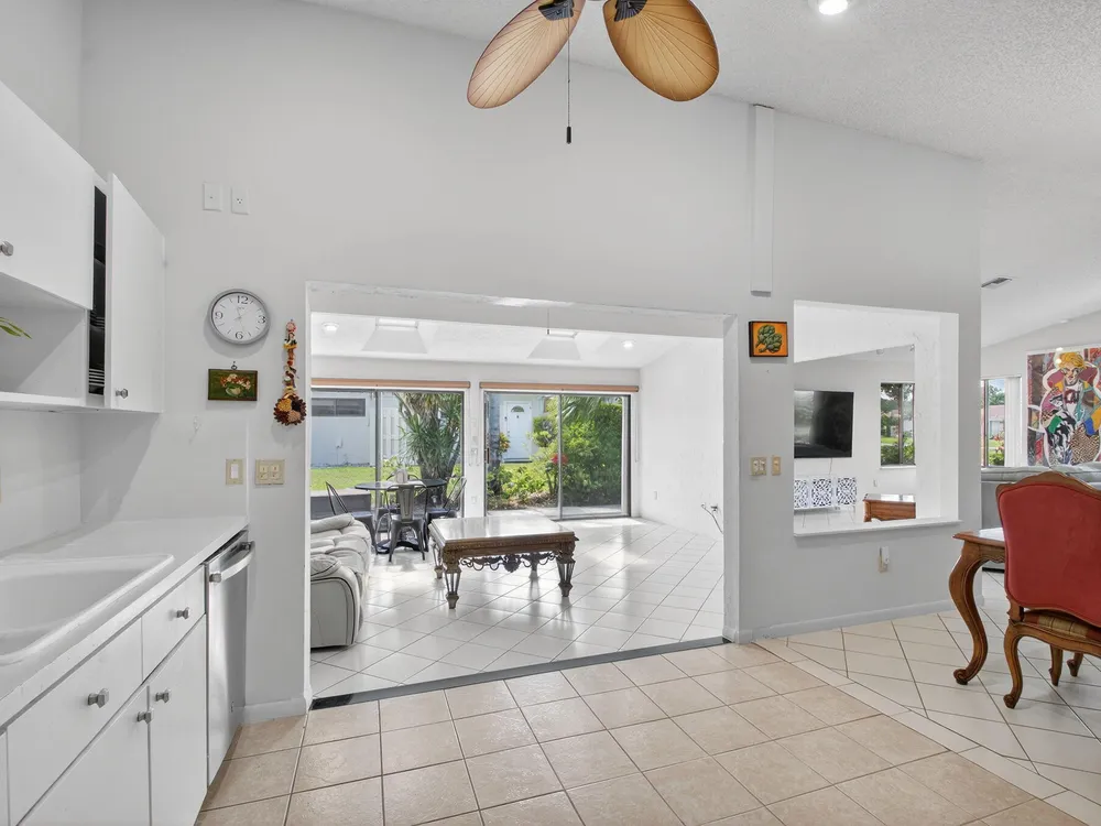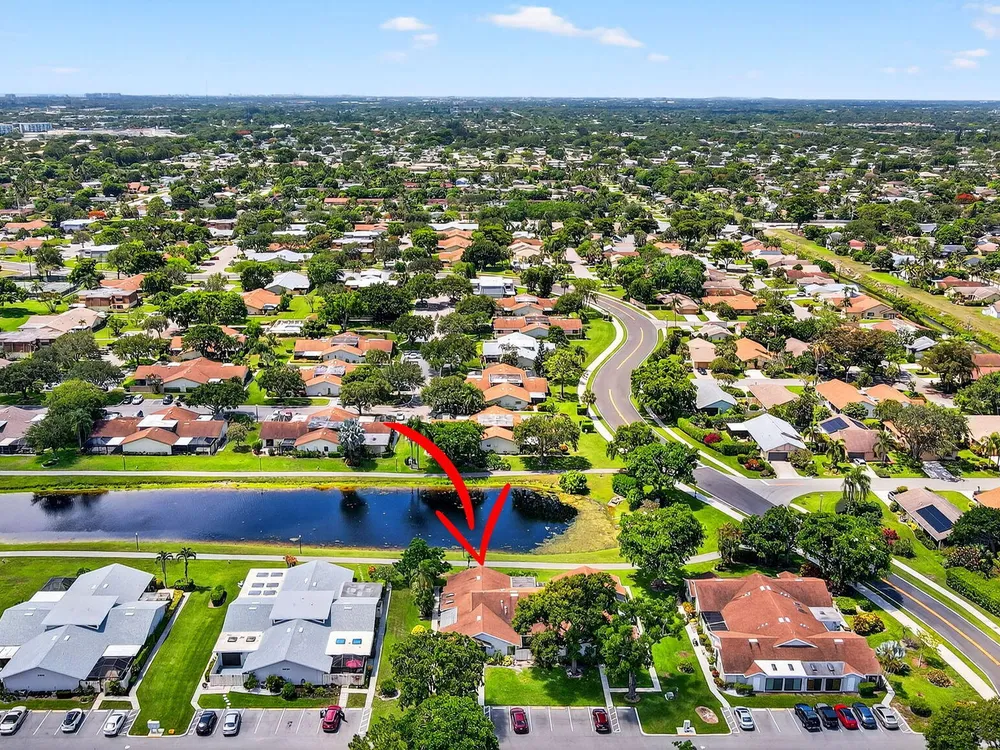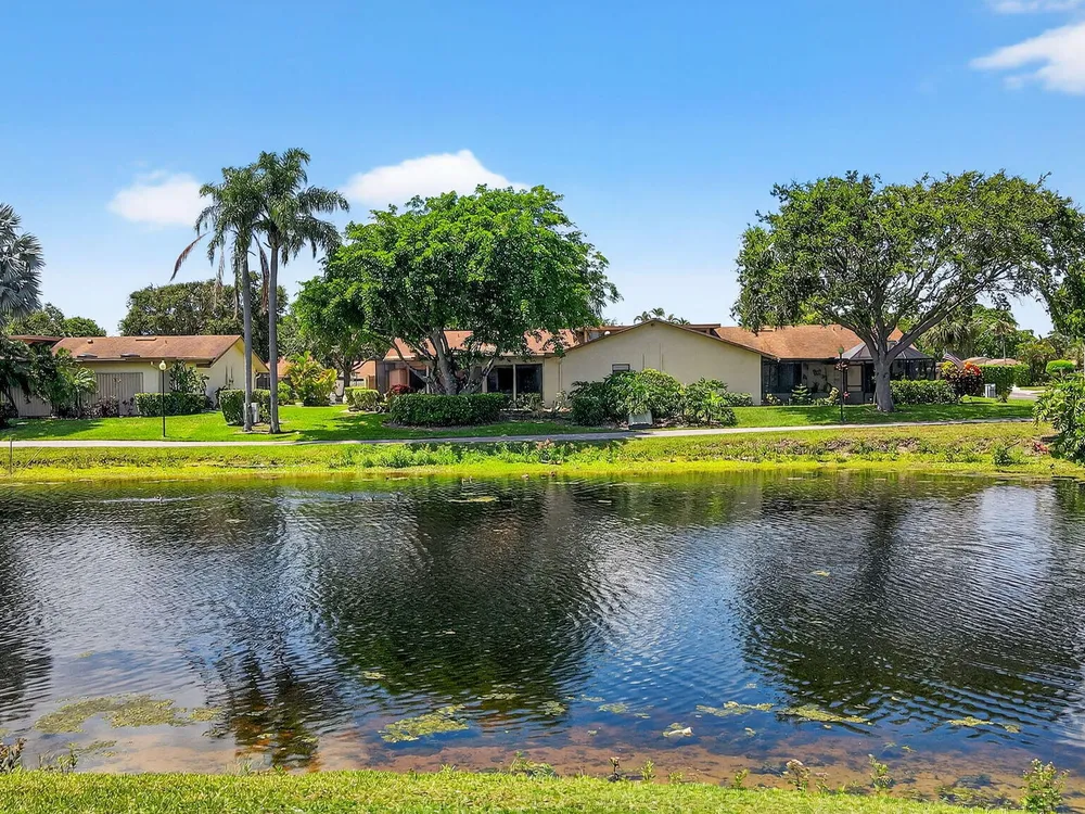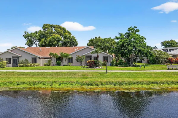 Beautifully situated on a tranquil LAKE, this spacious one-story, CORNER villa offers 2 bedrooms, 2 bathrooms, and a flexible den/home office. With over 1,600 sq. ft. of living space, the home is filled with natural LIGHT thanks to its desirable SOUTH-FACING exposure. Enjoy peaceful LAKE VIEWS from nearly every room. The OPEN-CONCEPT layout features a combined living, dining, and family area--ideal for entertaining. VAULTED CEILINGS create a bright, airy ambiance. The SPLIT FLOOR PLAN ensures privacy, and the enclosed Florida room offers a perfect space for a den, office, or additional lounge area. Located in the pet-friendly, man-gated community of Rainberry Bay, residents enjoy miles of scenic walking trails, many along beautiful lakes. Amenities include 5 heated pools, a theater, spa,