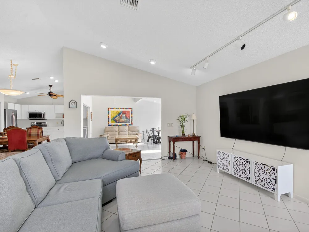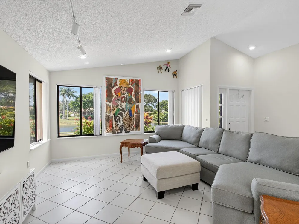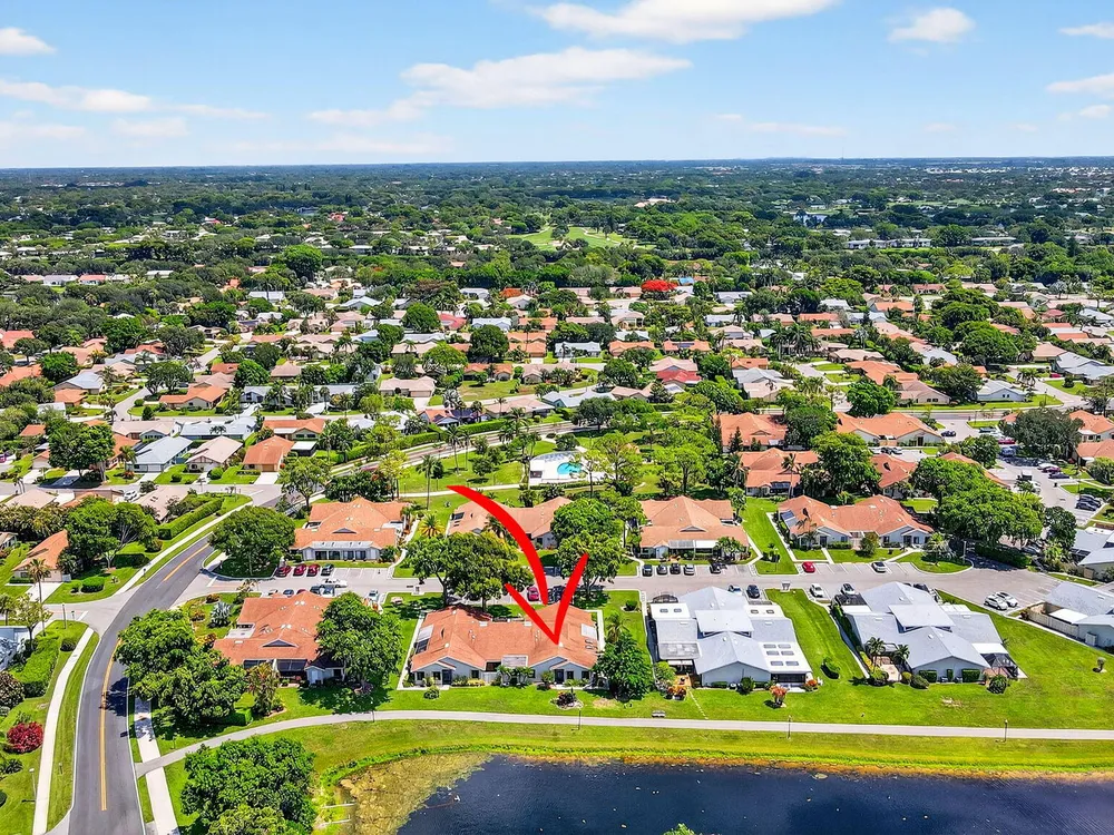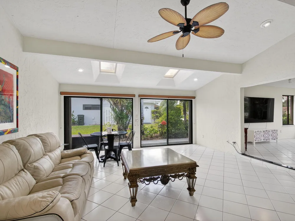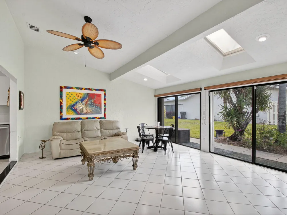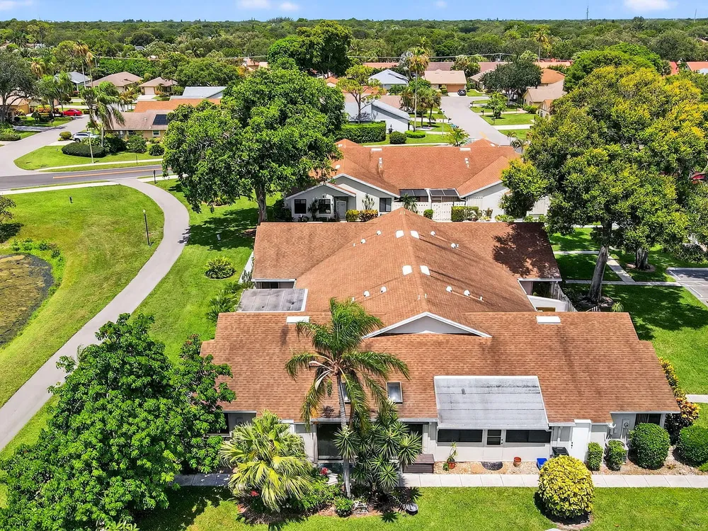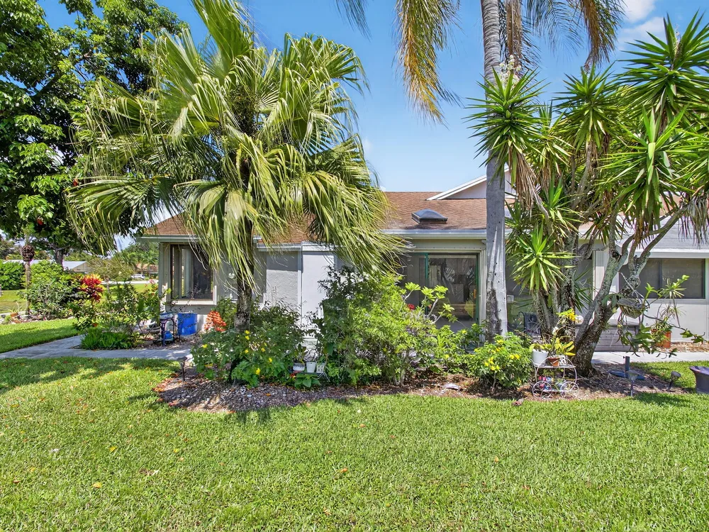 Beautifully situated on a tranquil LAKE, this spacious one-story, CORNER villa offers 2 bedrooms, 2 bathrooms, and a flexible den/home office. With over 1,600 sq. ft. of living space, the home is filled with natural LIGHT thanks to its desirable SOUTH-FACING exposure. Enjoy peaceful LAKE VIEWS from nearly every room. The OPEN-CONCEPT layout features a combined living, dining, and family area--ideal for entertaining. VAULTED CEILINGS create a bright, airy ambiance. The SPLIT FLOOR PLAN ensures privacy, and the enclosed Florida room offers a perfect space for a den, office, or additional lounge area. Located in the pet-friendly, man-gated community of Rainberry Bay, residents enjoy miles of scenic walking trails, many along beautiful lakes. Amenities include 5 heated pools, a theater, spa,
