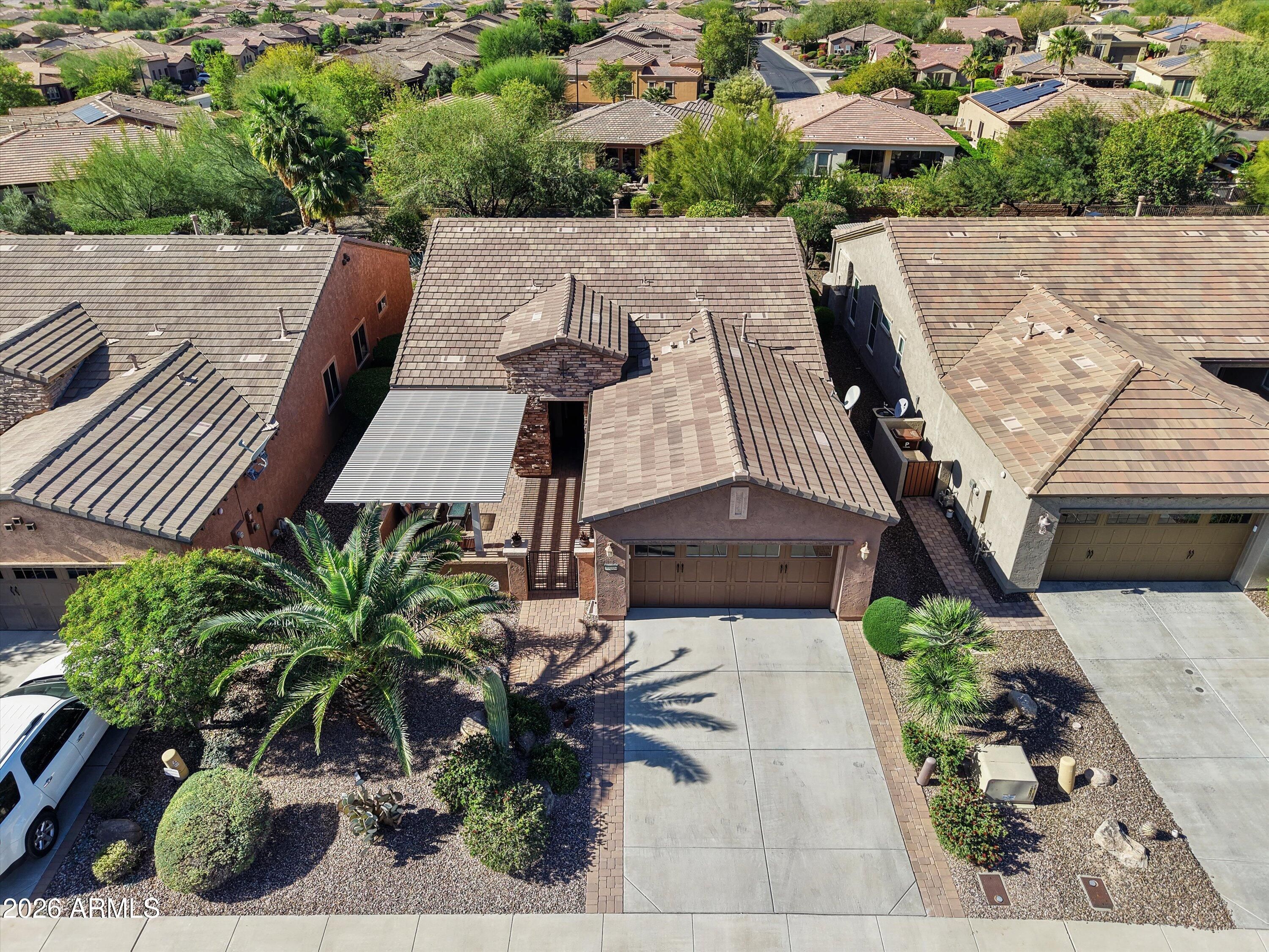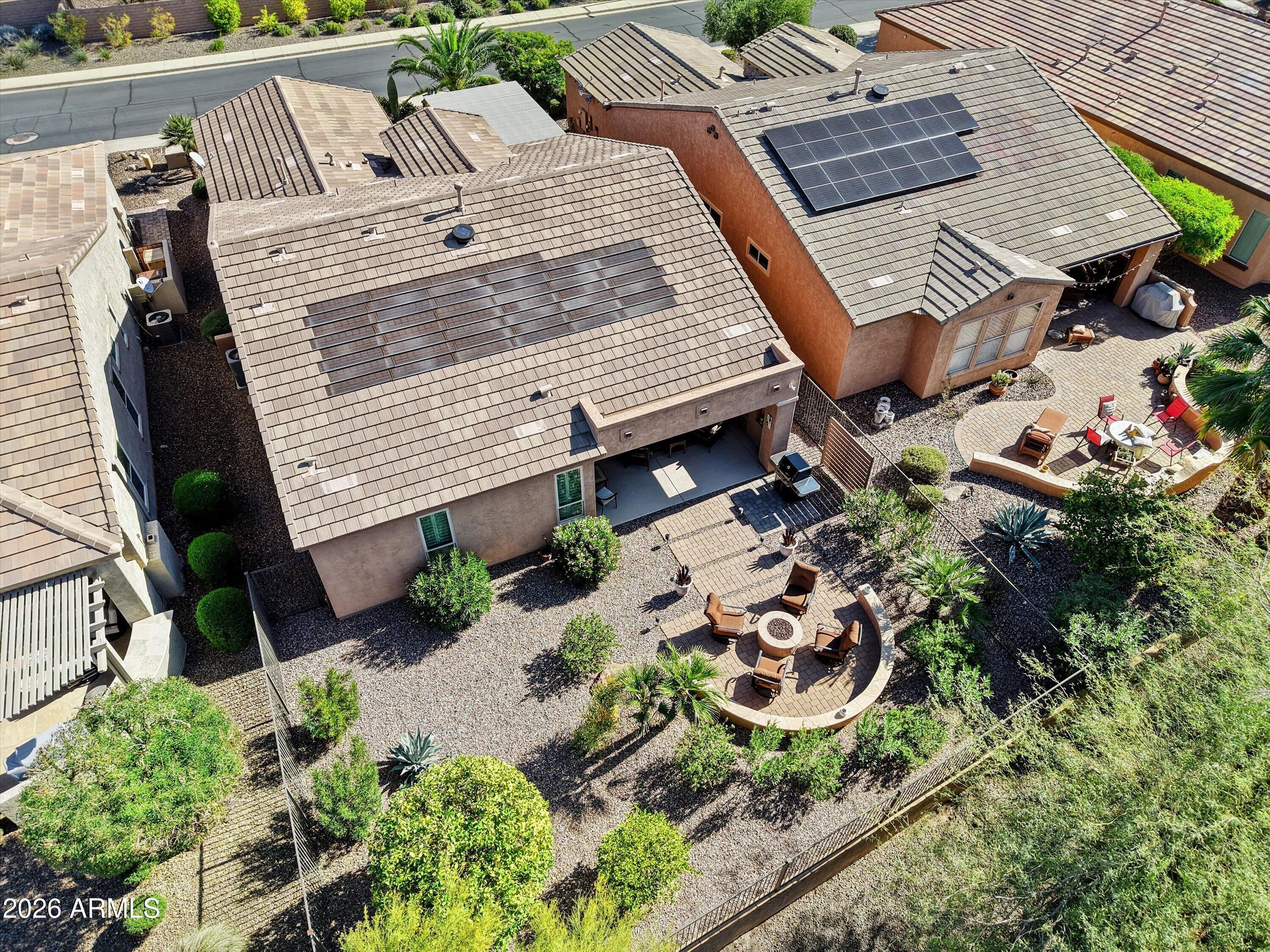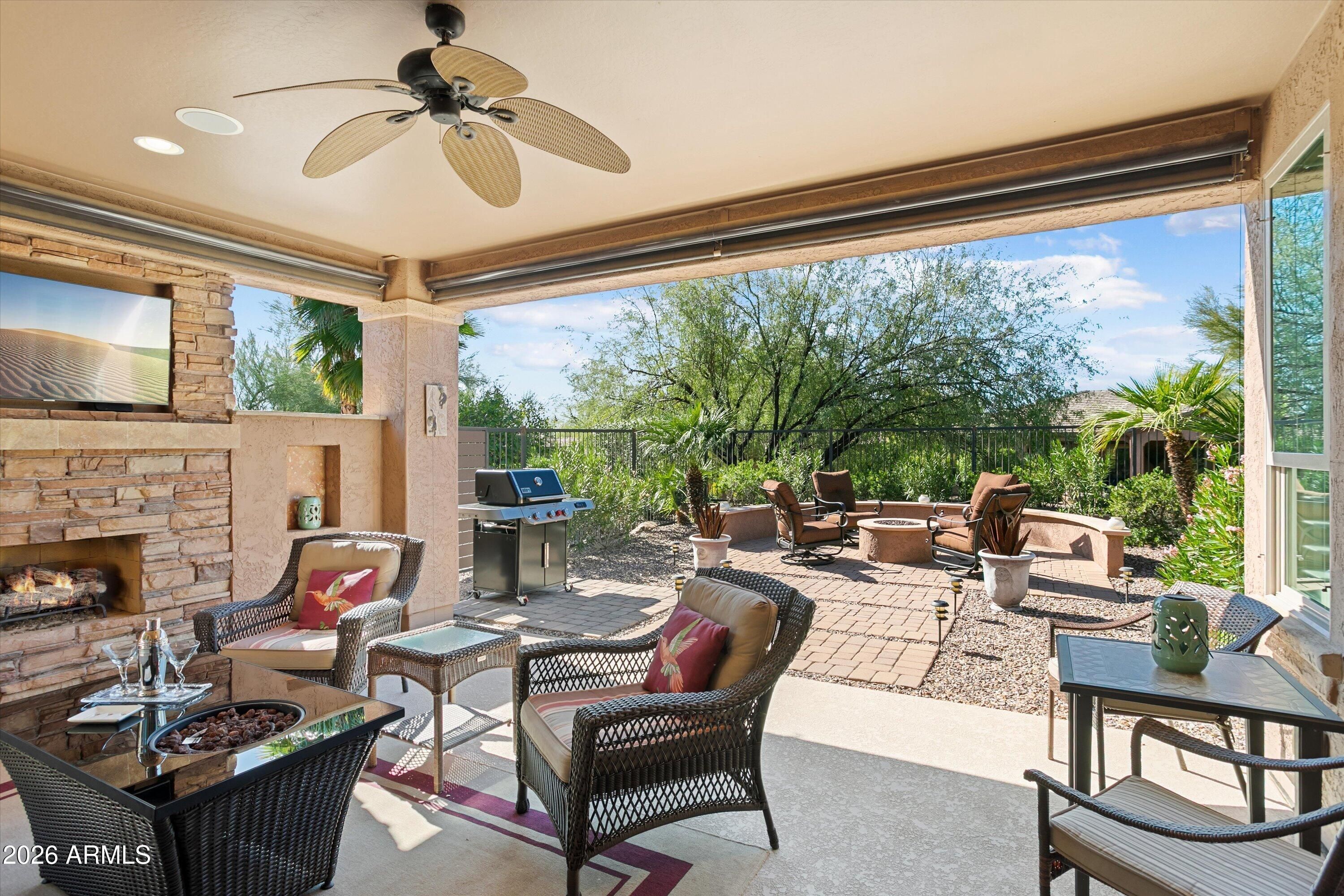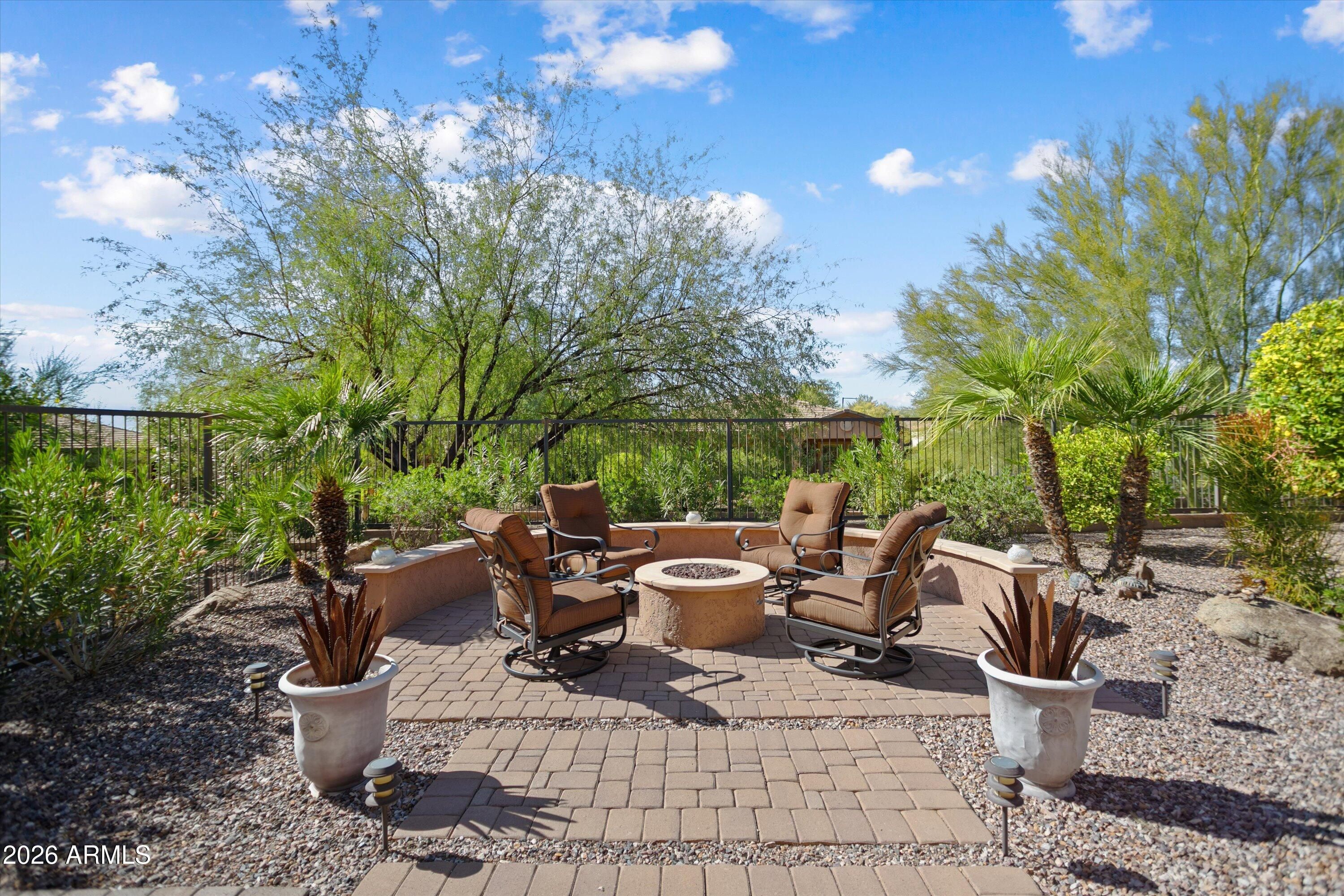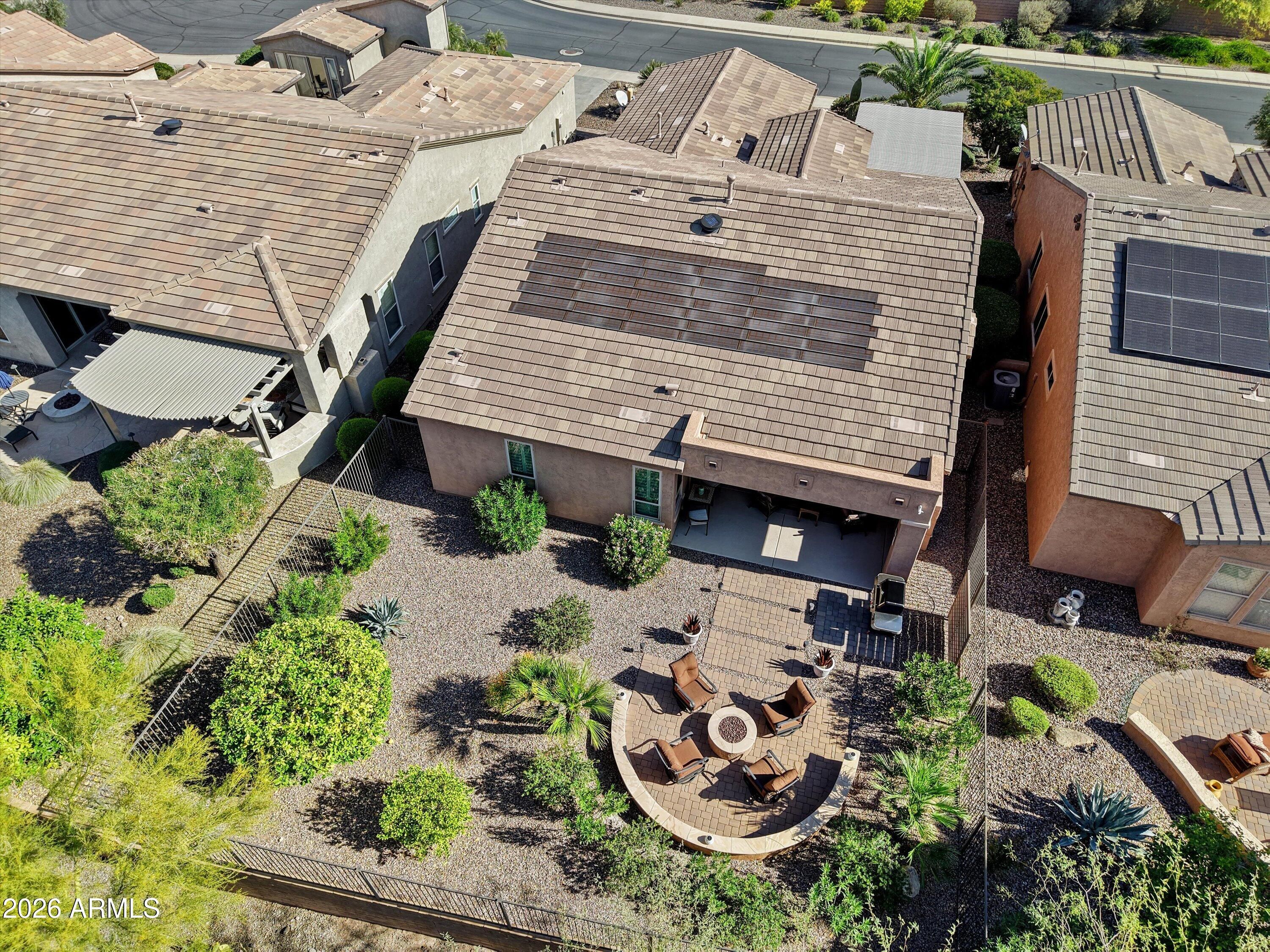 Beautifully situated on an elevated private cul de sac lot w/backyard overlooking a SERENE DESERT WASH. Exceptional indoor/outdoor living space., very close to MITA CLUB. Front 4 ft extended courtyard has pavers. pergola & sliding doors to upgraded eat-in kitchen including stone counters, custom peninsula brk/bar, staggered wood cabinet, roll outs and stainless appliances. Open concept grt room & dining area overlooks the magnificent backyard retreat. Den/office has French doors and built-in desk. Primary suite includes sliding doors to outdoor patio, walk-in custom closet, double sinks, granite counters & custom shower. The BACKYARD IS FULLY ENCLOSED W/WROUGHT IRON FENCING, extended paver patio, built-in 6 ft privacy wall, w/stack stone fireplace, TV, motorized sunscreens, built-in gas firepit. and lush mature landscape. Enjoy beautiful sunsets and outdoor living at its best! Garage has 4ft extension and epoxy flooring. This home has plantation shutters and surround sound. OWNED SOLAR OFFERED AS A TURN-KEY WITH MOST FURNITURE INCLUDED FOR $1.00 ON A SEPERATE BILL OF SALE. THIS HOME IS A MUST SEE!