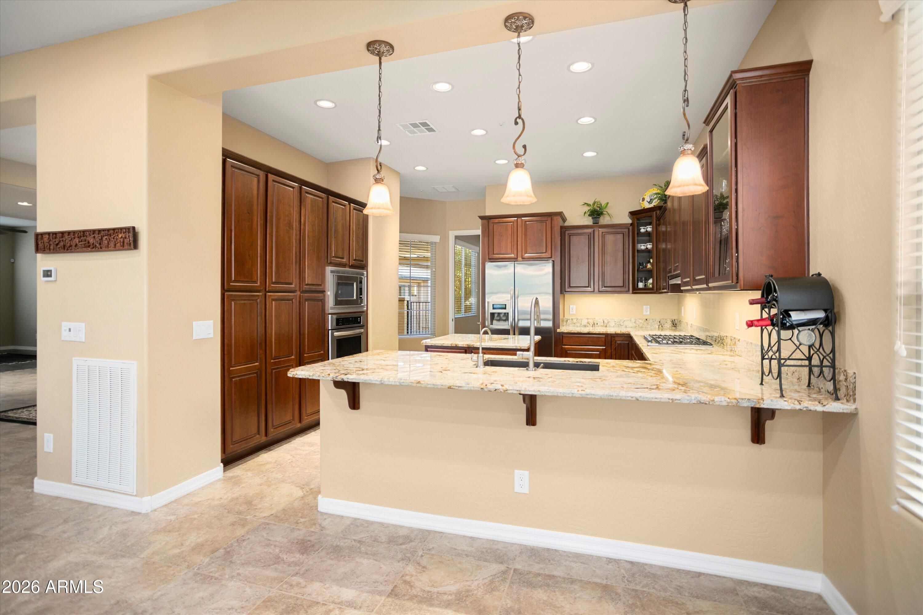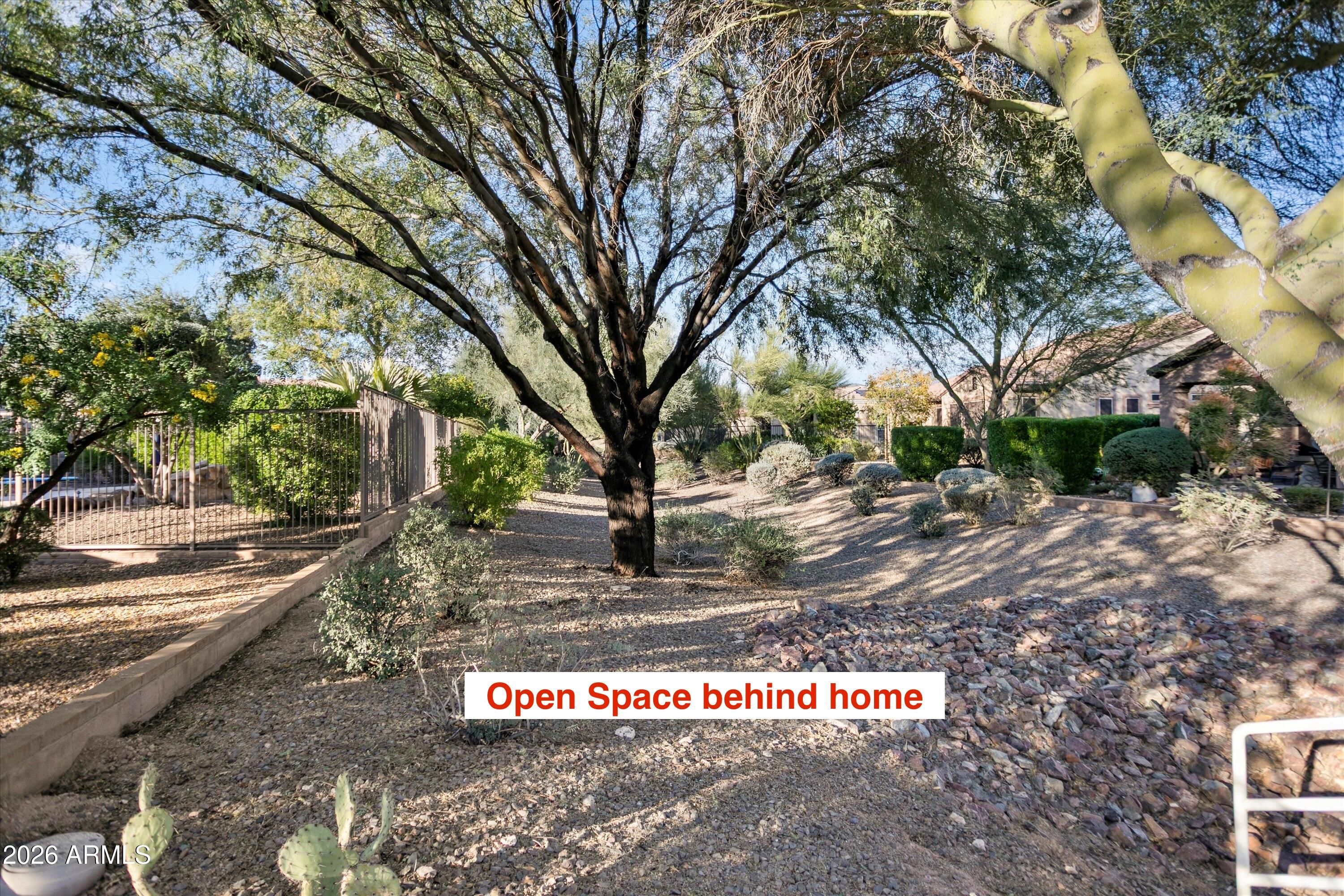 RARE FIND in Trilogy! This gorgeous SOLAR home sits on an OVER 1/4-ACRE corner lot on a cul-de-sac, backing to open space for exceptional PRIVACY. Enjoy incredibly low energy costs with average electric bills under $42/month! You will love the OPEN CONCEPT LIVING offered in this thoughtfully designed 2bd/2.5ba floorplan + den/office, dining room, bonus room, and coveted 2.5-CAR GARAGE. Enter through the enclosed front courtyard into a light-filled GREAT ROOM overlooking the expansive backyard. The SPACIOUS great room features a stacked stone media wall, 10-ft ceilings, dining area, and a cozy fireplace—perfect for cool desert evenings. Neutral tile flows throughout the main living areas, complemented by wood-look plank tile in the bedrooms and den for easy maintenance. The GOURMET KITCHEN impresses with premium granite countertops, GAS COOKTOP, bar seating, center island, stainless steel appliances, pendant lighting, and an abundance of upgraded cherry cabinetry, including rollouts. A versatile BONUS ROOM off the kitchen adds even more flexibility. The tranquil primary suite offers backyard views and a private exit to the patio, along with a spacious walk-in shower, dual sinks, and an oversized walk-in closet. The den/office features a built-in bookcase and Murphy bed cabinet, ideal for overnight guests. The ensuite guest bedroom is split from the primary for privacy. The split 2.5-CAR GARAGE includes epoxy floors and plenty of space for a golf cart or toys. Step outside to your EXPANSIVE, PRIVATE BACKYARD SANCTUARY-fully fenced and designed for both relaxation and entertaining. Enjoy an extended covered paver patio, built-in BBQ, gas firepit, and a soothing hot tub, all set against a peaceful backdrop. This home is TRULY SPECIAL and a must-see for those seeking EXCEPTIONAL indoor-outdoor living in Trilogy. Located within the award-winning, gated 55+ Trilogy at Vistancia, this home offers access to an unparalleled lifestyle enriched by world-class amenities. Residents enjoy the spectacular 35,000 SF Kiva Club, featuring indoor and outdoor pools, a state-of-the-art fitness center, day spa, café, billiards, meeting rooms, library, tennis courts, pickleball, bocce ball, and an impressive calendar of social events and activities. The championship golf course designed by Gary Panks gracefully meanders throughout the community, offering breathtaking scenery and exceptional play. The Mita Club provides additional resort-quality amenities, expanding the opportunities for recreation and connection. Trilogy's prime location offers convenient access to the 303 freeway, shopping, dining, entertainment, Lake Pleasant, and Paloma Park-packed with outdoor amenities and recreation. This extraordinary community delivers a luxurious, vibrant, and active lifestyle unlike any other.