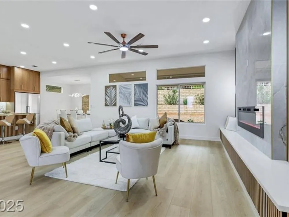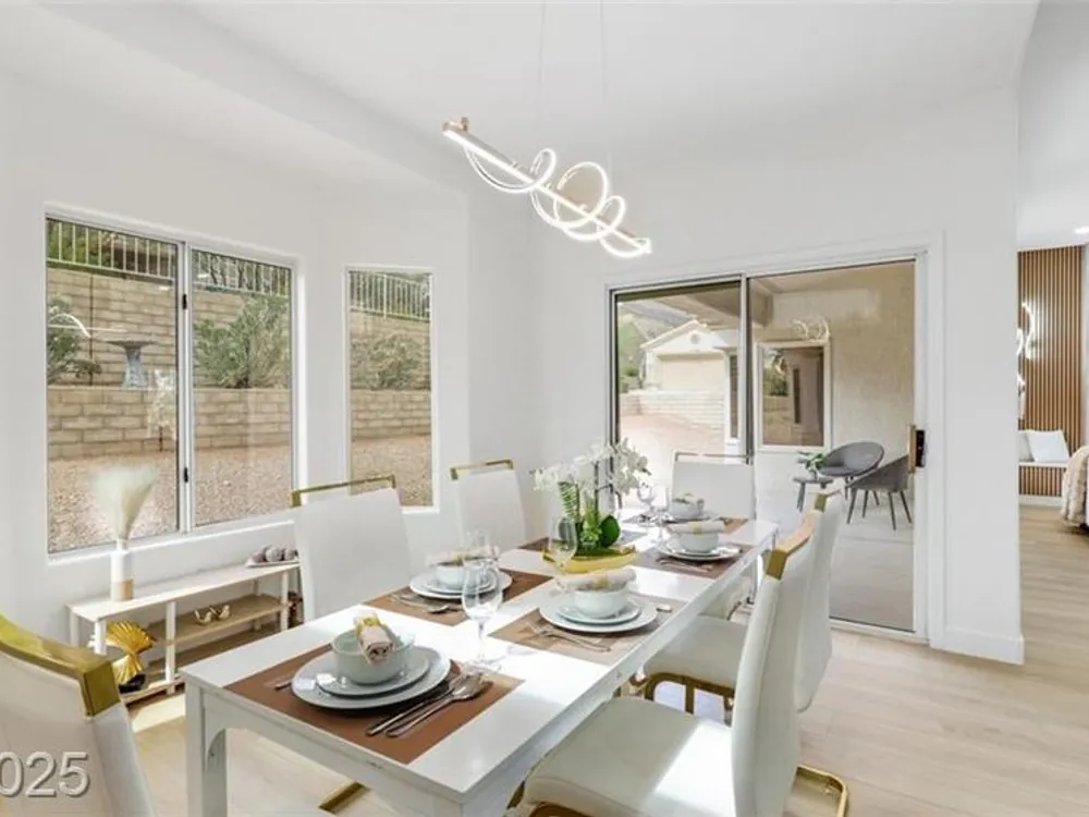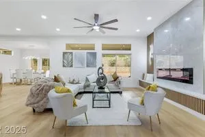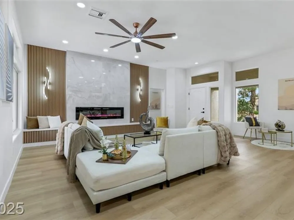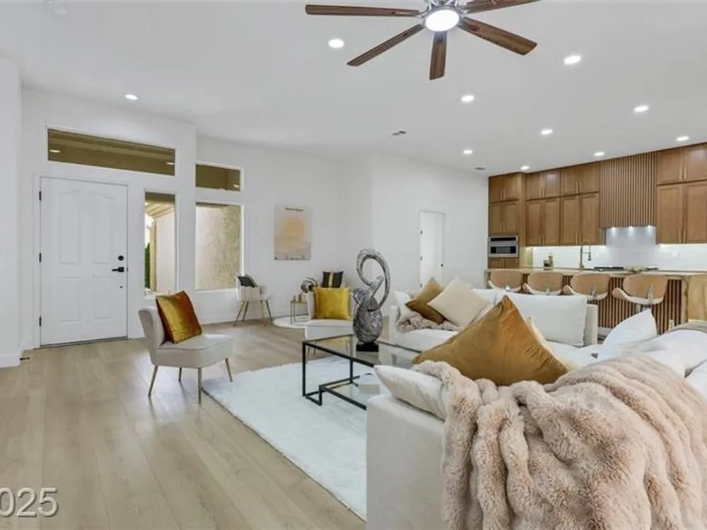 This updated single-story at 3013 Abercorn Dr sits right in the heart of Sun City Summerlin, offering afresh, move-in-ready feel in one of the community’s most convenient spots. Inside, you’ll find a bright,open layout with fresh finishes, new flooring, and a gourmet kitchen that shines with custom porcelaincounters and stainless steel appliances. Both bathrooms have been tastefully remodeled with uniquelyelegant finishes. Enjoy low-maintenance living in this 55+ community with golf, pools, fitness centers, andendless social activities just around the corner. You’re also only a short drive to shopping, dining, and theLas Vegas Strip. All furniture included!