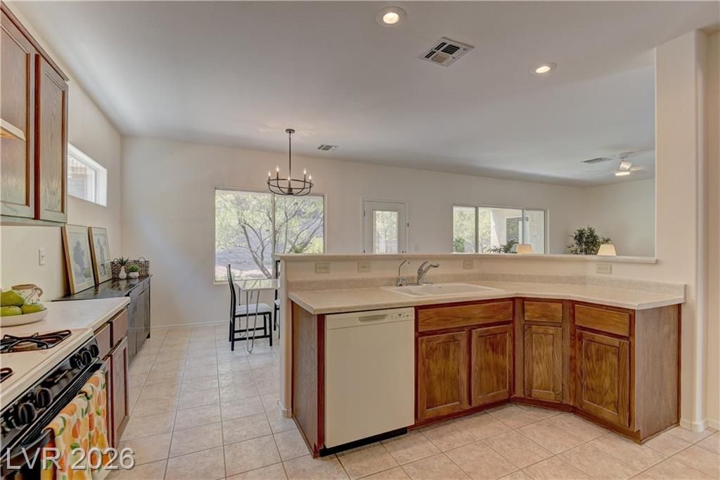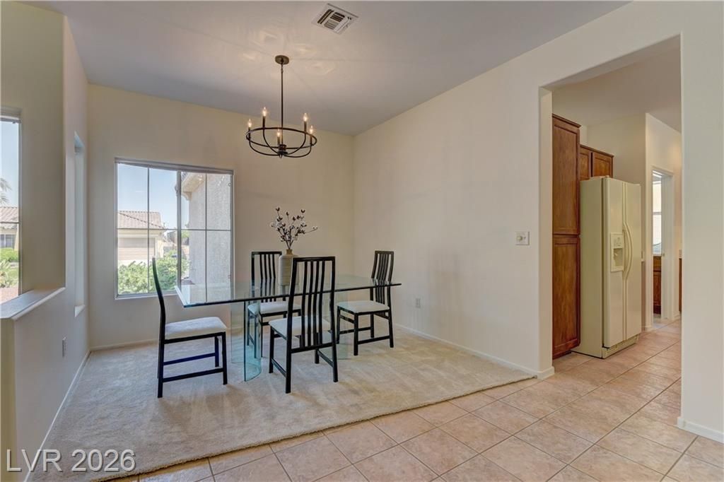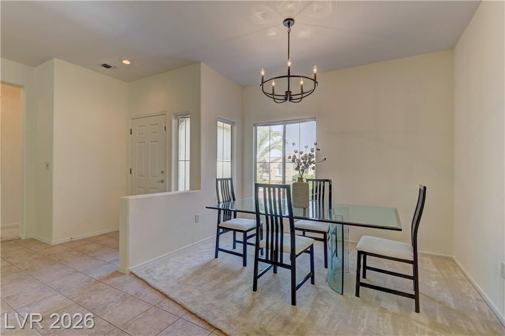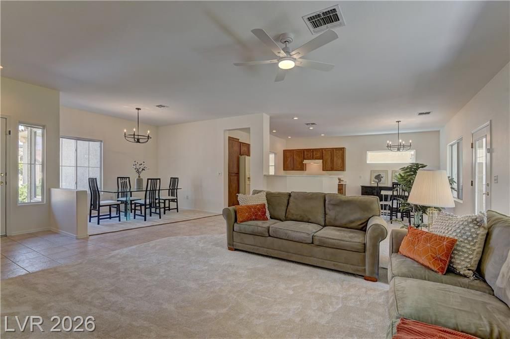 Single-level living w/a modern, open layout that seamlessly connects the kitchen, dining, & living room. This home offers spacious living filled w/natural light. The kitchen features an eat-at bar for easy entertaining, along w/ample workspace & storage. The primary includes an ensuite bathroom, walk-in shower & walk-in closet. Enjoy the covered patio & backyard w/green turf for low-maintenance living. Interior highlights - tile flooring & plush carpet throughout, a versatile laundry/hobby room w/a built-in desk. 2024 upgrades include new interior paint, carpet & pad, water heater, dishwasher, bathroom faucets, guest bath sink, and updated light fixtures and fans. The garage floor & driveway power washed, & the A/C was serviced in July 2024. Major systems updated, including a newer furnace, A/C, and water filtration system (2021). Located in award-winning 55+ Sun City Anthem, offering 3 clubhouses, 2 restaurants, 2 golf courses, pools, tennis, pickleball, & endless activities.
