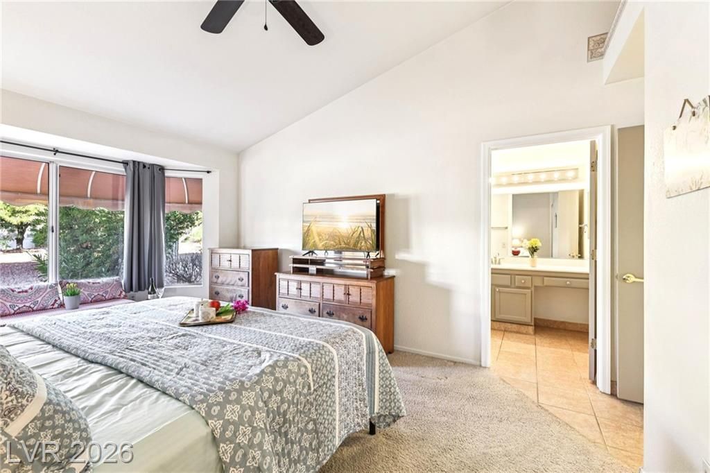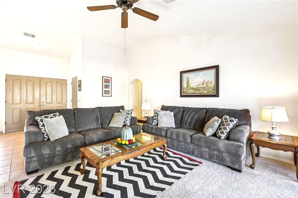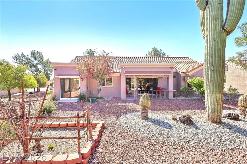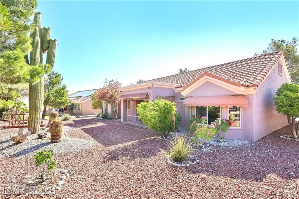 ABSOLUTELY, This is the one! -- SFR 2/2/2 with Golfcart parking & Side Entry in Garage -- Mostly Tiles throughout the house-- SPACIOUS Breakfast/Nook with EXTRA sliding door, Office/Hobby Room with Sink. Enjoy well-planted Fruit Trees & Desert Landscaping e.g. Apricots, Pomegranates, Mini-Vineyard/Garden.-- GIANT Saguaro & Joshua-- Peaceful Surroundings-- Cute Wild Rabbits Hop Around-- Feature of Natural Gas Line coming out of the house at Patio for Future BBQ (Great $ Value)-- Custom Railings at Patio-- Square Feet built is shown in County Tax Assessor-- Easy to Maintain Landscaping--Tons of activities to Inspire Your NEW Lifestyle at 55+ Active Adults Sun City Summerlin- NOTE: Close of Escrow to to be after 5/1/2026 (lease ends 4/30/26). READ Agent Remarks for more Info. Discl: owner-licensee