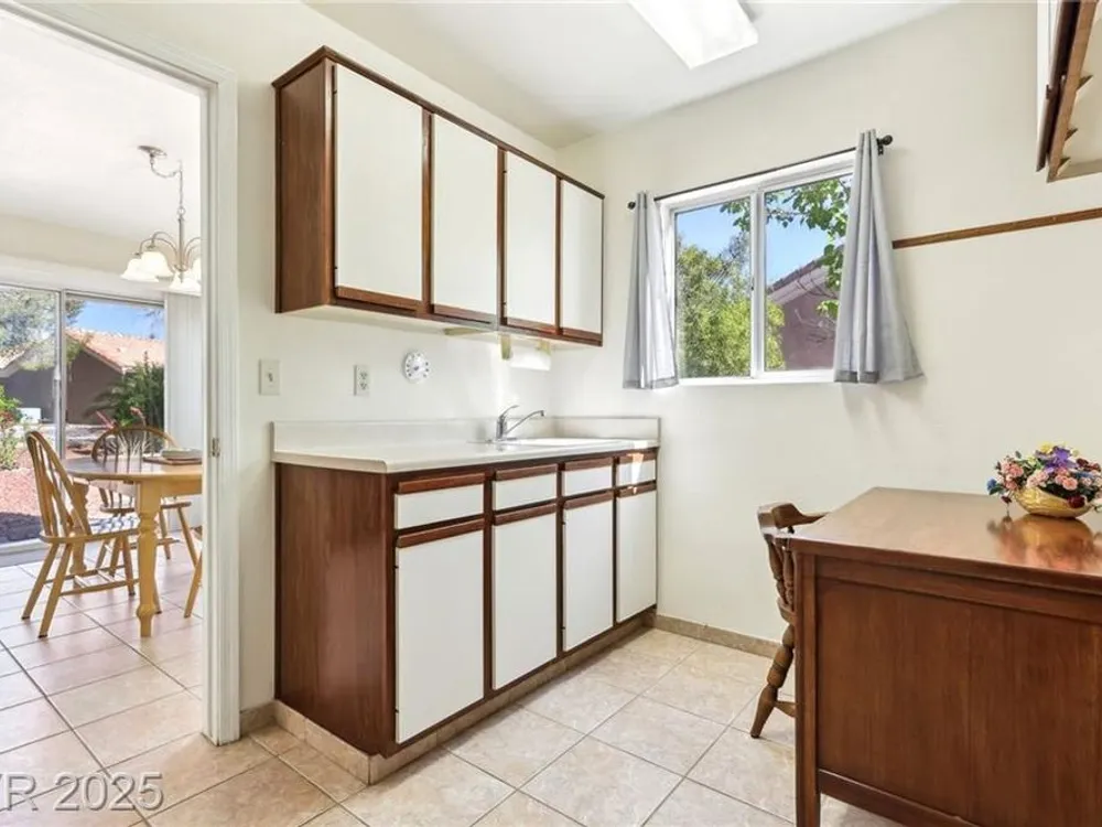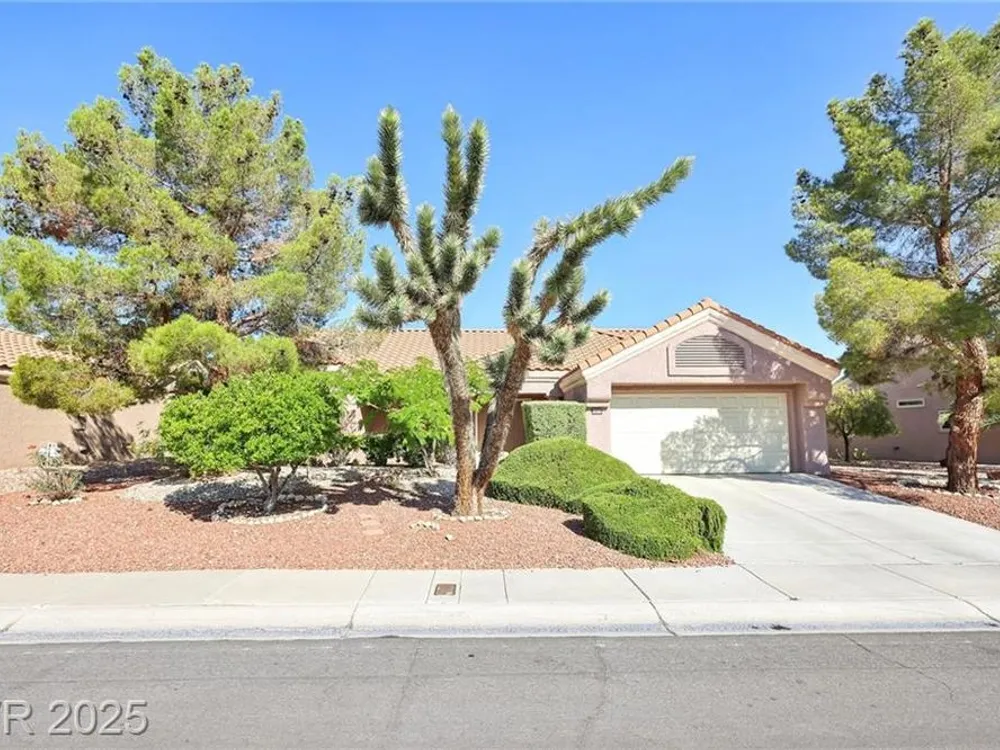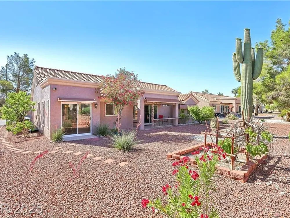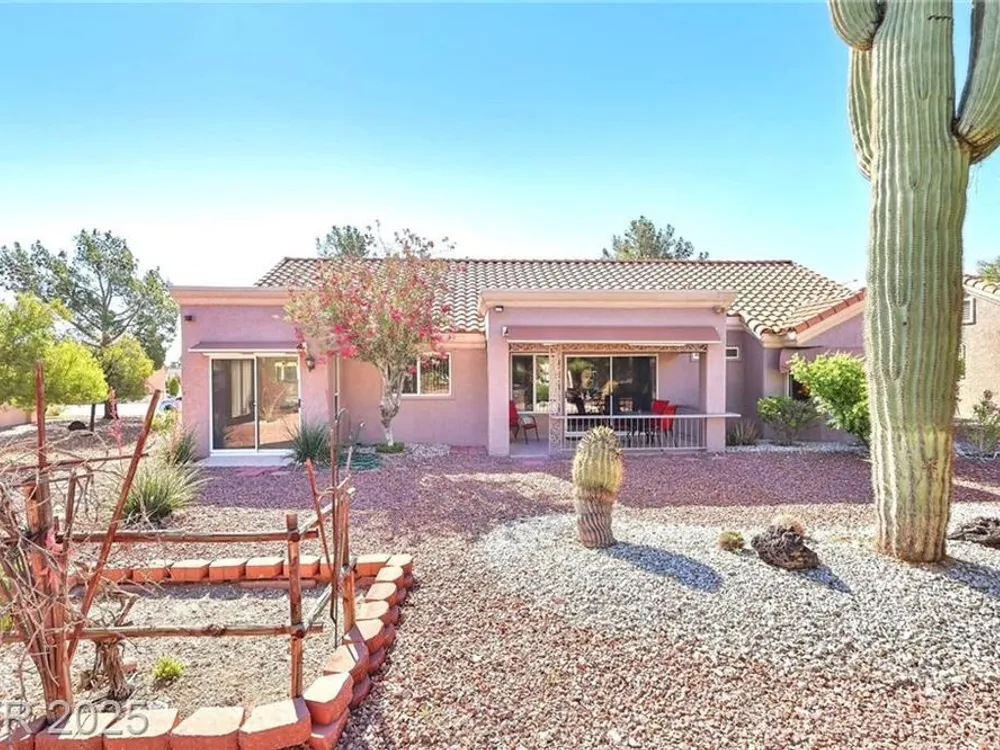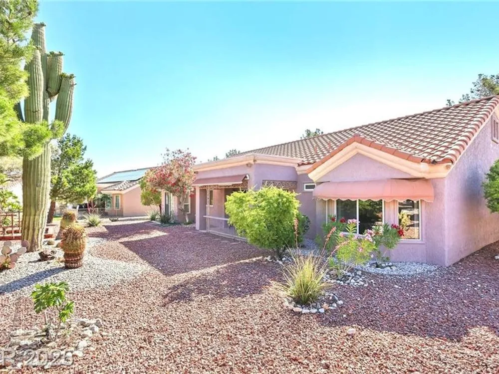 SFR 2/2/2 w/space for Golf cart parking in garage. Come! Spread your wings to the flow of TILES path from Hallway to Kitchen, to Office/Hobby Room with Sink, and mostly Tiles Throughout the house. SPACIOUS Almost 1,400 sq.ft. with EXTRA Sliding Door from Kitchen/Nook & Another Access Door into Garage. Square Feet built is shown in County Tax Assessor. Fully Equipped with all GOOD Things, including Fruitful & Desert Landscaping e.g. Apricots, Pomegranates, Lilac, growing Fig Tree, Mini-Vineyard/Garden. GIANT Saguaro & Joshua. Peaceful Surroundings. Cute Wild Rabbits Hop Around. Feature of Natural Gas Line coming out of the house at Patio for Future BBQ (Great $ Value). Custom Railings at Patio & Awnings. This is 55+Sun City Summerlin. Discl: Owner-Licensee.
