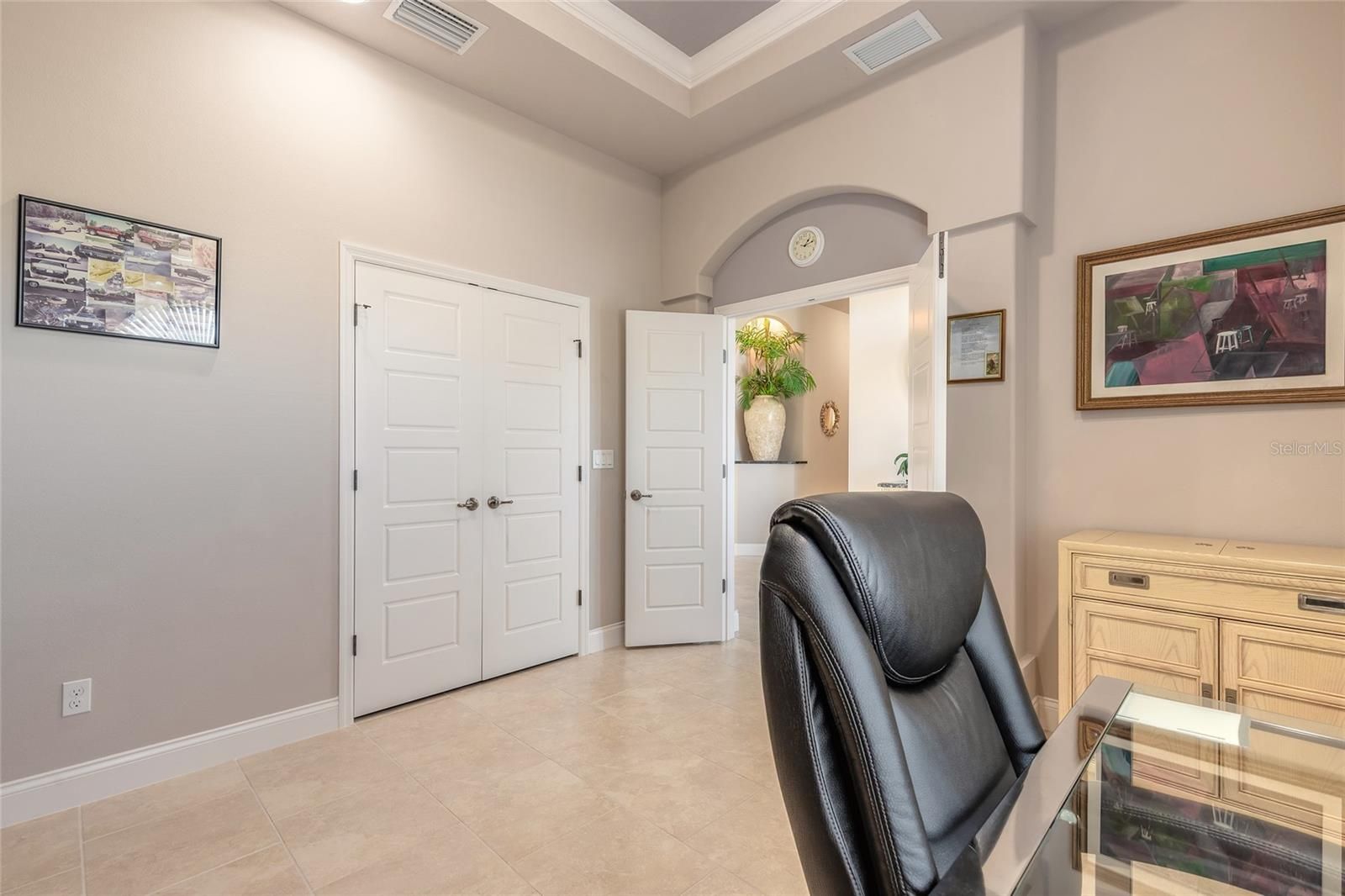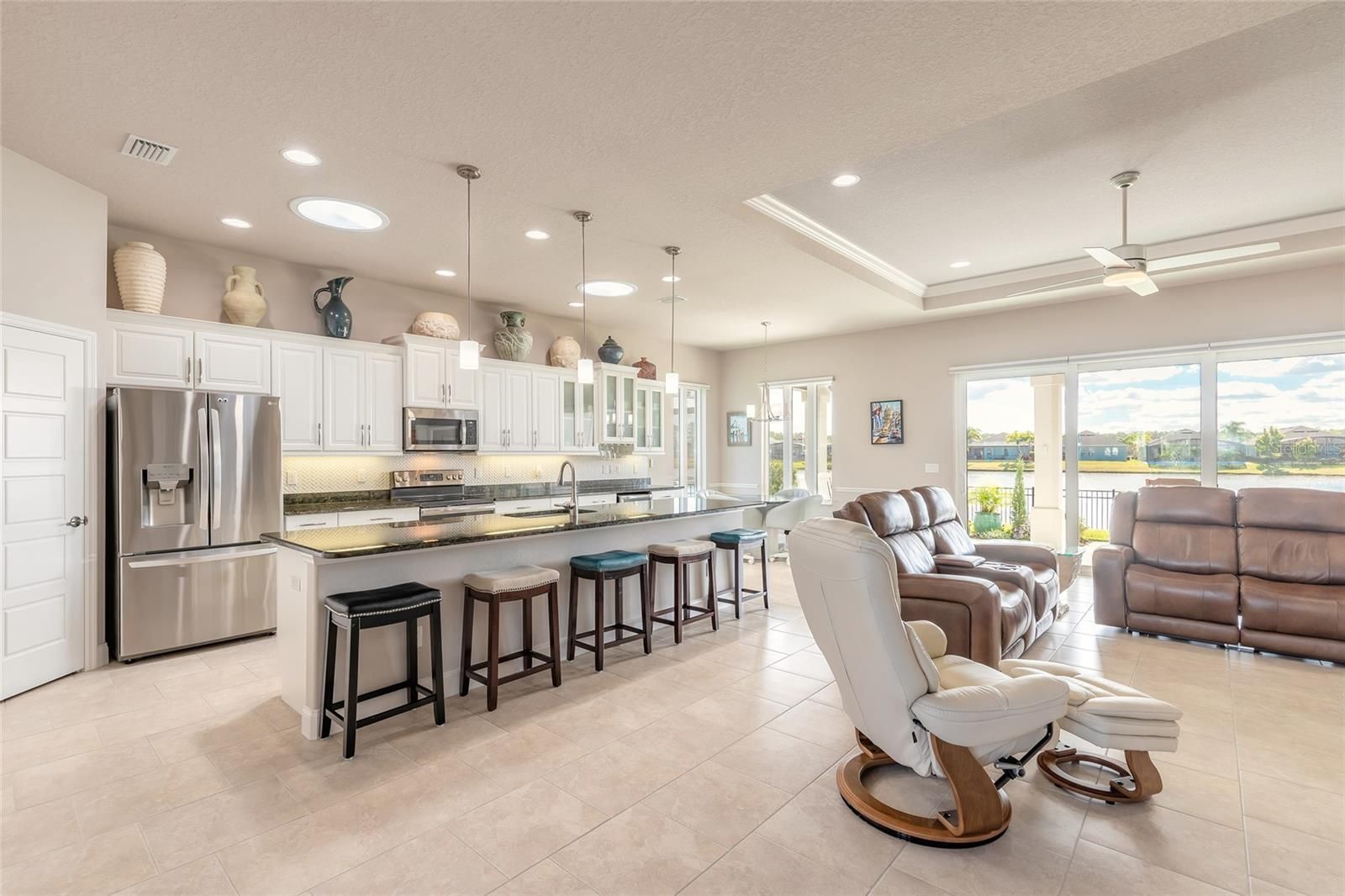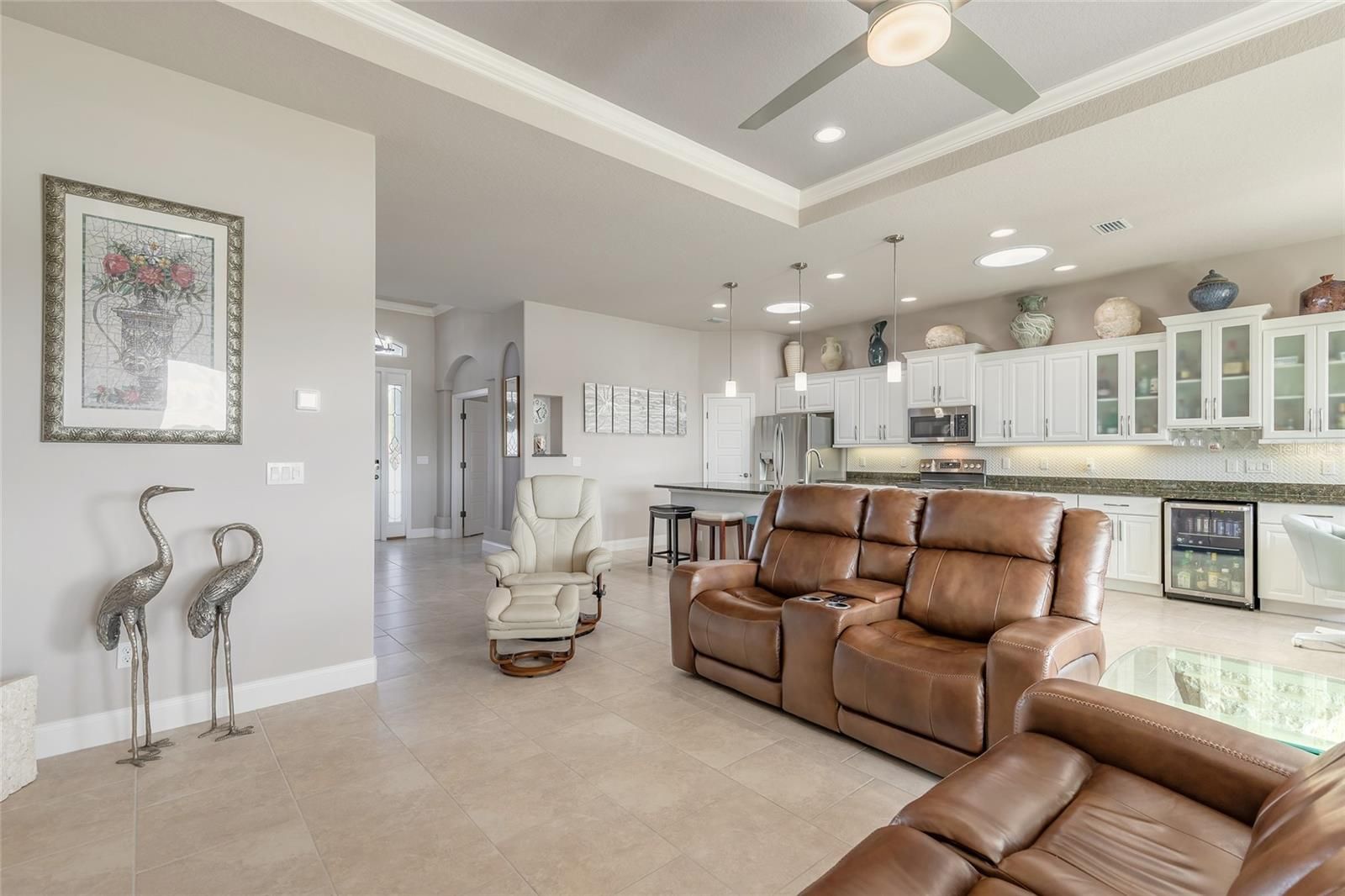 This custom modern 2020 Paytas-built home seamlessly blends beauty and functionality from the moment you arrive. A paver driveway, decorative glass front door, and professionally designed landscaping create exceptional curb appeal and a welcoming first impression. Inside, this spacious 4-bedroom, 2-bath residence is thoughtfully designed and truly move-in ready. Six sun tunnels throughout the kitchen, bathrooms, laundry room, and garage fill the home with abundant natural light. The oversized covered lanai provides the perfect setting for relaxing or entertaining while taking in peaceful waterfront views. You’ll appreciate the attention to detail throughout, including 10-foot recessed ceilings accented with 5¼-inch crown molding in the foyer, living room, office, and primary bedroom. Added recessed lighting enhances the kitchen, living room, and primary bath. The kitchen features granite countertops and was extended an additional six feet to include a custom built-in service bar, ideal for entertaining. Power window coverings in the living and dining rooms, along with additional window treatments in the office and primary bedroom, plus ceiling fans, are all included. Garage enthusiasts will be impressed by the three-bay garage (20' x 33'4") with oversized insulated doors (18' and 9' wide, 8' tall). The garage is equipped with a split air-conditioning system, sun tunnel, wash sink, and hybrid water heater, making it as functional as it is impressive. As part of Venetian Bay – The Palms, you’ll enjoy access to pickleball and tennis courts, a basketball court, miles of scenic trails, and a vibrant town center featuring a market, restaurant, spa, coffee shop, and fitness center. Golf enthusiasts will love the 18-hole championship golf course and clubhouse. All of this is just minutes from Canal Street Historic District, Flagler Avenue, and the beautiful beaches of New Smyrna Beach. All information is intended to be accurate, however not guaranteed.
