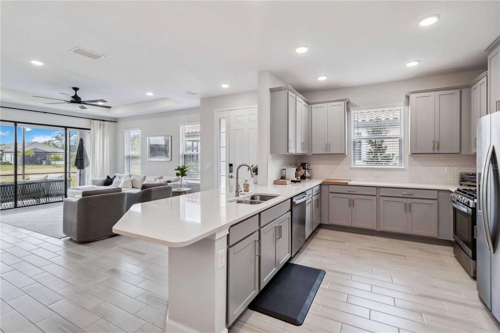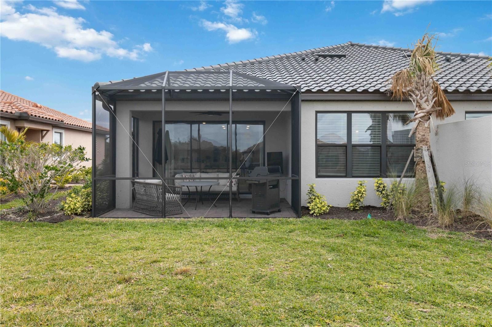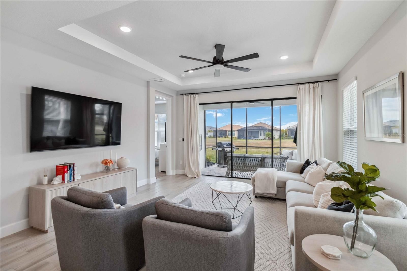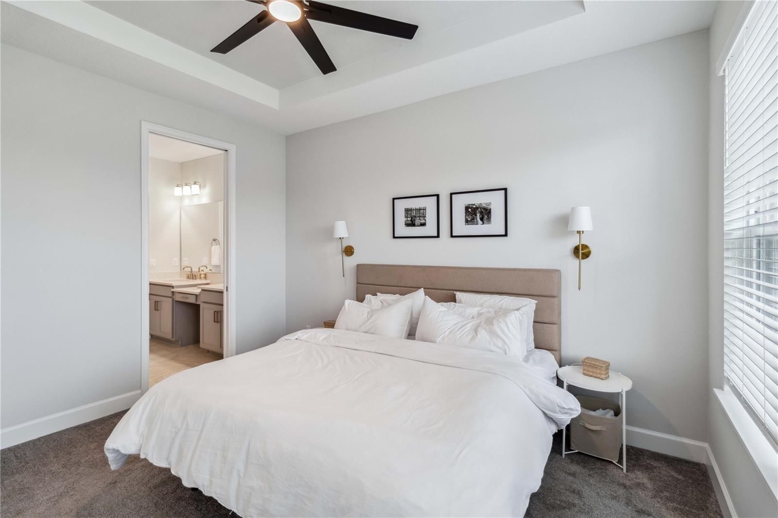Live smart. Play often. Relax always. Esplanade at Azario, where resort-style amenities and breathtaking lake views await. Situated on a premium waterfront lot, this beautifully upgraded villa offers an open and inviting layout, perfect for full-time, seasonal, or investment opportunities. Inside, plank tile flooring, tray ceilings and natural light create a warm and inviting open living space. The gourmet kitchen features stainless steel appliances, grey shaker cabinets, and versatile white tile backsplash, seamlessly flowing into the dining and living areas. Triple sliding glass doors open to an oversized lanai, where you can relax and enjoy serene water views. The primary suite is a peaceful retreat with expansive windows, a spa-like ensuite with dual sinks, vanity area, a walk-in shower, and a spacious closet. A private guest suite, versatile den with pocket doors, and a well-equipped laundry room add to the home’s functionality. Enjoy world-class amenities, including a resort-style pool, full-service spa, fitness center, Bahama bar, and an 18-hole championship golf course. The Culinary Center offers fine dining, wine tastings, and cooking classes, while The Venue hosts community events and clubs. Located in Lakewood Ranch, just minutes from A-rated schools, shopping, dining, and Gulf Coast beaches, this home is a perfect blend of luxury and investment potential. Don’t miss this incredible opportunity! This home presents a fantastic investment and is currently leased to November2025.