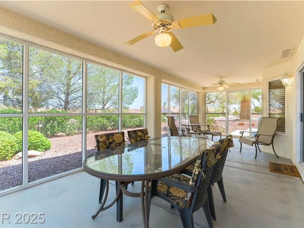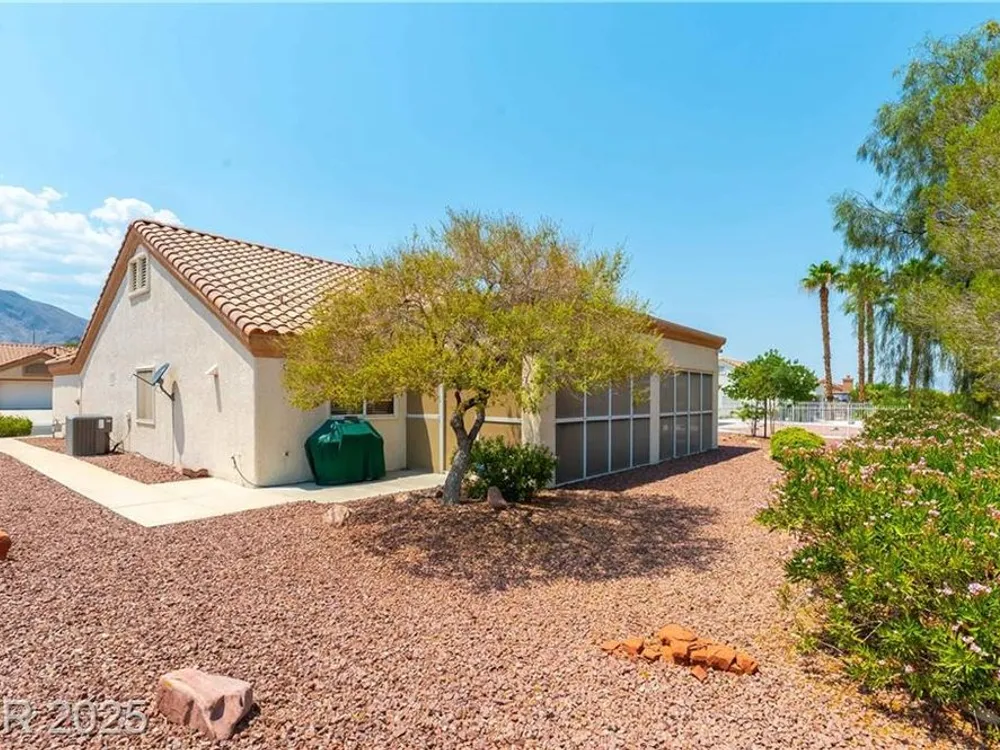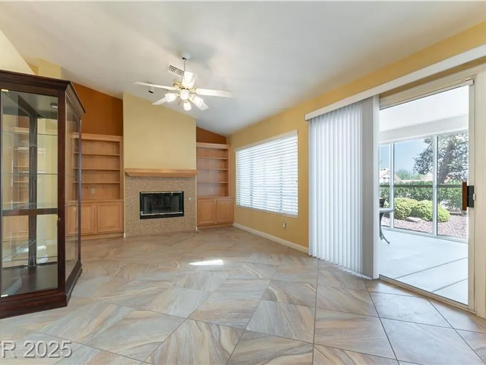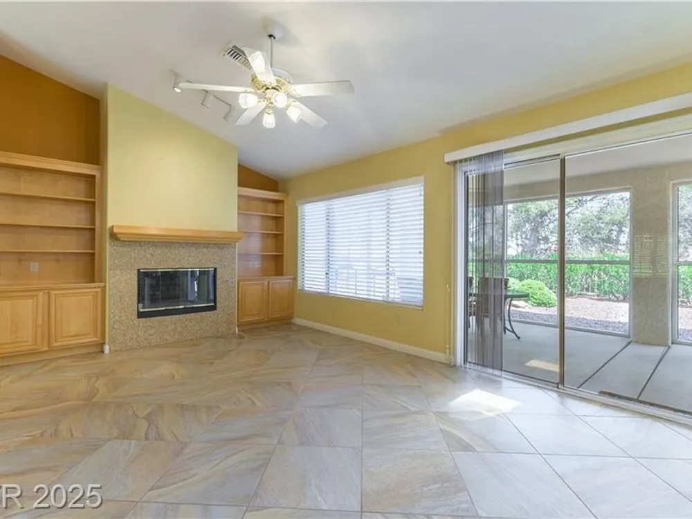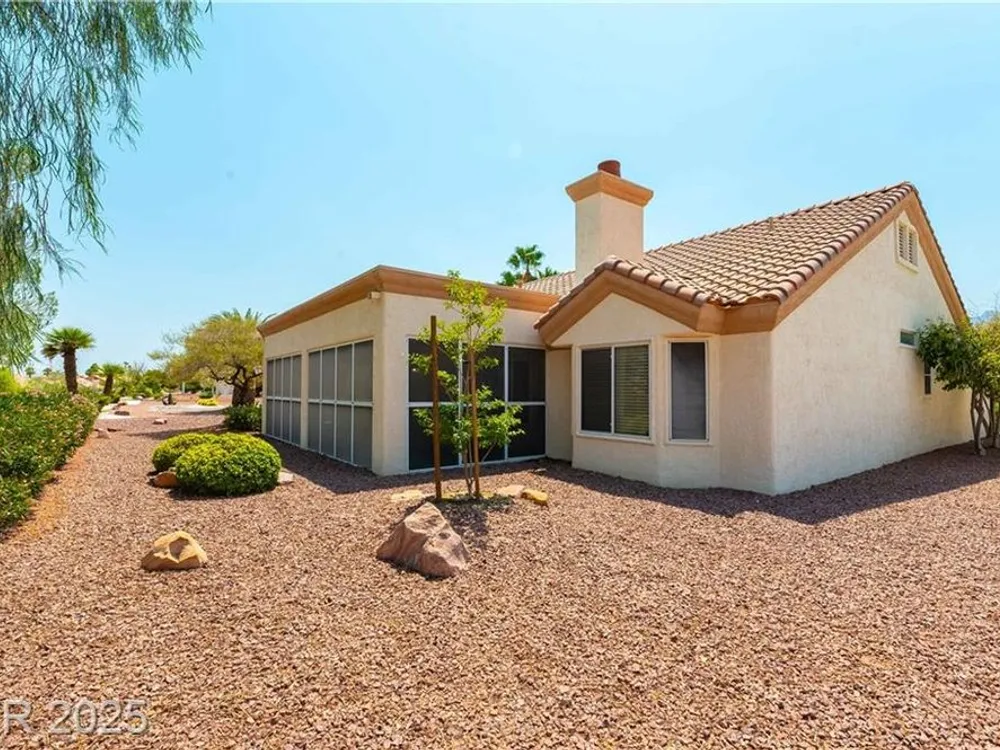 Discover the ultimate in active 55+ living in the heart of Sun City Summerlin! This expanded 1,808 sq ft Silverton home offers 2 spacious bedrooms plus a versatile 3rd room—perfect as an office or guest space. Enjoy 1 full bath and a 3/4 bath, a bright Nevada room with built-in shelves and a cozy gas fireplace, and a large screened-in porch facing east—ideal for morning coffee or relaxing evenings. The kitchen features granite countertops, a built-in oven, a microwave, and a gas cooktop. Ceiling fans throughout keep the space cool, and desert landscaping ensures easy maintenance. The extended 2-car garage with golf cart parking adds space and convenience, with a sewer dump at the driveway for RV owners. Located in a vibrant 55+ community offering golf courses, fitness centers, pools, clubs, and more. Don’t miss this beautifully upgraded home in one of Las Vegas’ most desirable communities! New paint in the living room and Nevada room, and new carpet in the primary bedroom.